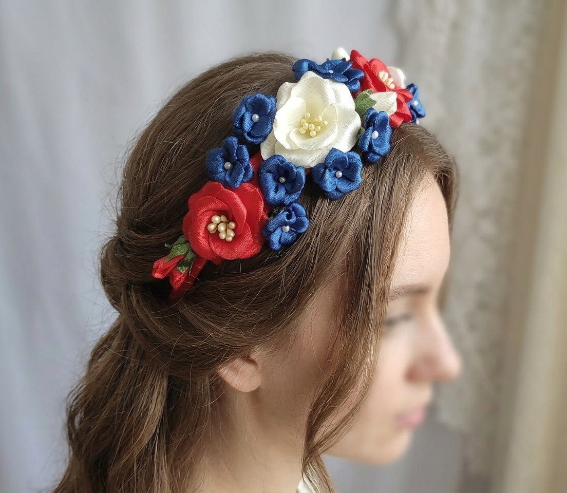 Kovová čelenka je starostlivo ovinutá saténovou stuhou do pravidelného vzoru a zdobená tromi aplikáciami zo saténových kvetov. Aplikácie sú navlečené tak, aby sa dali jednoducho zamieňať podľa nálady alebo outfitu –navyše ich môžete použiť samostatne ako ozdobu na pinetke.