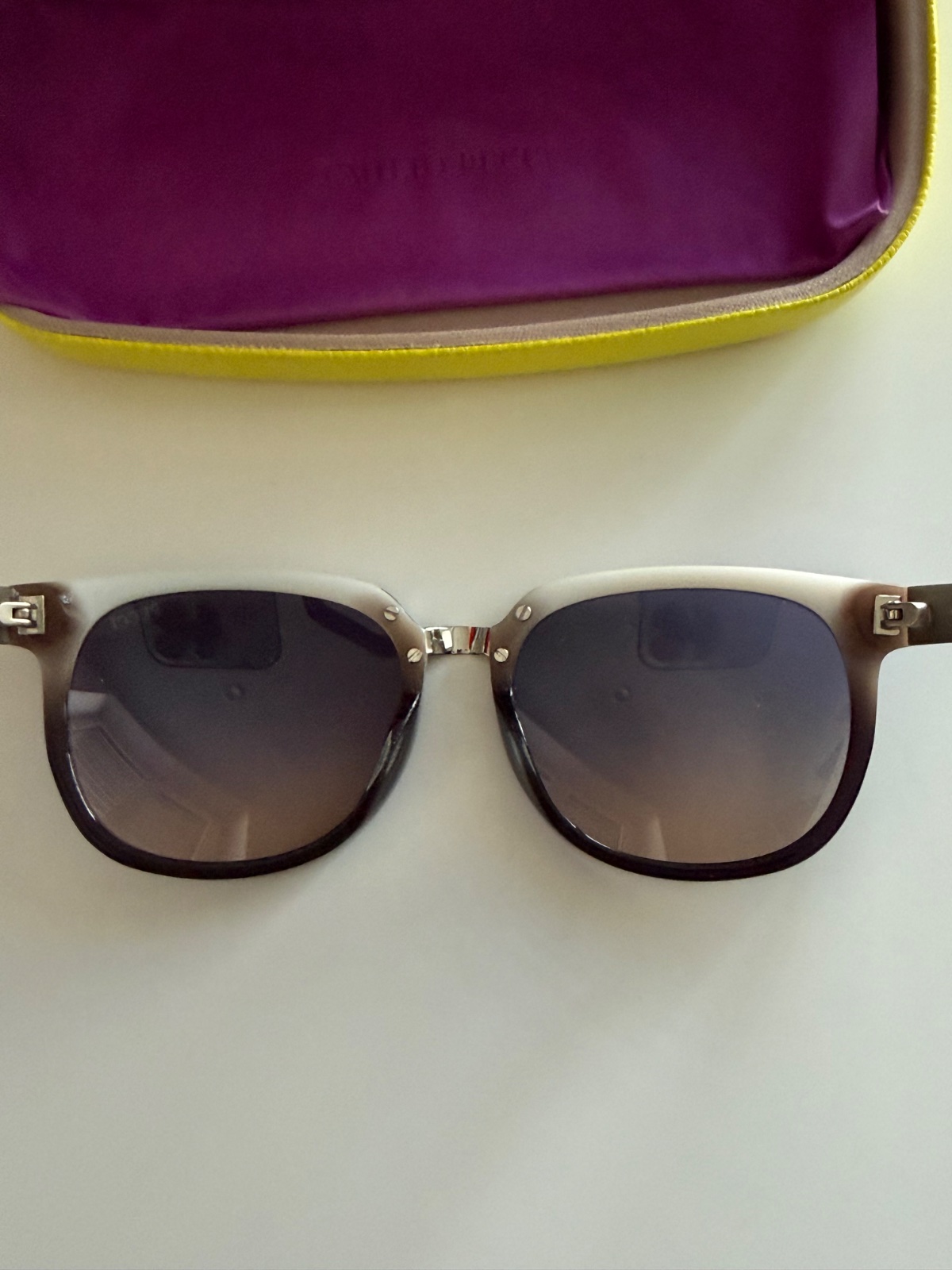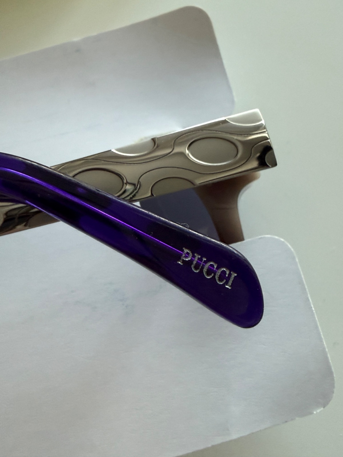 Krásne slnečné okuliare Emilio Pucci. Originálna melírovaná farba, fialová-tmavohnedá-biela. Kovové časti strieborné. Nové, komplet balenie. PC:169,-€
