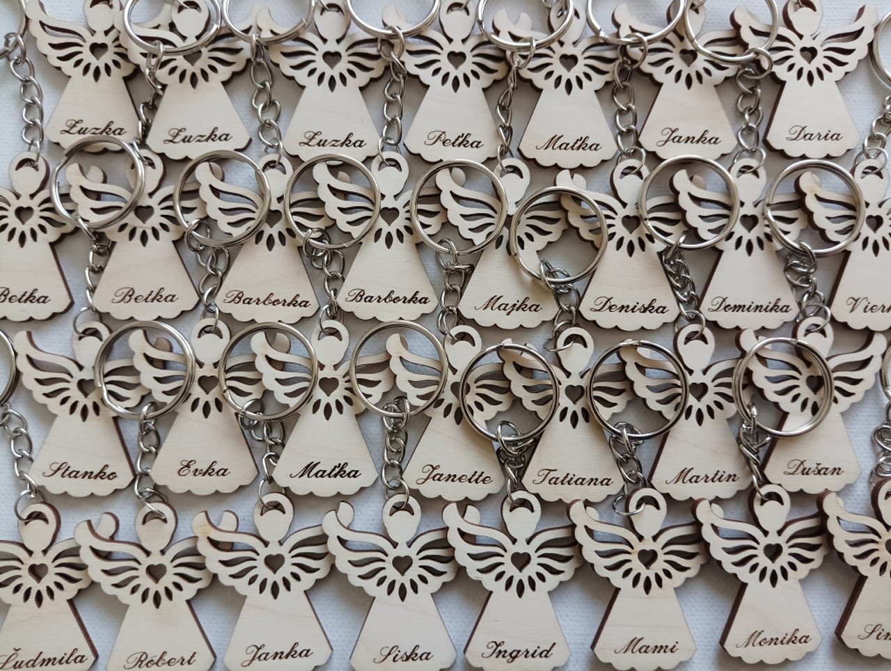 Prívesok na kľúče Anjelik s menom na želanie vyrobený z brezovej preglejky a s kolečkom na uchytenie.