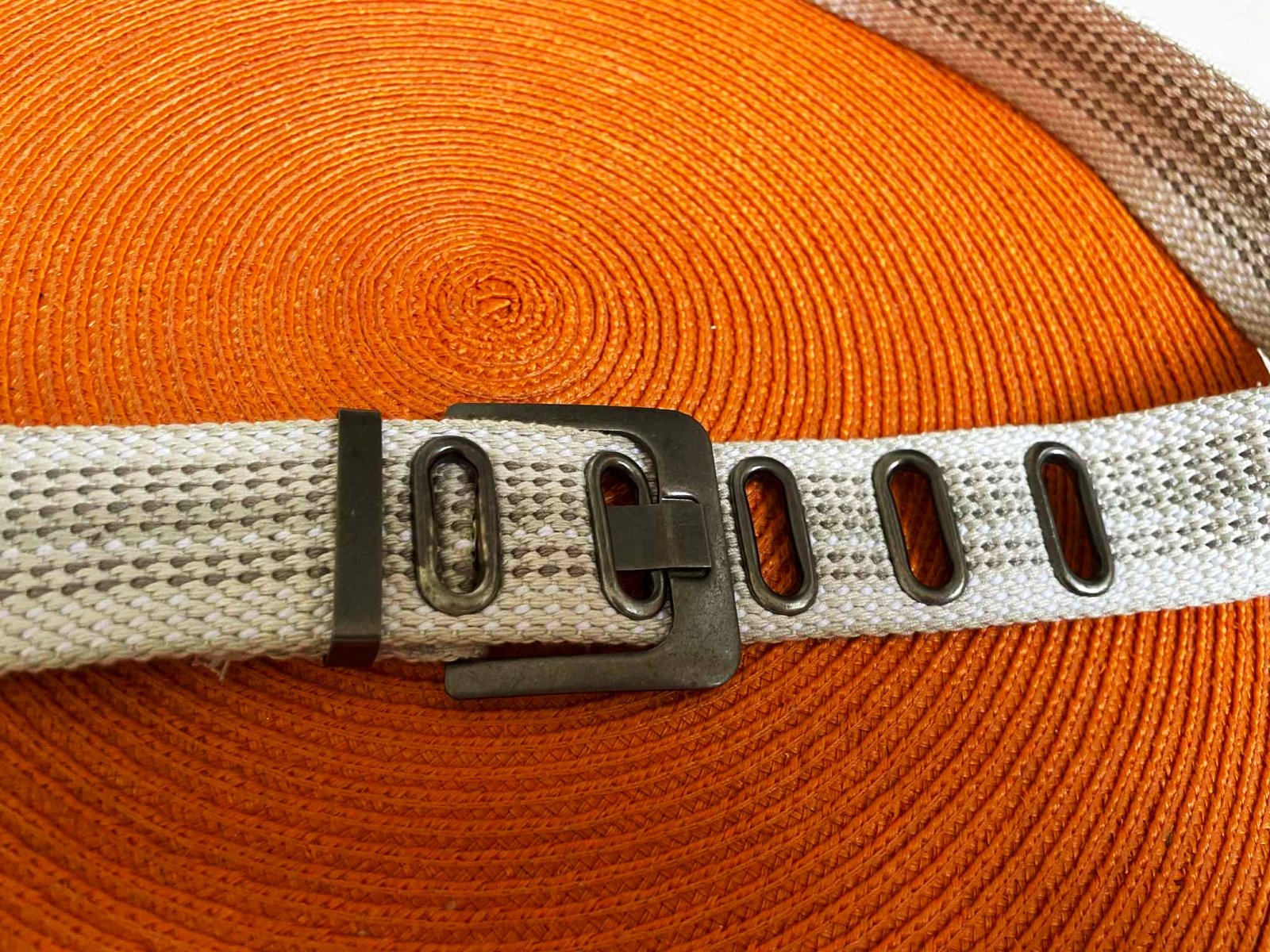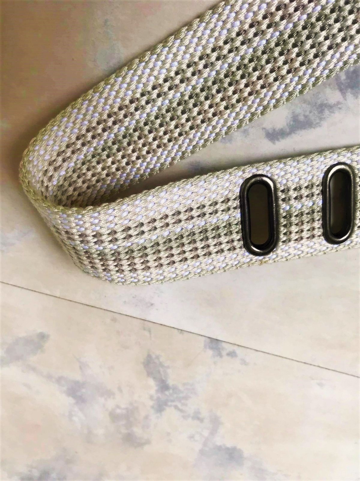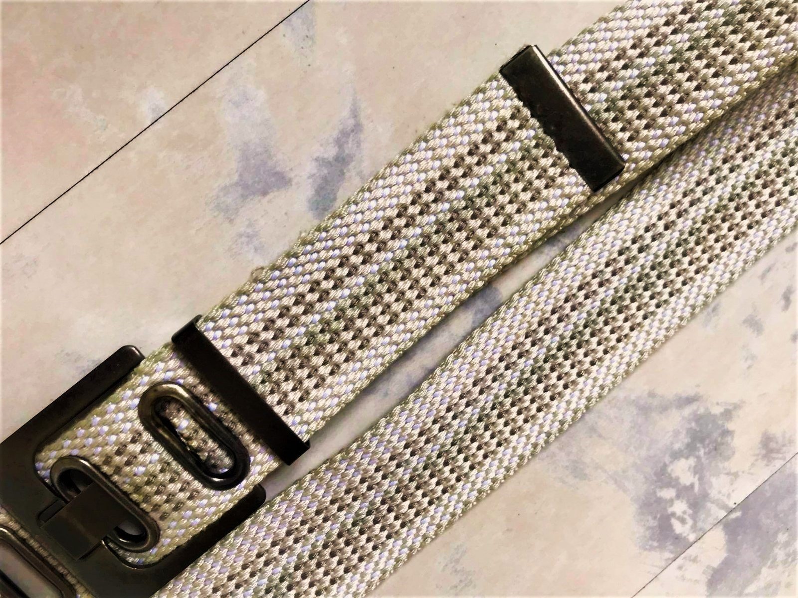 neznosený a veľmi kvalitný moderný unisex opasok,dlžka celkom = 118 cm - meraná plátenná časť,min. obvod vzhľadom na vybitú kovovú dierku = 94 x 2 cm,max = 108 cm,šírka = 4 cm