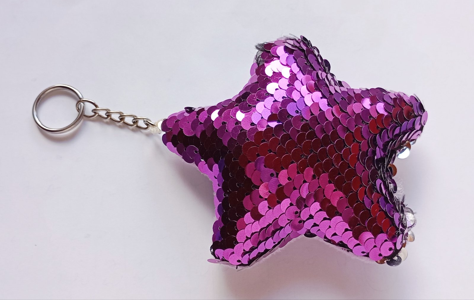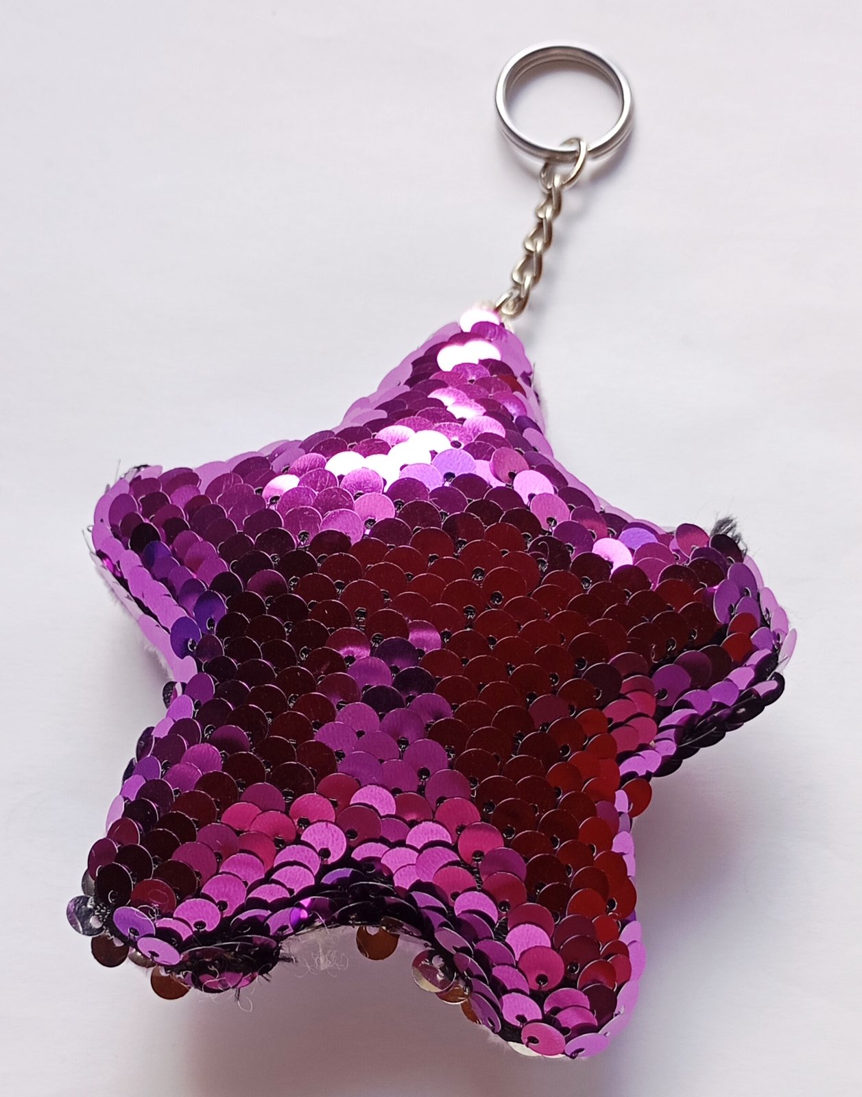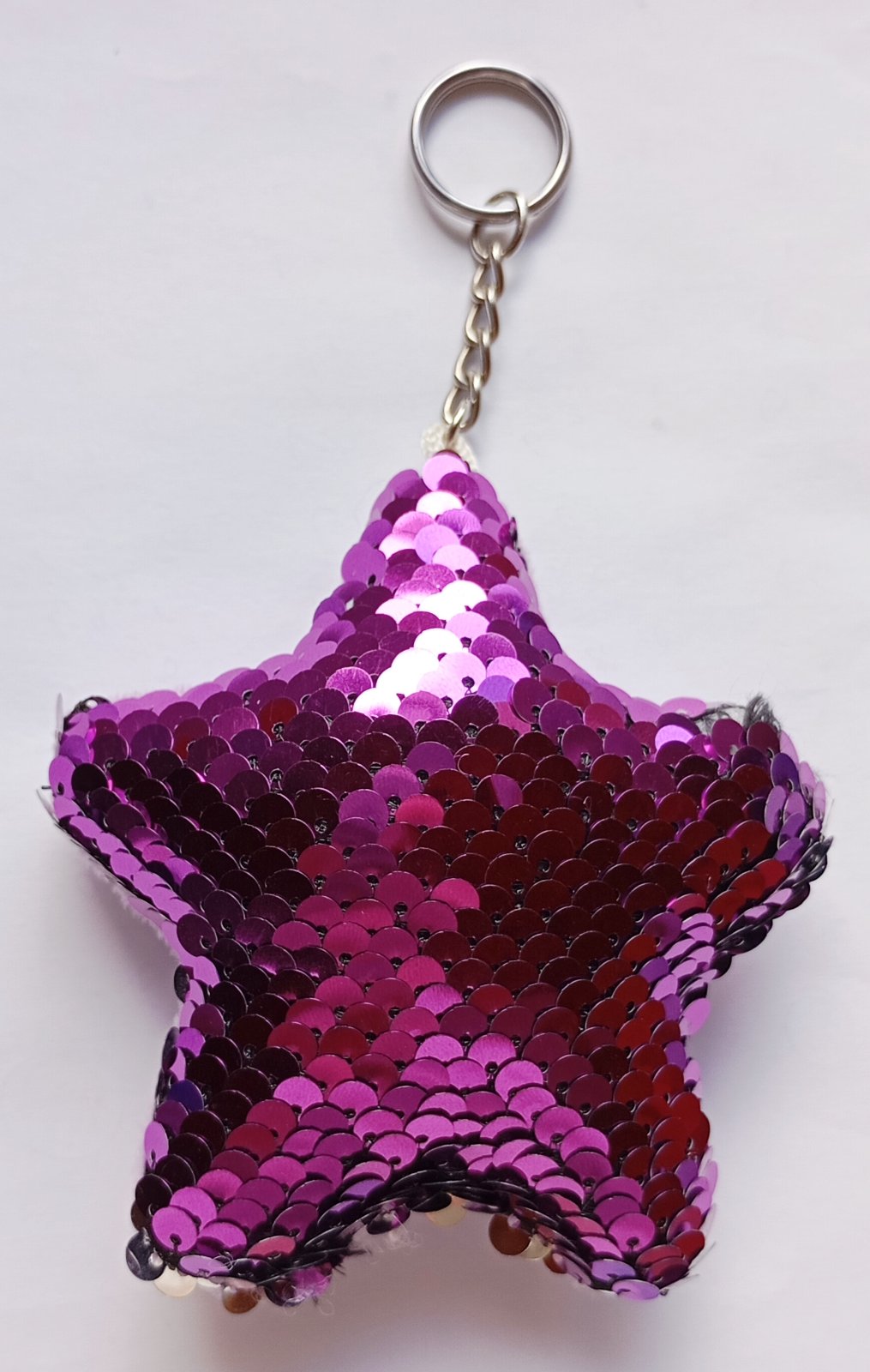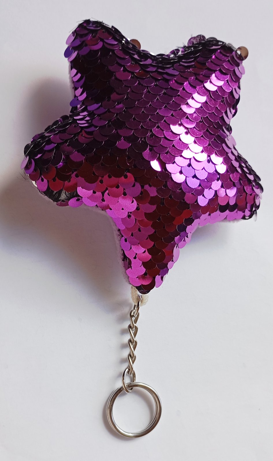Mäkká plyšová kľúčenka resp. prívesok v tvare hviezdy, s ostroružovými (tzv. "hot pink" farba) flitrami na prednej strane.