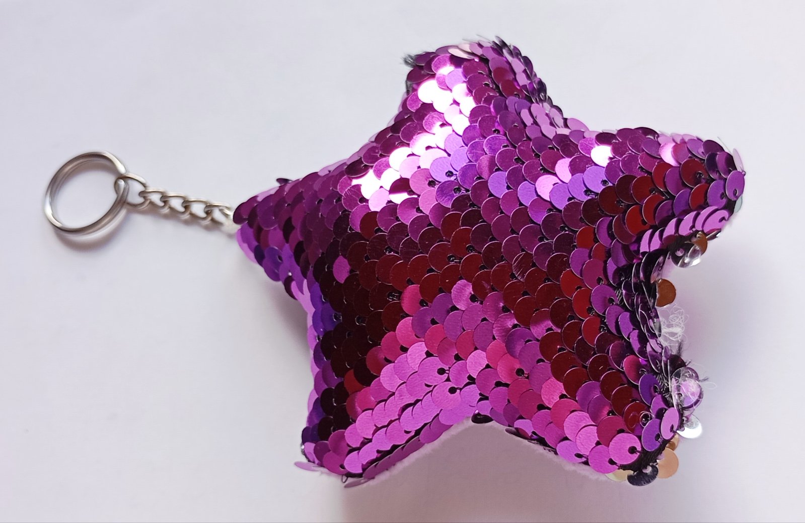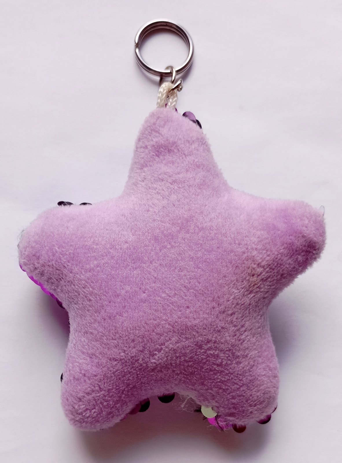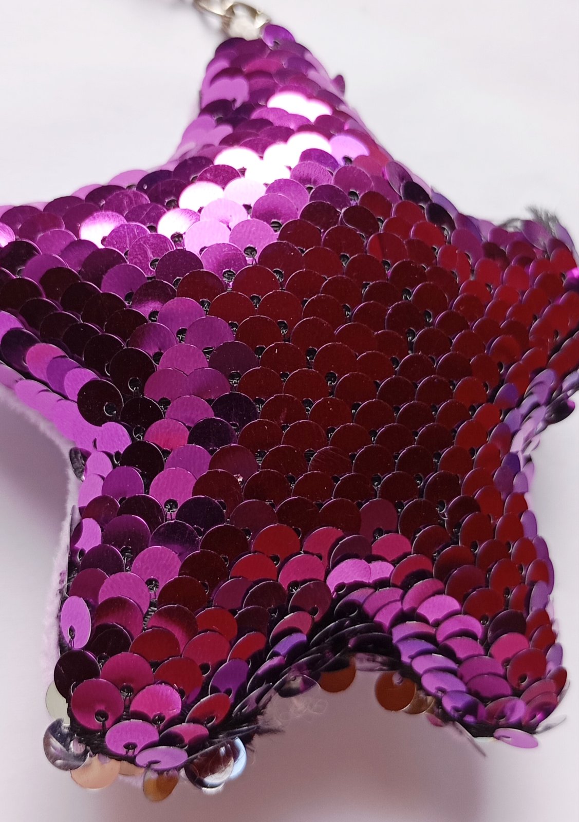 Mäkká plyšová kľúčenka resp. prívesok v tvare hviezdy, s ostroružovými (tzv. "hot pink" farba) flitrami na prednej strane.