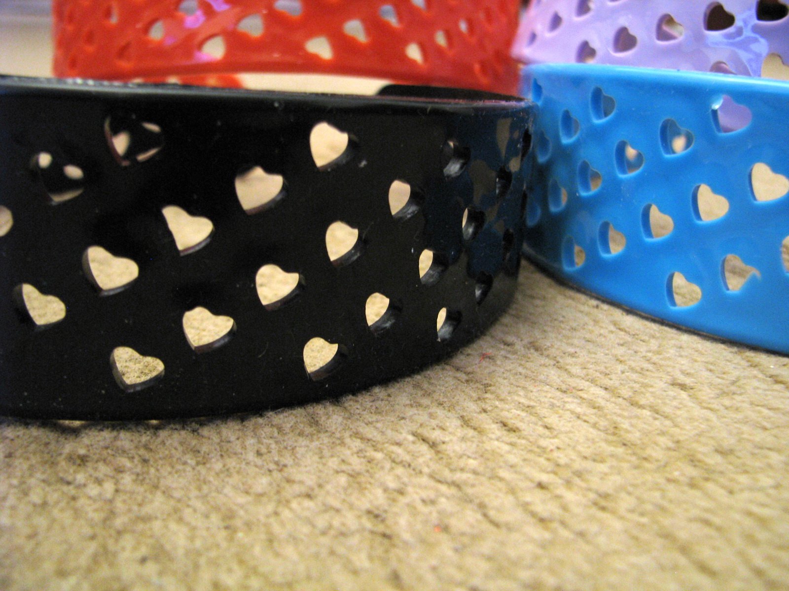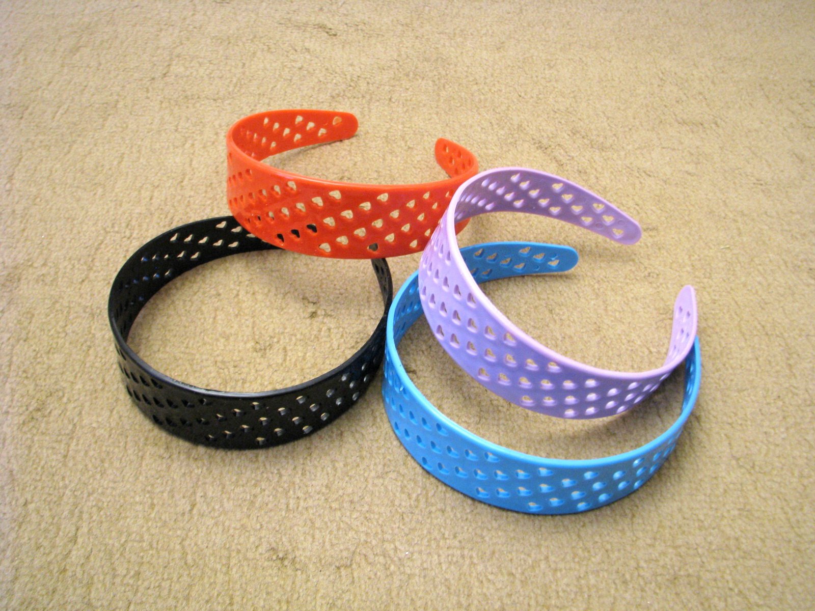 Nepoužívané plastové široké čelenky s dierkovanými srdiečkami - 4 kusy - červená (nie oranžová, ako sa zdá na fotke), svetlá fialová, čierna a tyrkysovo modrá. Veľkosť je na štandardnú menšiu ženskú hlavu, prípadne detskú. V prípade záujmu odmeriam. Cena za 1 ks je 1 euro, predám aj jednotlivo.