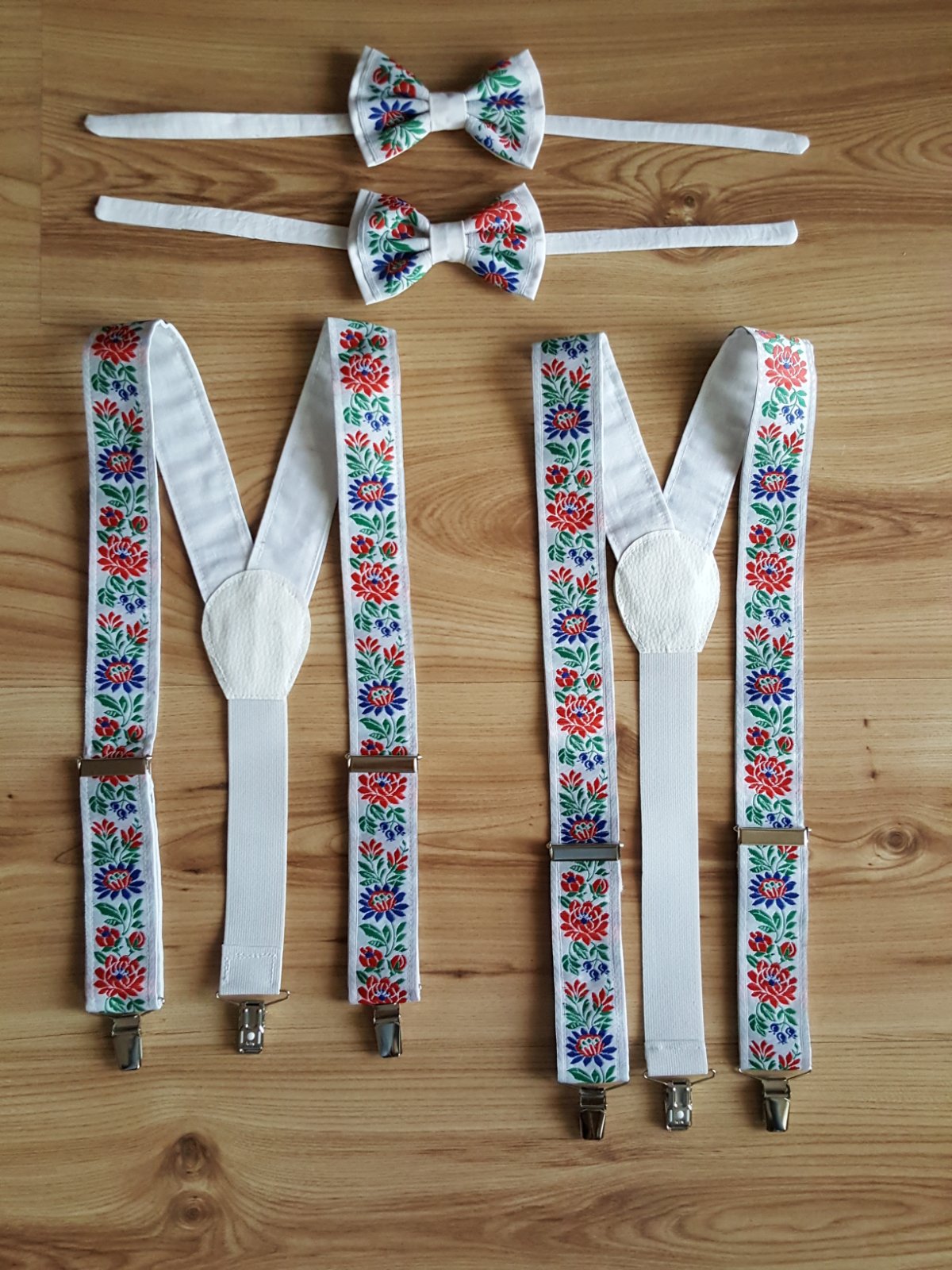 Motýlik je vyrobený na obvod krku, aký mi pošlete. Zapínanie je na suchý zips. K motýlikom viem urobiť aj traky, prípadne opasok k dámskym šatám, alebo skladanú sukňu s takýmto opaskom (pozrite moje inzeráty, mám tam skladanú sukňu). Traky sú nastaviteľné, vzadu v tvare Y na gumičku. Farbu si môžete vybrať: červená, čierna, tmavomodrá, modrá, biela.