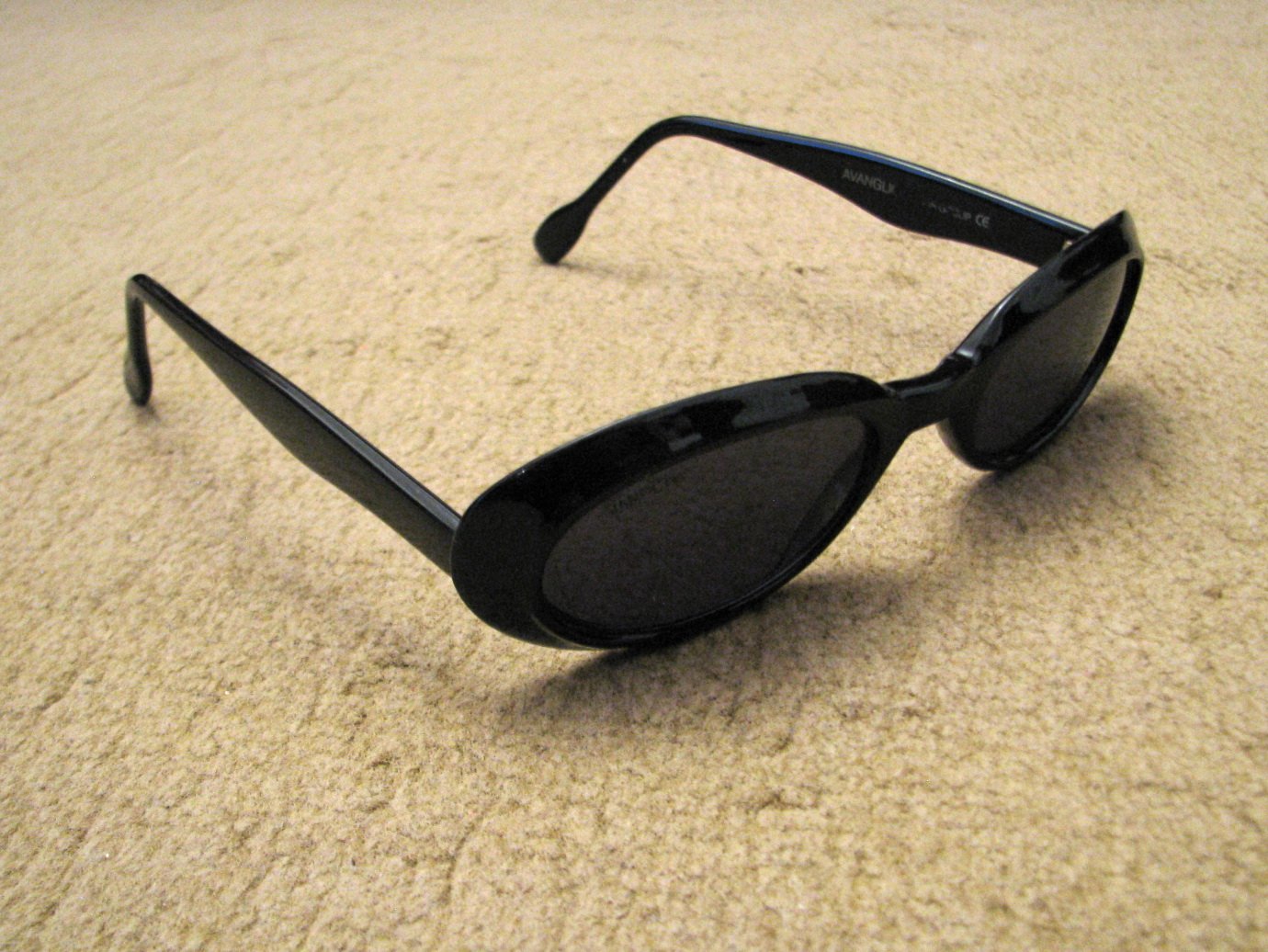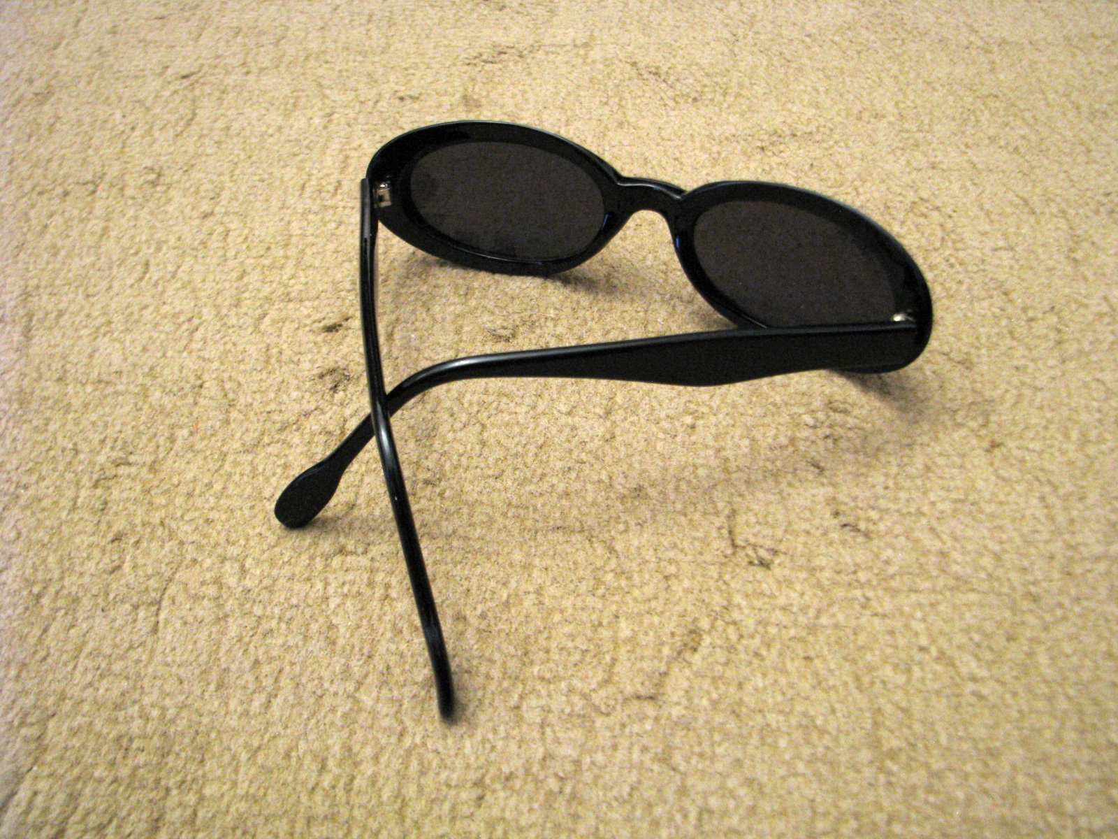 Unisex čierne slnečné okuliare, plastové, lesklé. Pekne zachovalé, len jedno malé šuchnutie farby na ráme vpredu a tiež nápis na sklíčku je už sčasti zotretý, viď. detailná fotka. Iné poškodenia nemajú.