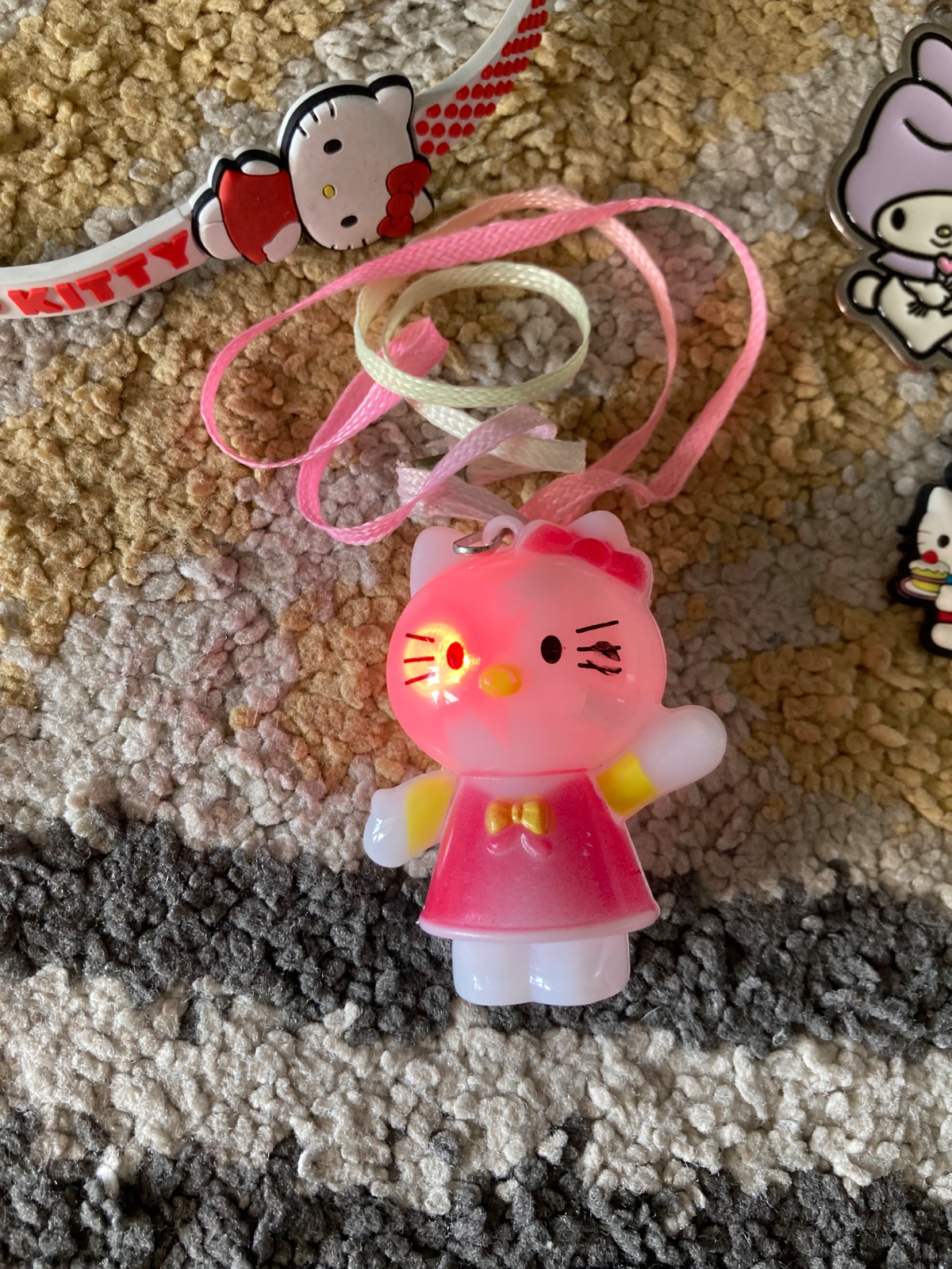 veľmi pekný stav, krásne, väčšia postavička na šnúrke po stlačení vzadu bliká, dva sú prívesky a náramok.