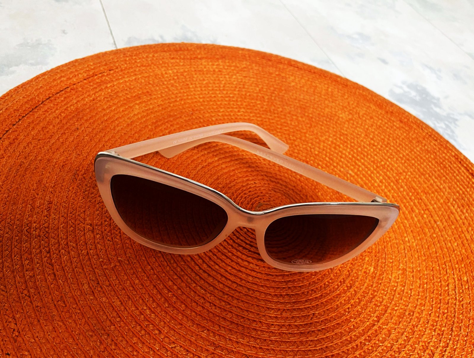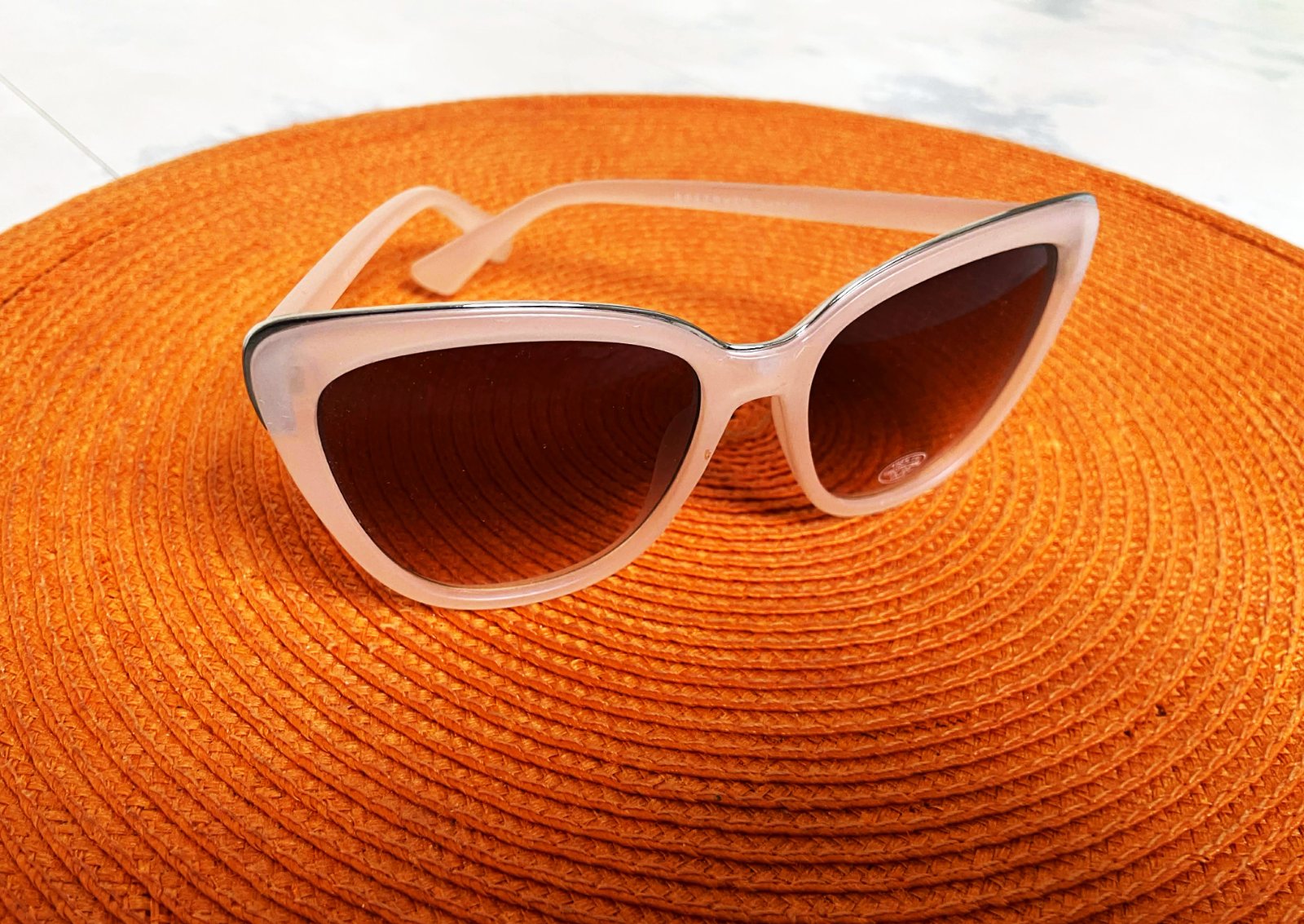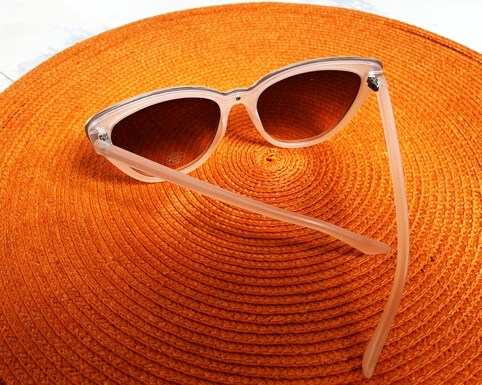 moderné slnečné okuliare s priesvitným béžovým rámom a hnedými tieňovanými sklami,ľahúčke,s UVA a UVB faktorom,šírka hore 14 cm,výška celých okuliarov meraná v strede = 5,4 cm,sklo výška = 4,5 cm, šírka hore = 5,4 cm,dole= 3,5 cm,farba je jemná púdrová béžovo ružová,lemované jemným kovom &
