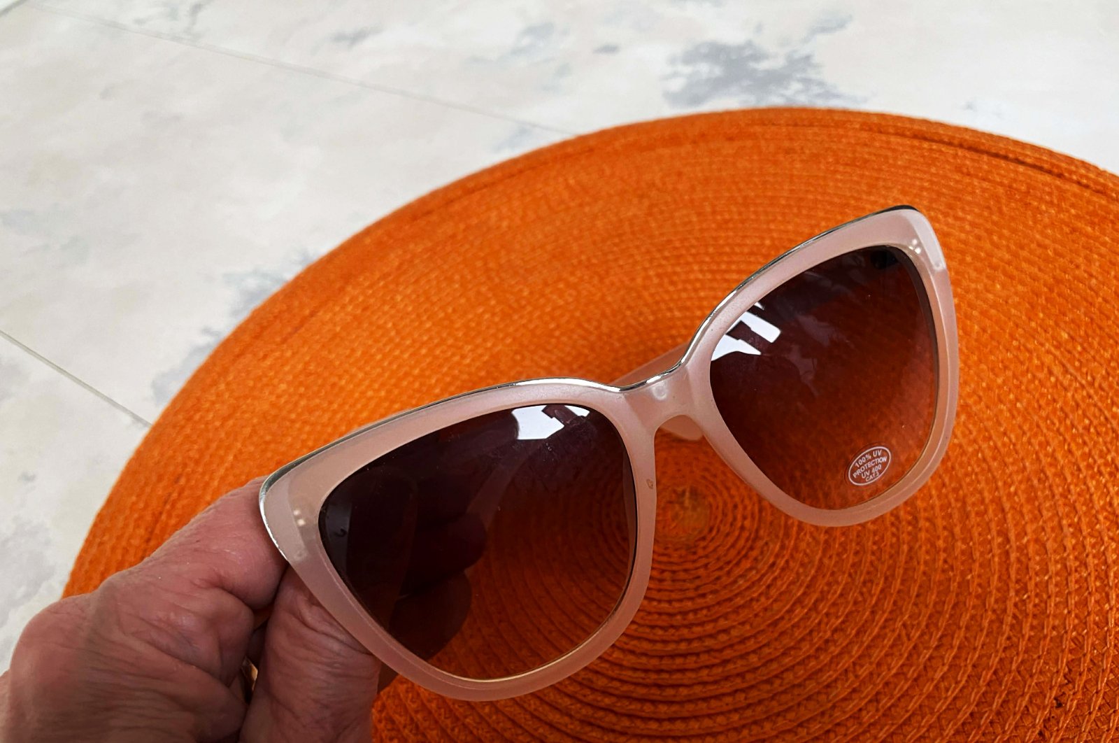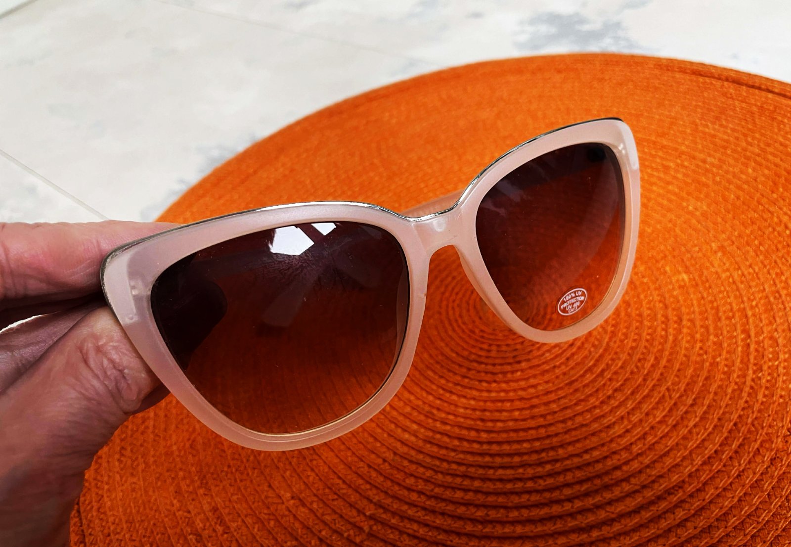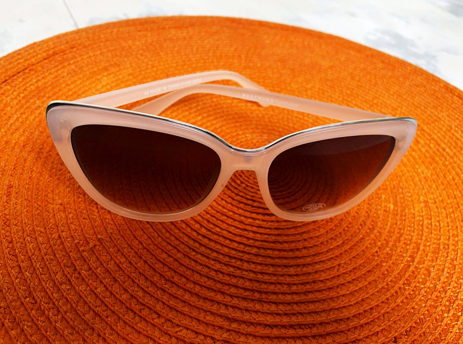 moderné slnečné okuliare s priesvitným béžovým rámom a hnedými tieňovanými sklami,ľahúčke,s UVA a UVB faktorom,šírka hore 14 cm,výška celých okuliarov meraná v strede = 5,4 cm,sklo výška = 4,5 cm, šírka hore = 5,4 cm,dole= 3,5 cm,farba je jemná púdrová béžovo ružová,lemované jemným kovom &