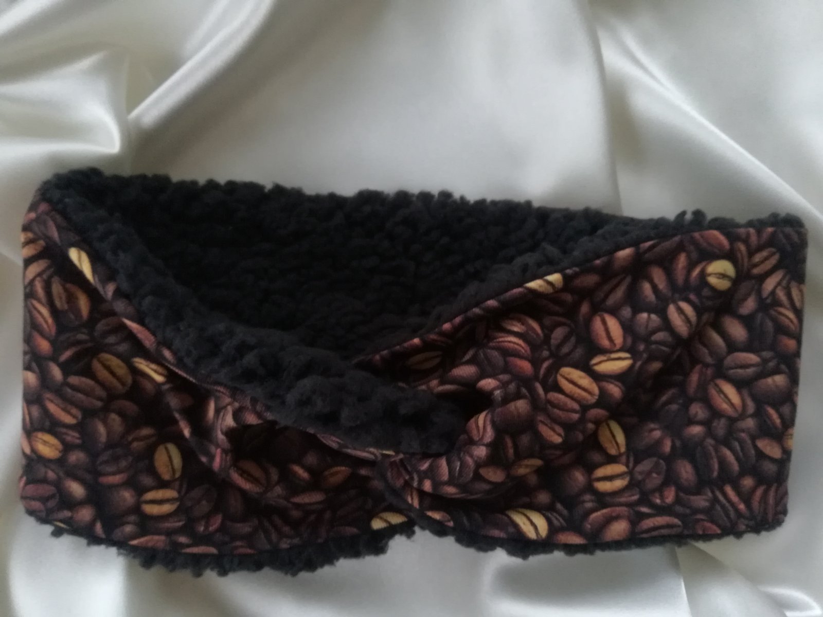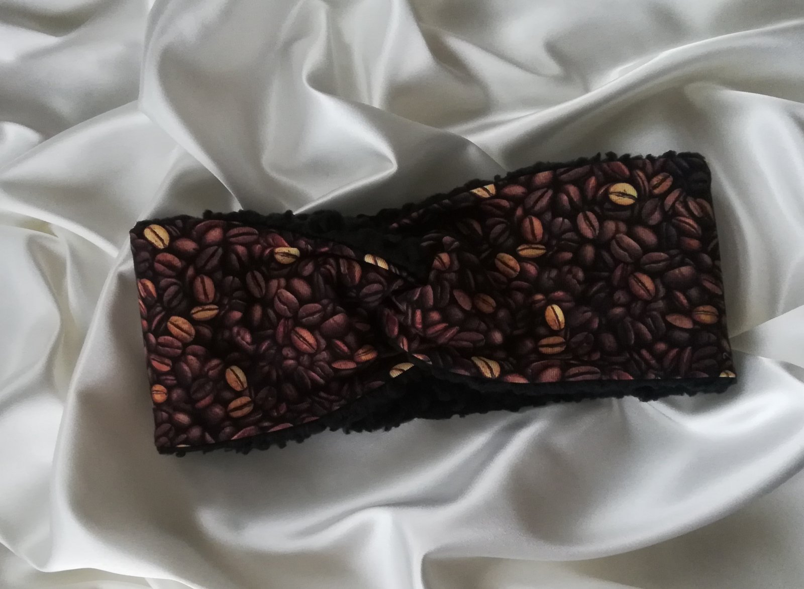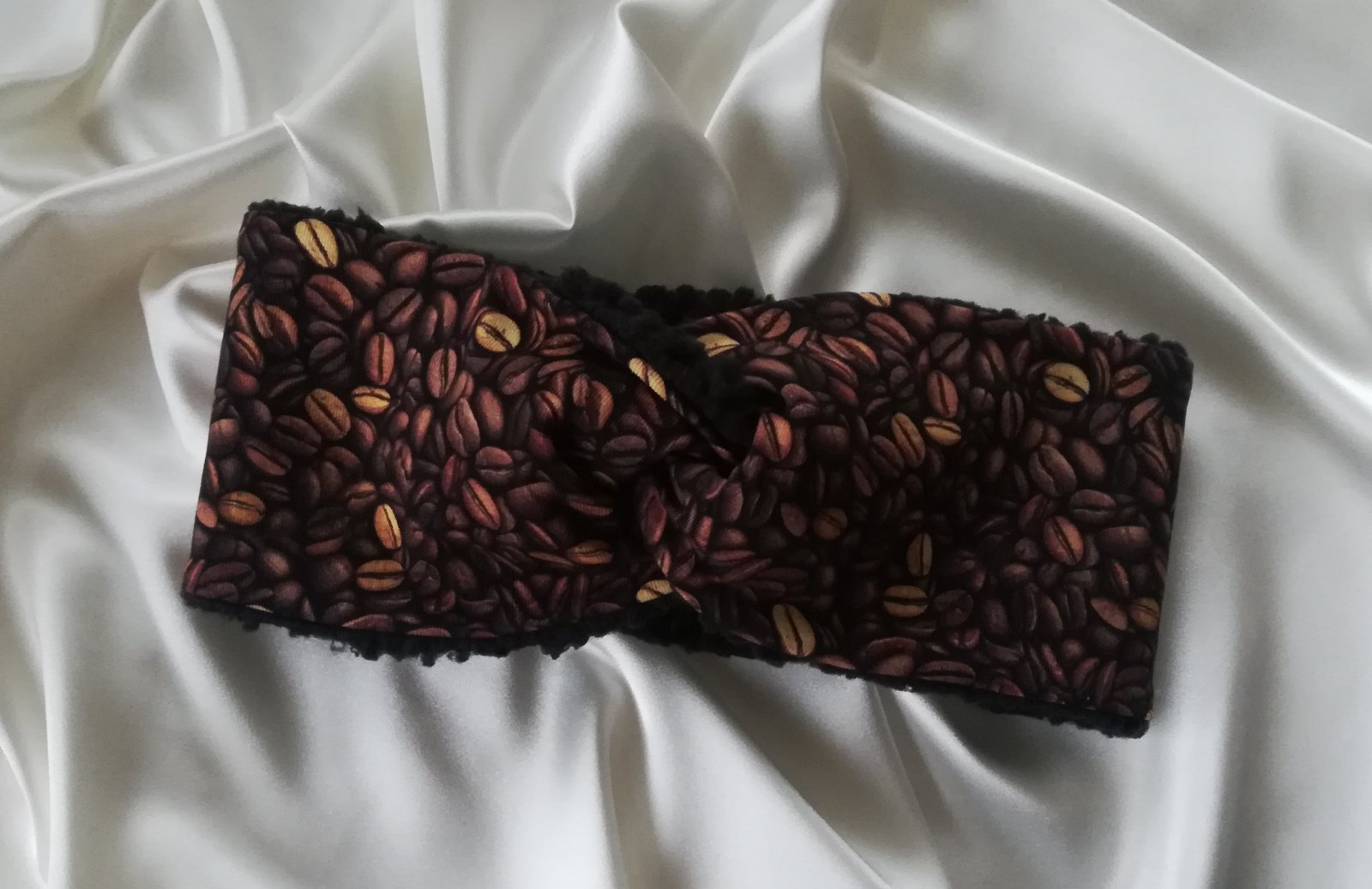 Twist/vpredu prekrížená čelenka z nádherného dizajnérského úpletu v tmavohnedej farbe s kávovými zrnkami, zateplená čiernym barančekom, nová, nenosená. Šijem všetky veľkosti, pre detičky aj mamičky.