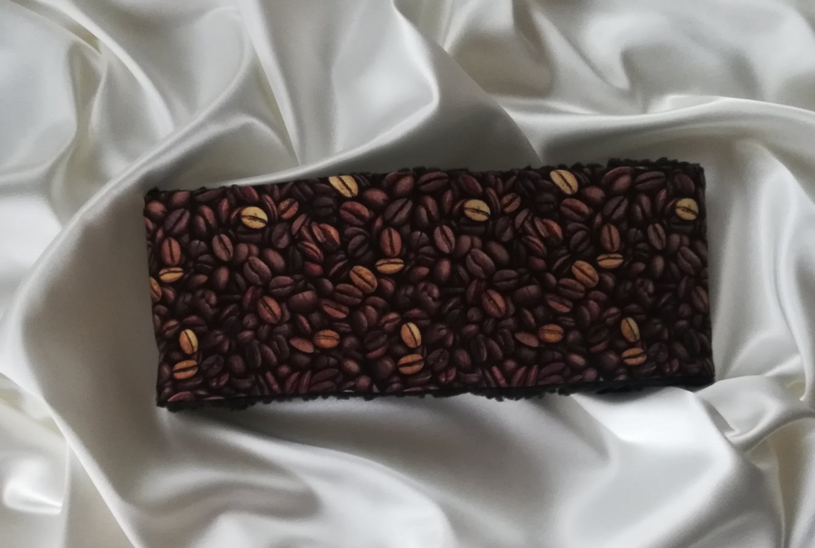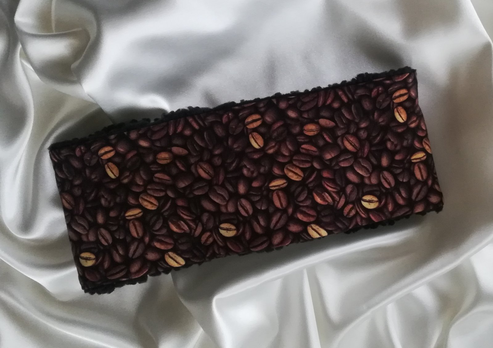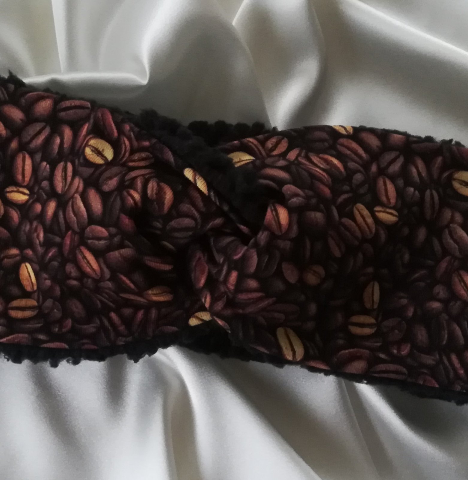Twist/vpredu prekrížená čelenka z nádherného dizajnérského úpletu v tmavohnedej farbe s kávovými zrnkami, zateplená čiernym barančekom, nová, nenosená. Šijem všetky veľkosti, pre detičky aj mamičky.
