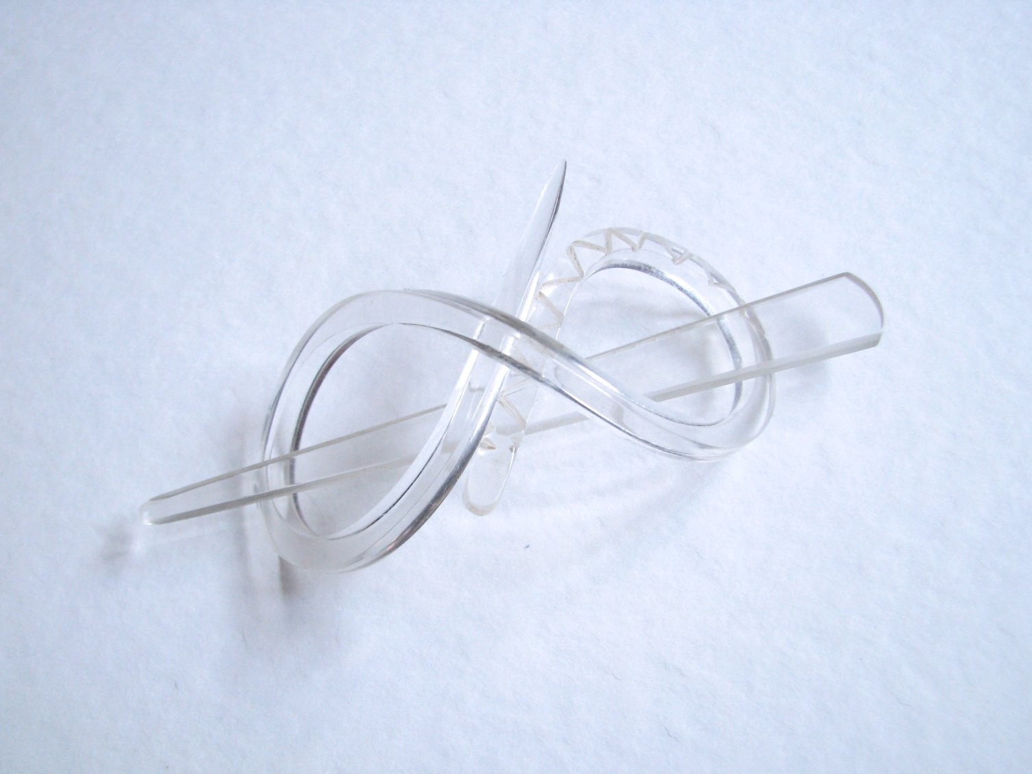 Transparentná plastová vintage spona do vlasov s ihlicou, minimalistického vzhľadu, v tvare nekonečna :) Má už okolo 50 rokov. V ozdobných zárezoch trochu zažltnutie či zašpinenie, azda by šlo vyčistiť. Inak bez poškodení. Veľkosť odhadom okolo 8 cm, v prípade záujmu premeriam.