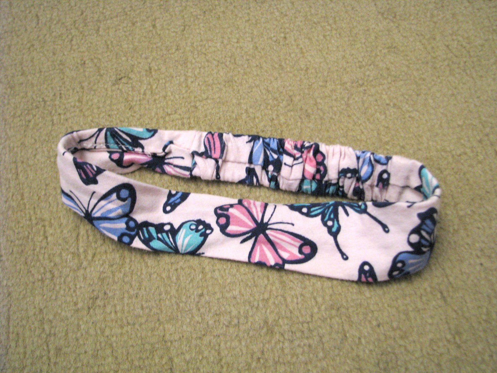 Svetloružová tričkovinová čelenka so vzorom motýlikov, pre bábätko, odhadom asi 1 až 2 ročné. V prípade záujmu odmeriam. Výborne zachovalá bez poškodení.