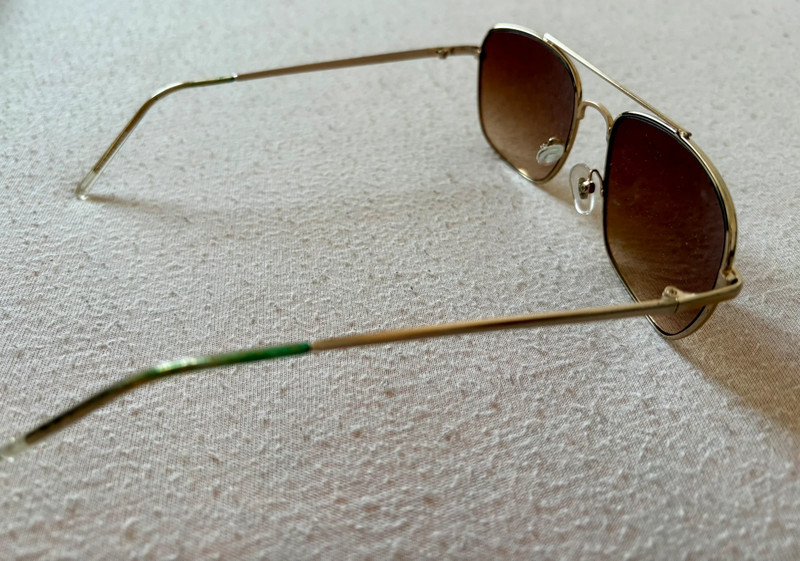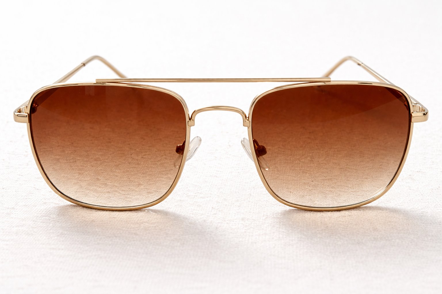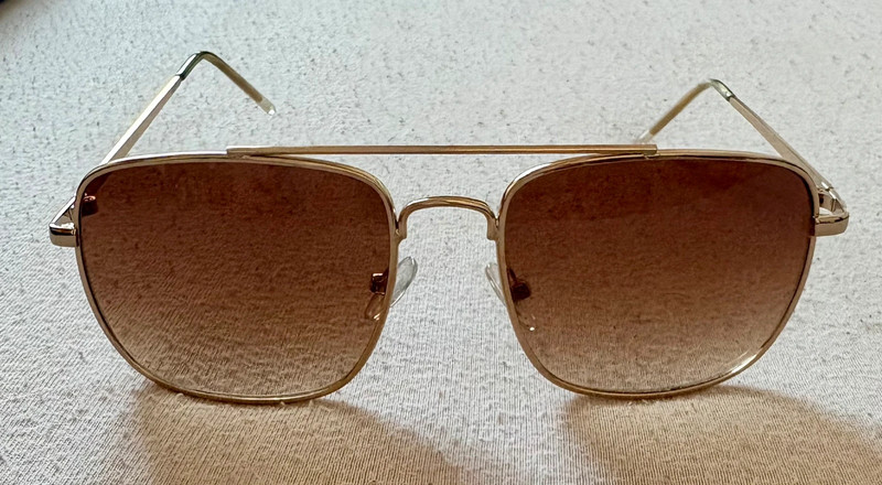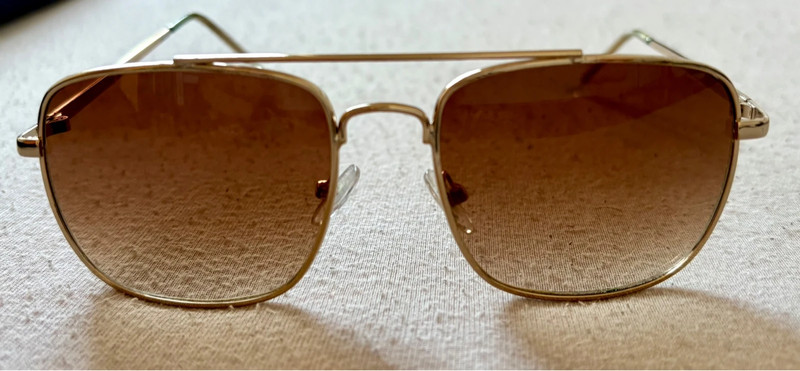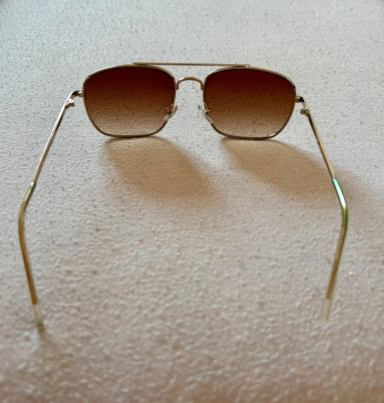 Slnečné okuliare s jemným zlatým kovovým rámom a modernými hranatými sklami v hnedom gradiente. Nosené. Stav na foto.