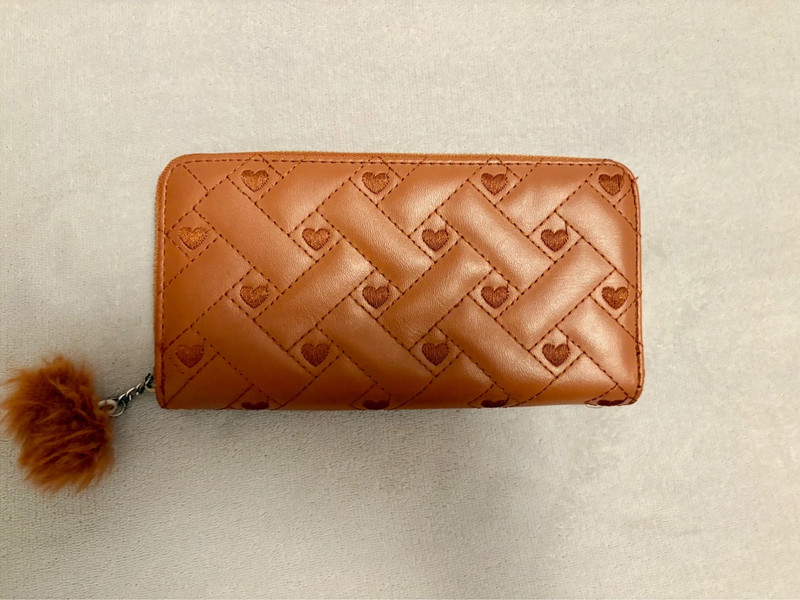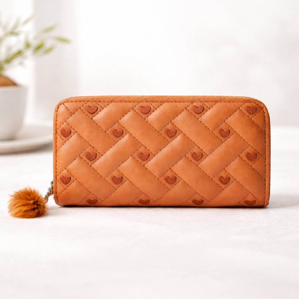 Dámska peňaženka v karamelovo-hnedej farbe s elegantným prešívaným vzorom a jemnými detailmi srdiečok.