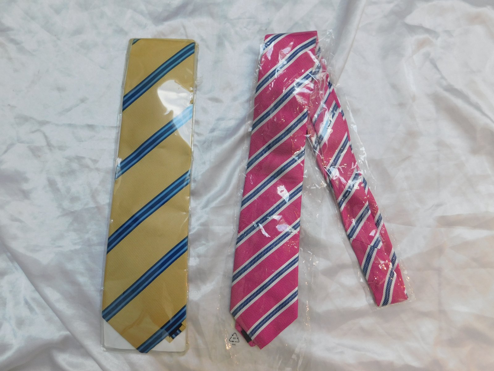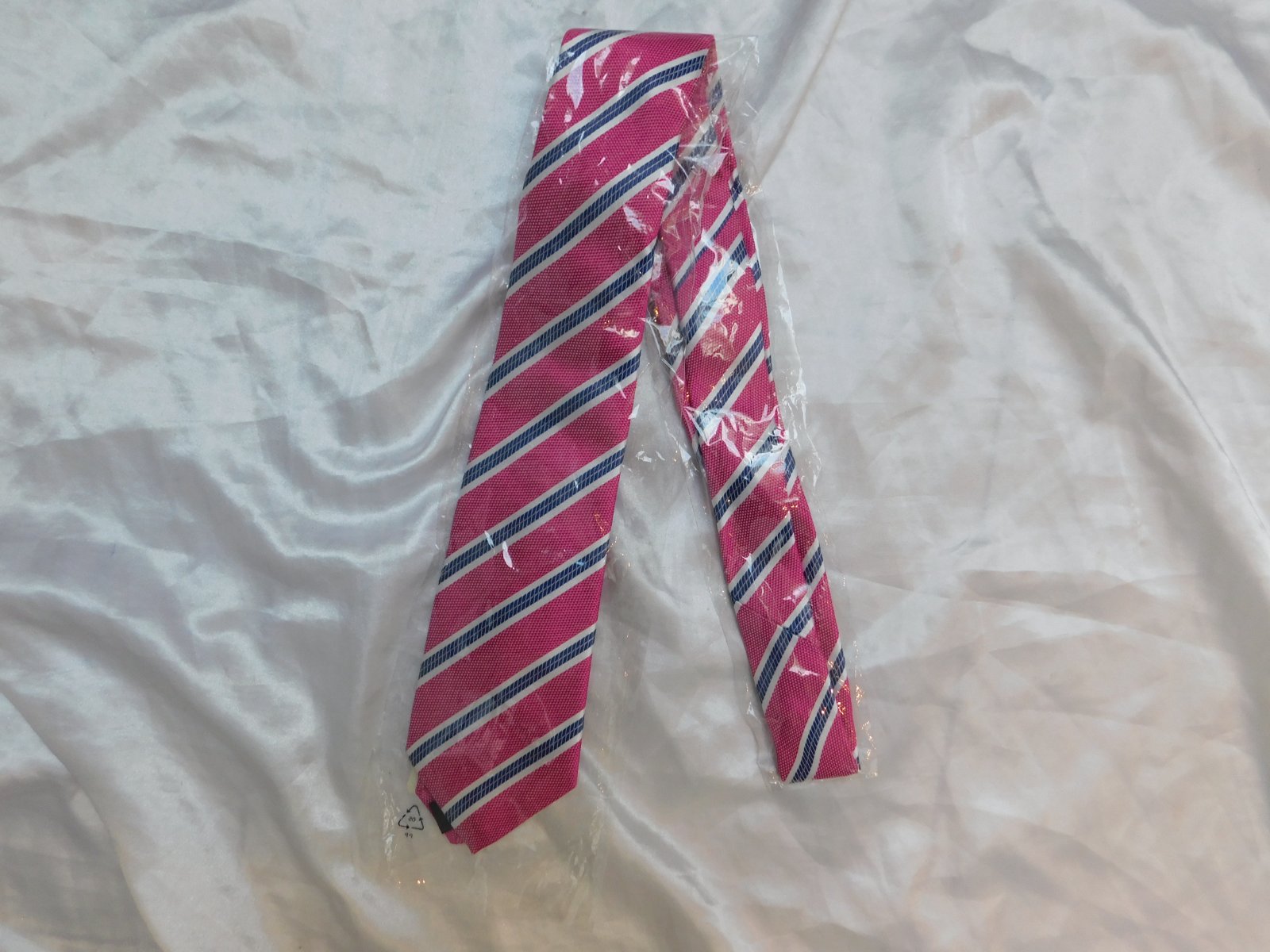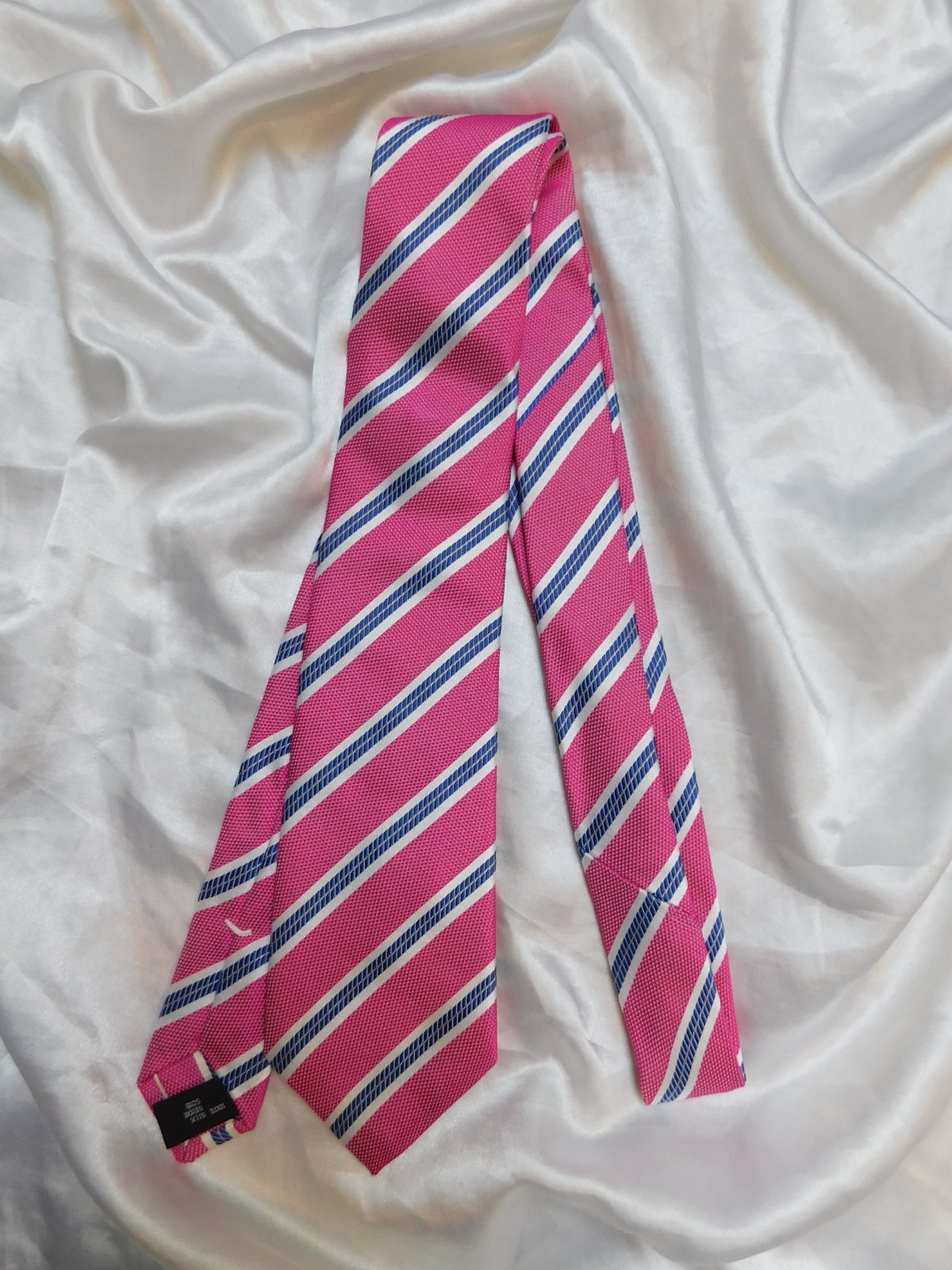 VAN LACK Luxusna hodvabna kravata ružovej farby s pasikmi modro/bielej farby .100%hodvab. PC 150€.pridavam aj žltu kravatu.