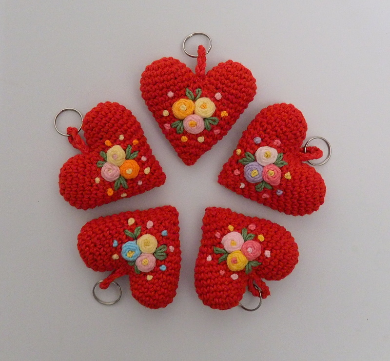 Háčkované prívesky - srdiečka z bavlnenej priadze ozdobené háčkovanými alebo vyšívanými kvietkami. Veľkosť 7 x 7 cm.