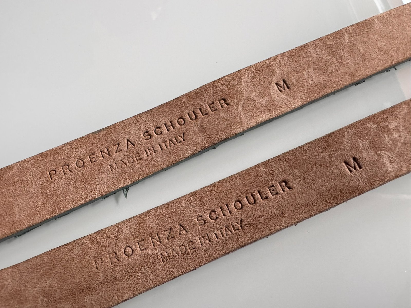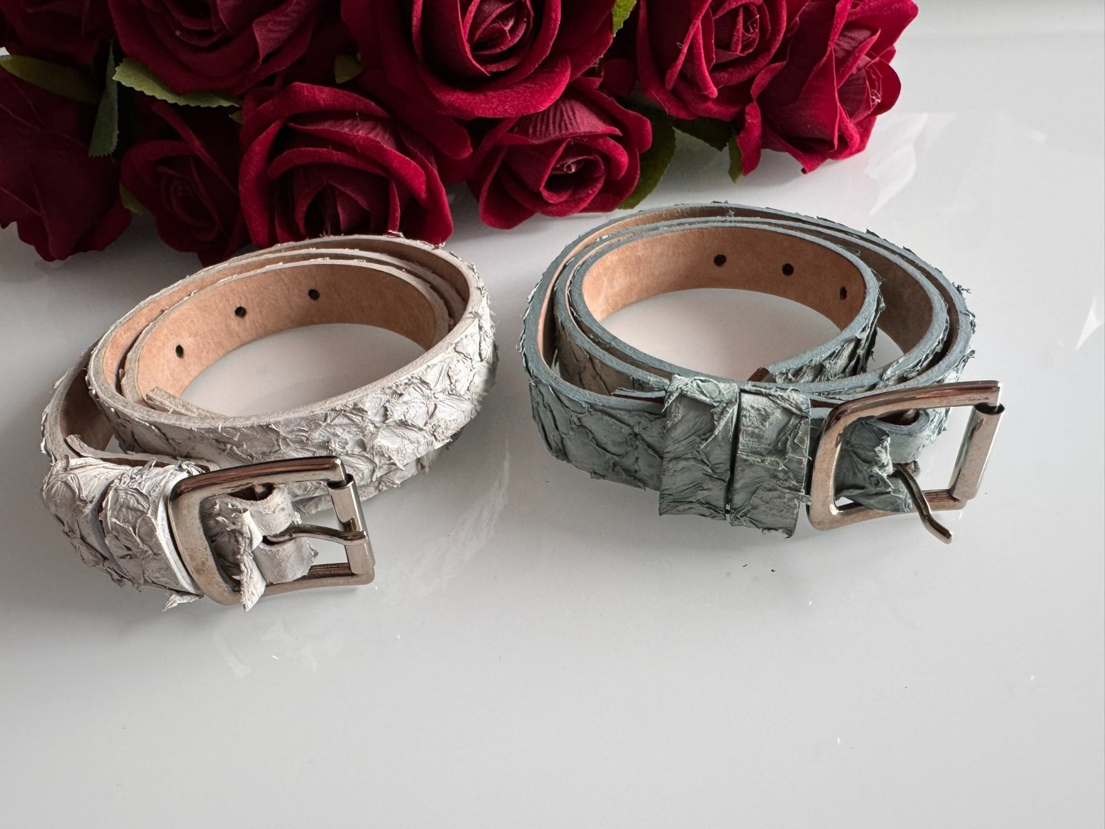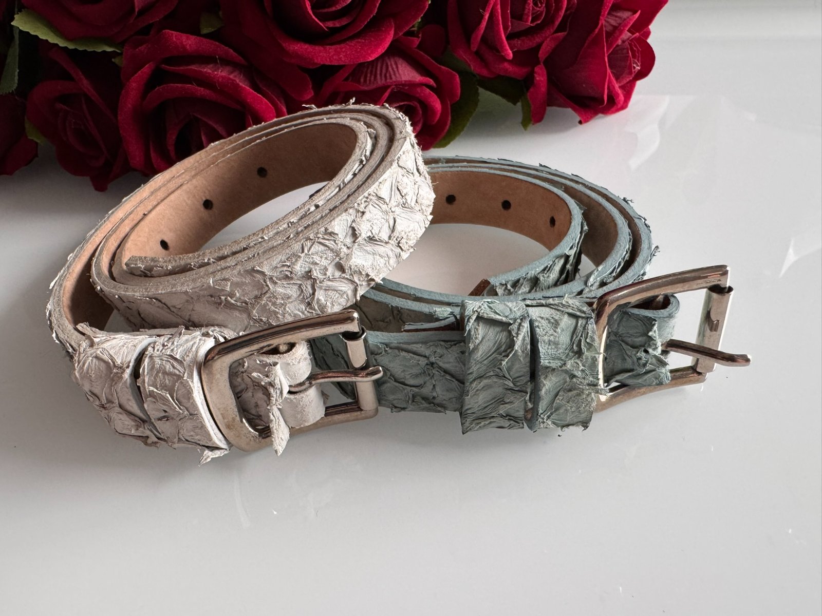 Úzke opasky Proenza Schouler z hadej kože v bielej a tyrkysovej farbe so striebornými kovovými prvkami.