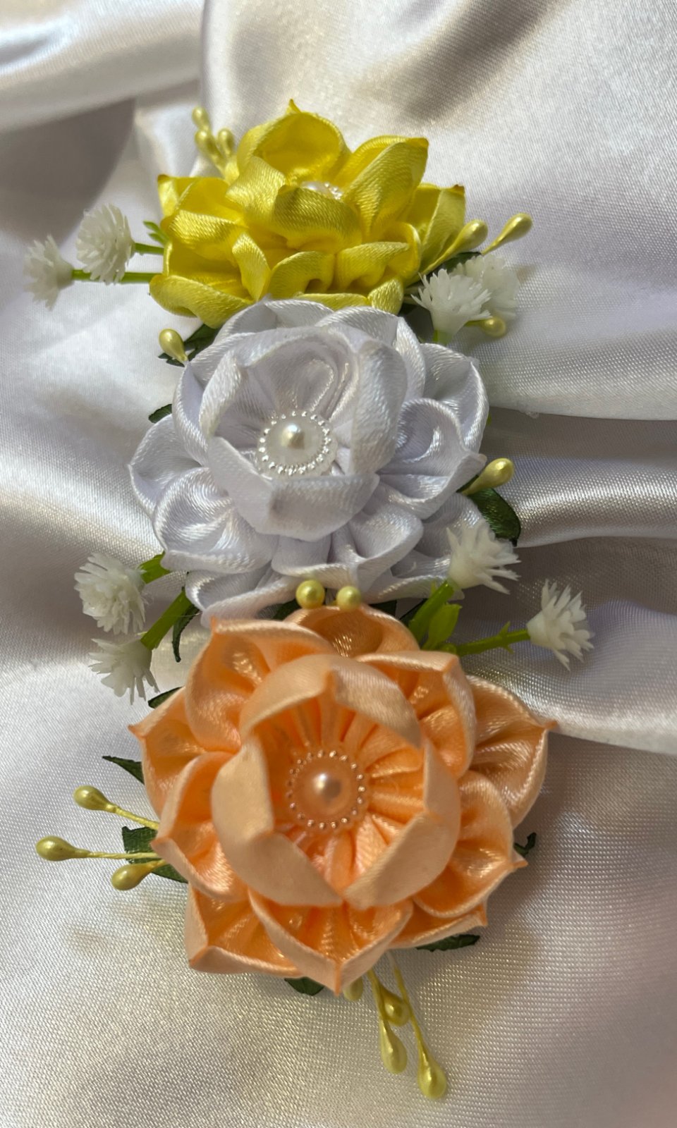 Trojica bohato rozkvitnutých saténových kvetov v jemných odtieňoch je doplnená o drobné gypsomilky a dekoratívne tyčinky, ktoré spolu vytvárajú romantický a zároveň svieži vzhľad.