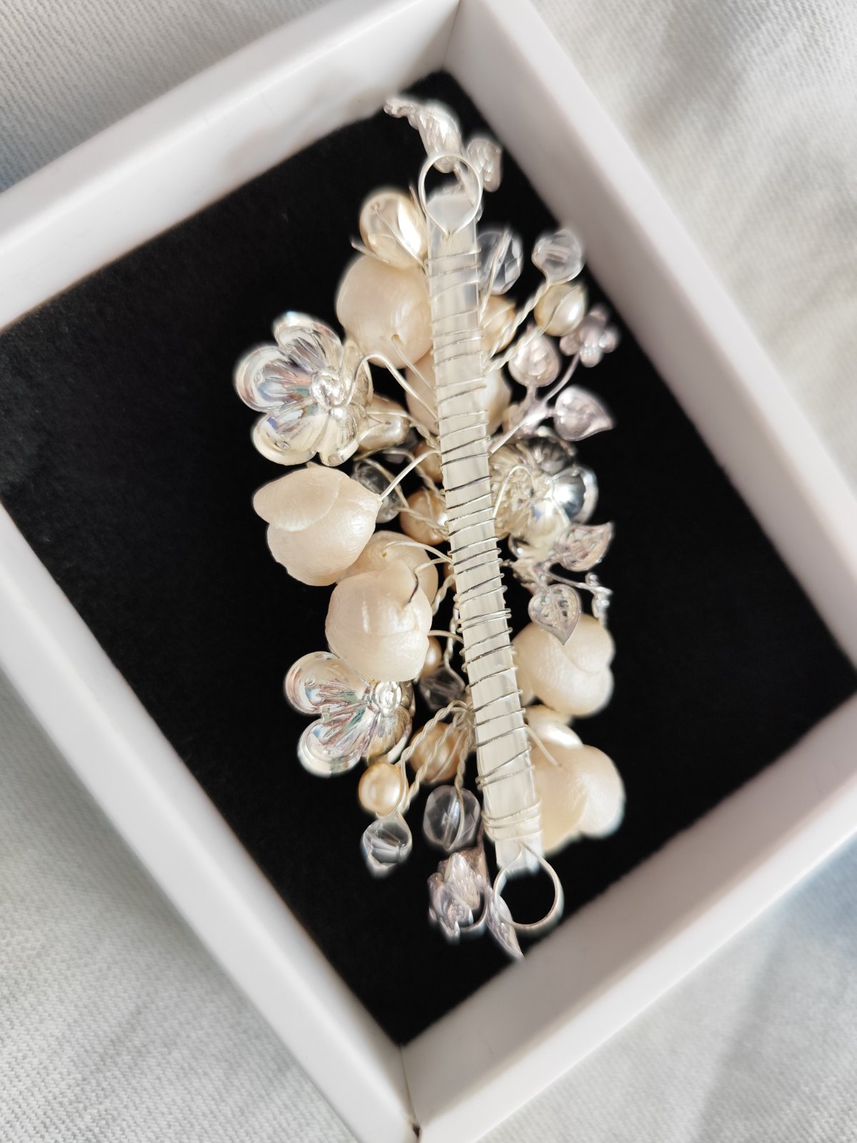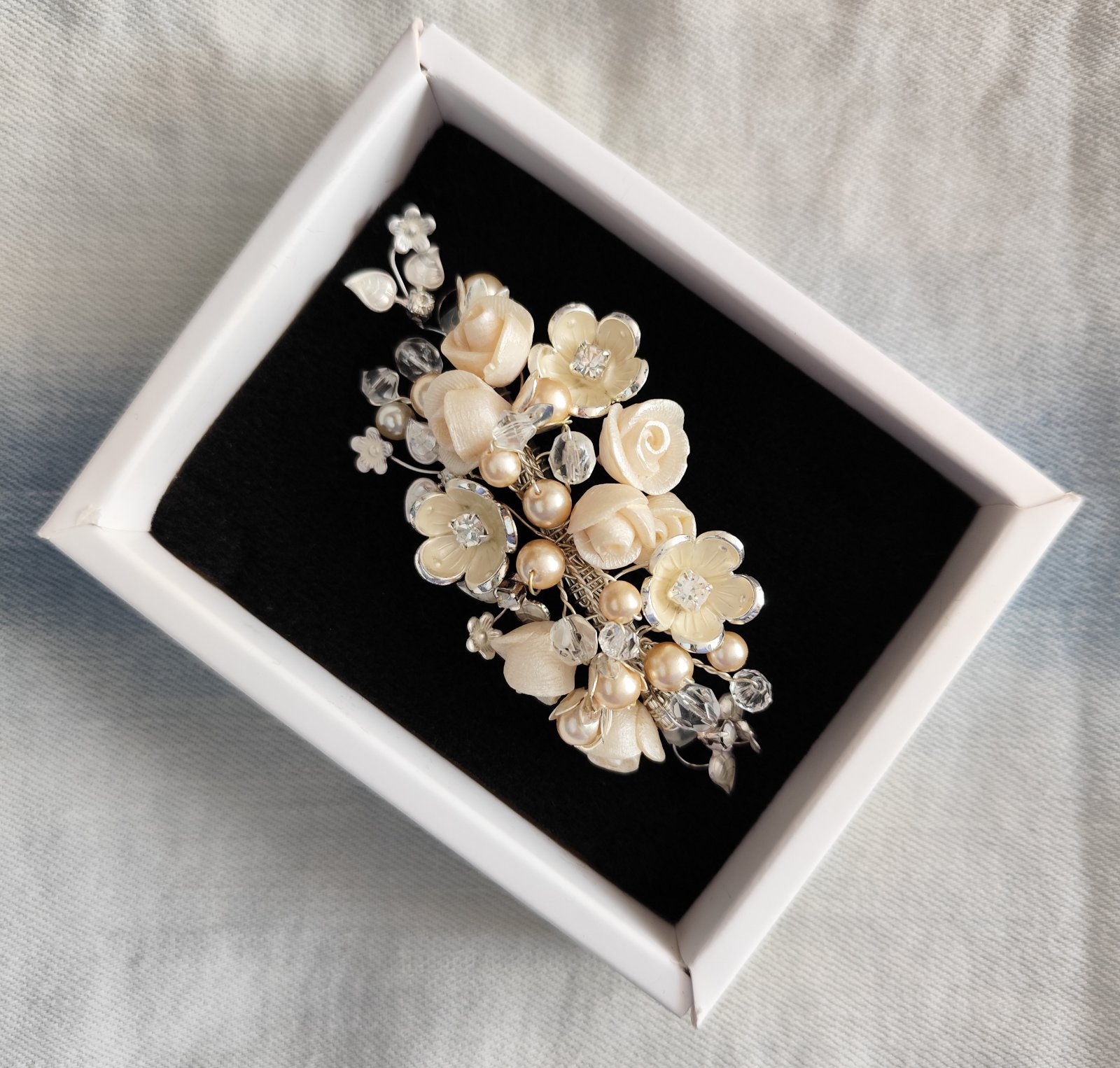 Originálne vlasové doplnky, ručne šitý šperk pre jedinečný účes na rôzne príležitosti. V maslovej farbe ihneď k odberu. V bielej farbe dávnejšie robený na zákazku pre nevestičku.