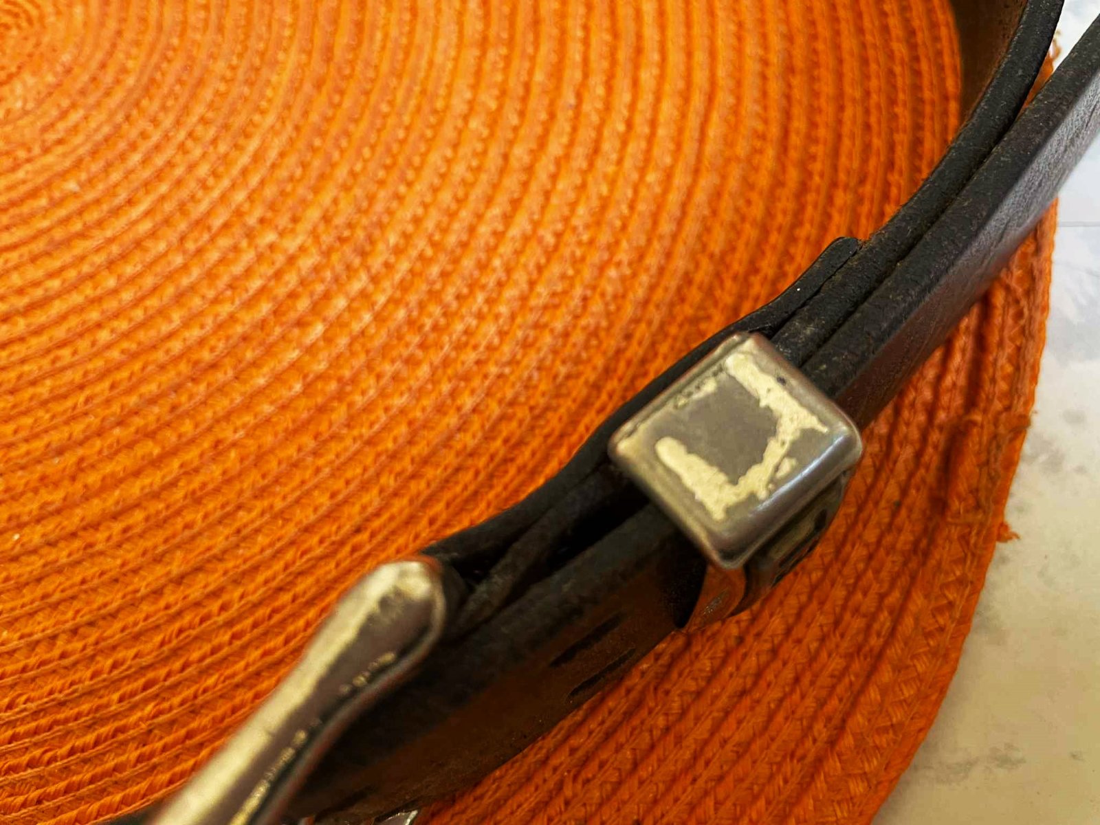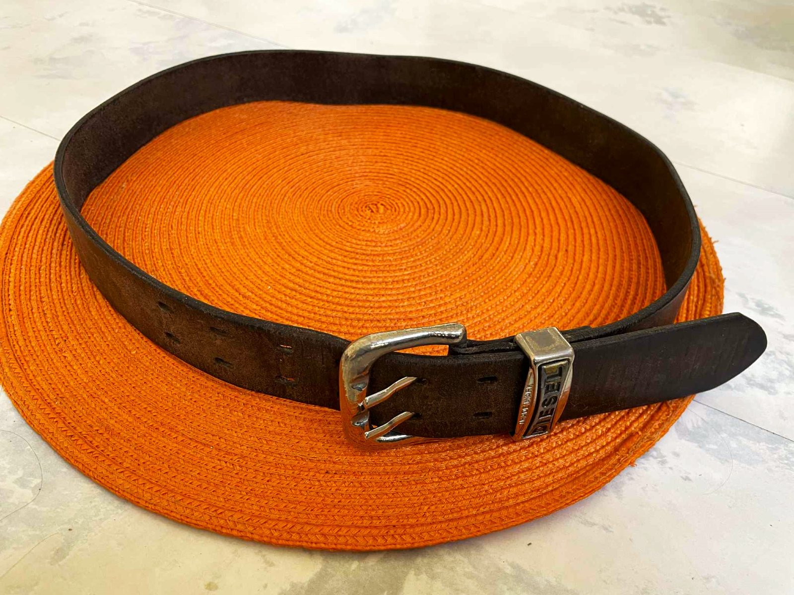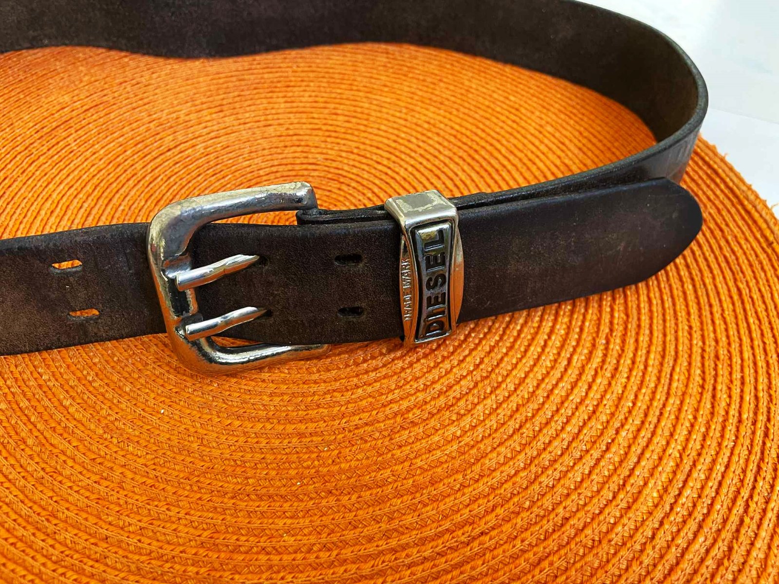 nosený,kožený unisex opasok,originál, s pevnou mohutnou sponou,koža dostala nosením krásnu patinu, je nerovnorodá vo farbe, šírka = 3,5 cm, dlžka celkom = 102 cm