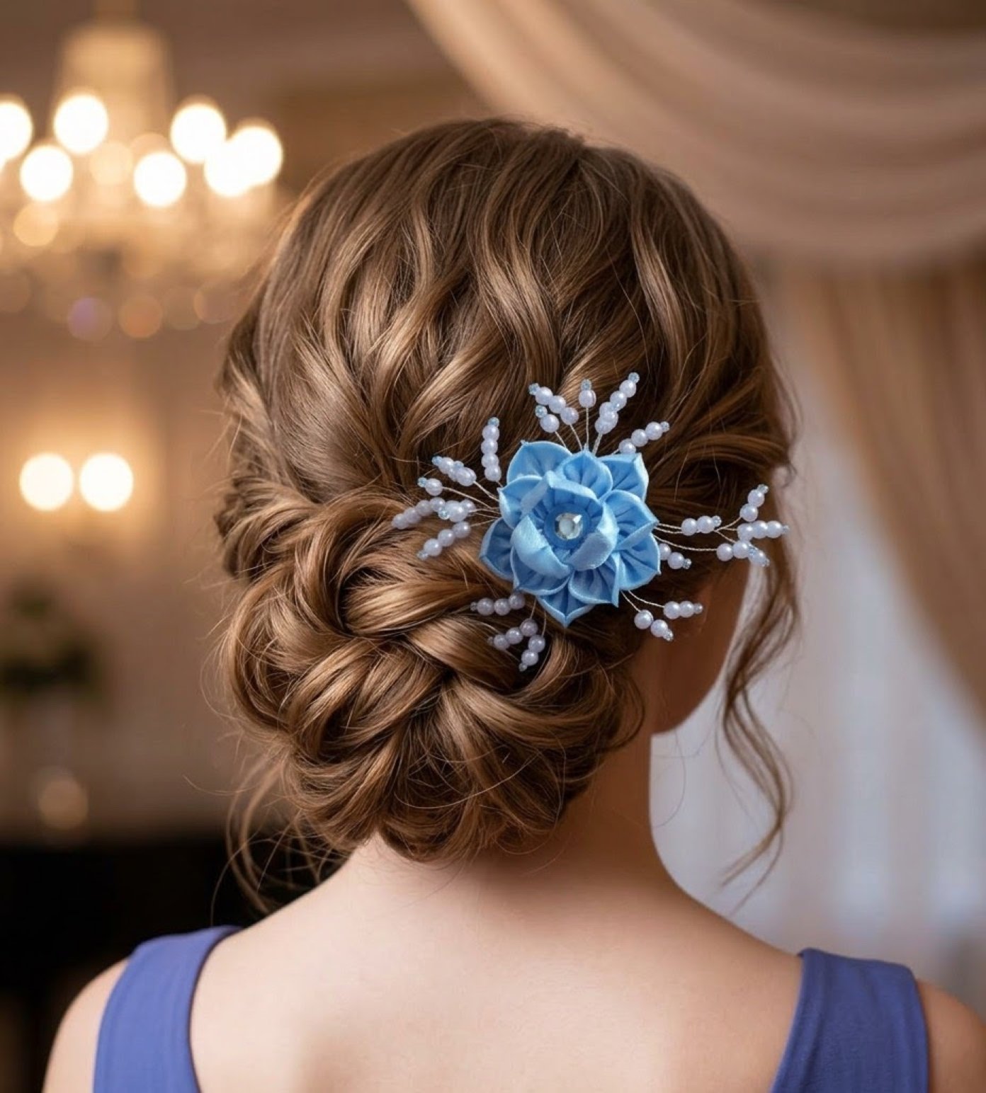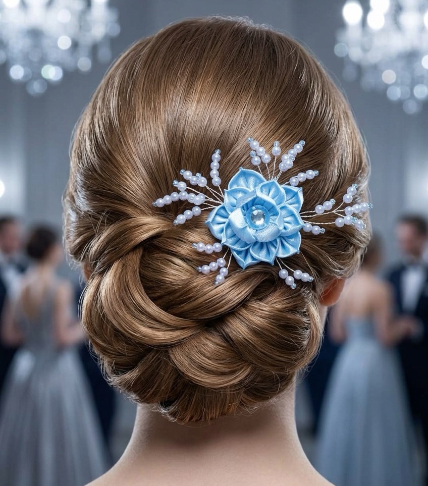 Svetlomodrý kvet, obklopený jemnými korálkami v rovnakej farbe, je elegantným doplnkom, ktorý dodá vášmu účesu nádych nežnosti a štýlu.