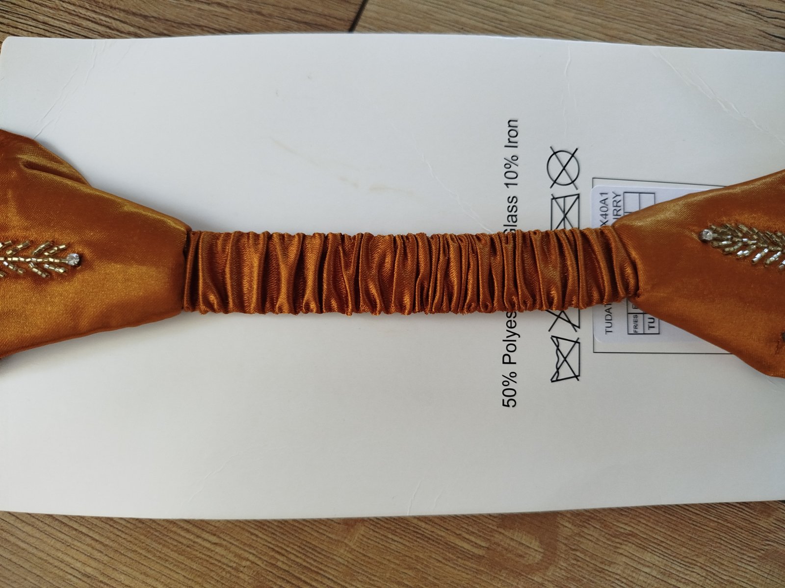 Predám krásnu, ručne zdobenú čelenku v sýtej horčicovej farbe. Je vyrobená z jemného, lesklého materiálu (pravdepodobne zmes polyesteru, ako je naznačené na štítku), ktorý je príjemný na dotyk. Ozdobená je striebornými korálkami v tvare lístkov a trblietavými kamienkami, ktoré dodávajú čelenke elegantný a luxusný vzhľad. Gumičková časť zabezpečuje pohodlné nosenie a prispôsobenie. Ideálny doplnok na slávnostné príležitosti, svadby, plesy, alebo na oživenie každodenného outfitu. Bola oblečená iba raz, je ako nová, bez akýchkoľvek poškodení.