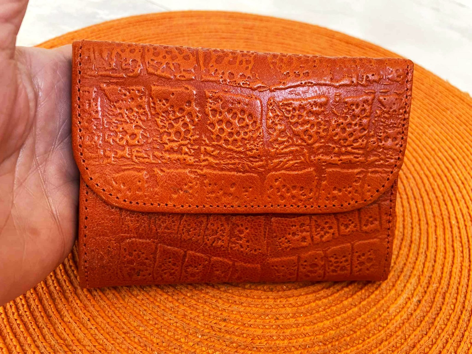 kožená peňaženka,13 x 10 cm, množstvo priehradok - viď foto,zipsík na drobné,farba prírodná hnedo pomarančová,plastický vzor,top stav
