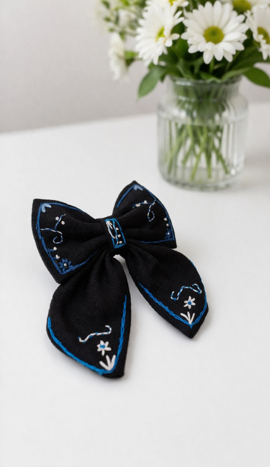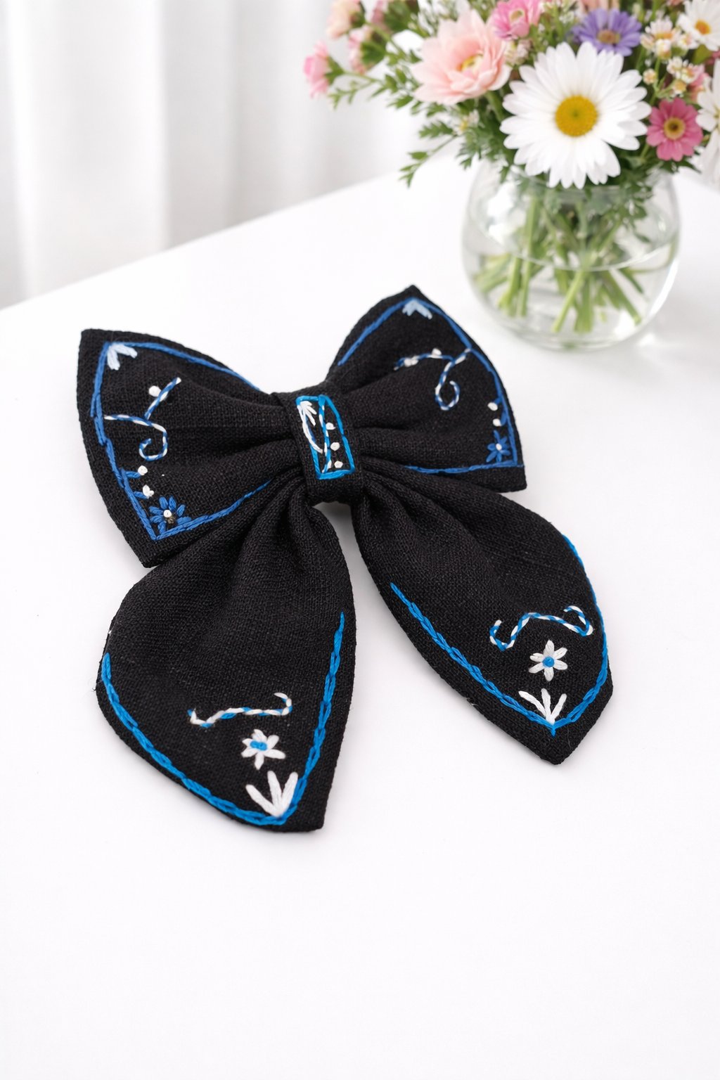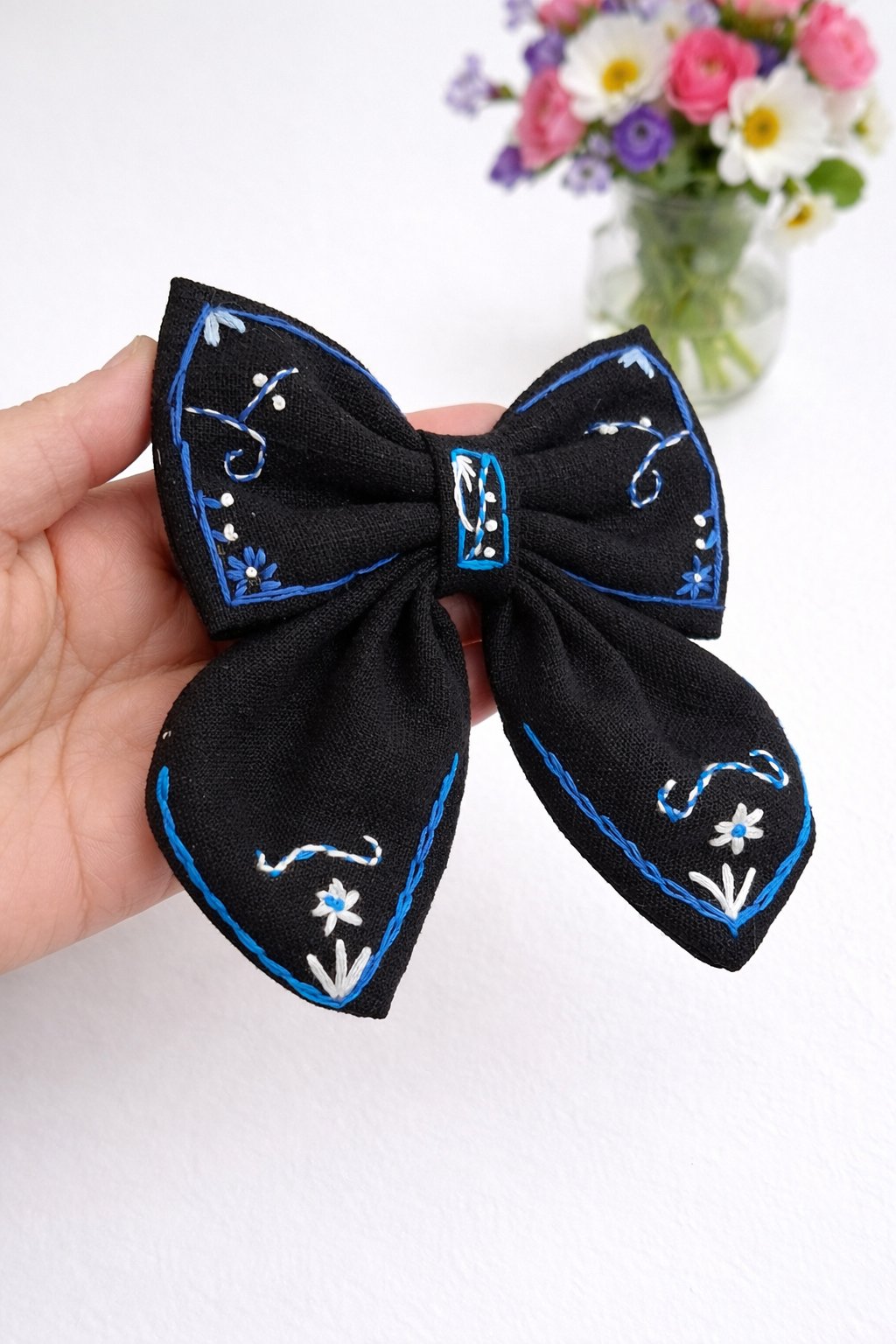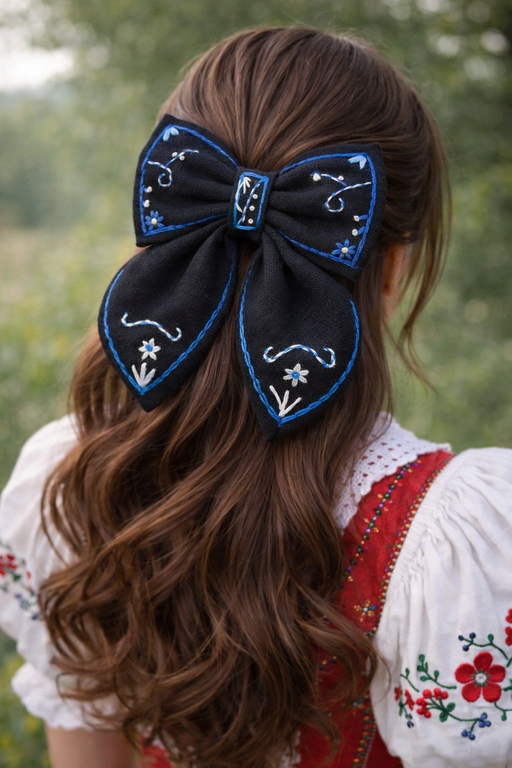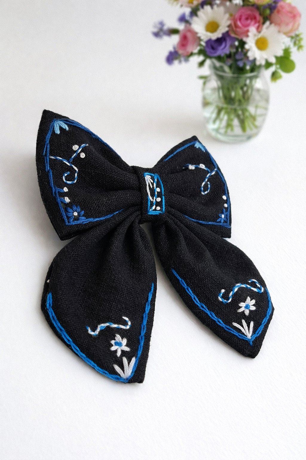 Ručne vyšívaná mašľa, ktorá krásne vynikne vo vlasoch a dodá outfitu niečo výnimočné ✨