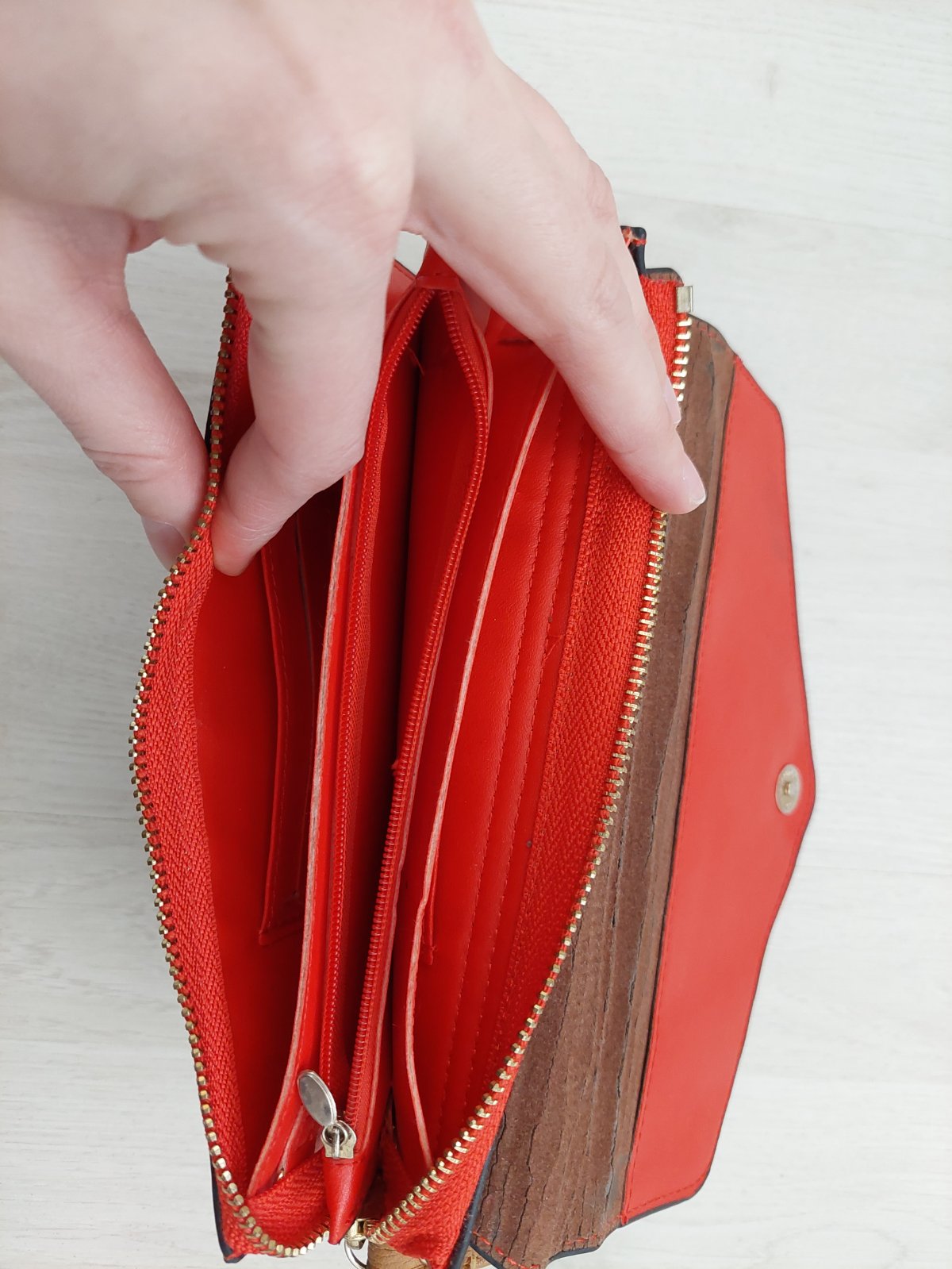 Peňaženka má dva normálne priehrady a jednu tenkú, usprostred priestor na mince, a priehradky na karty. Peňaženka bola použitá len raz, pre mňa je malá. Výška 9,50 cm Šírka 19cm