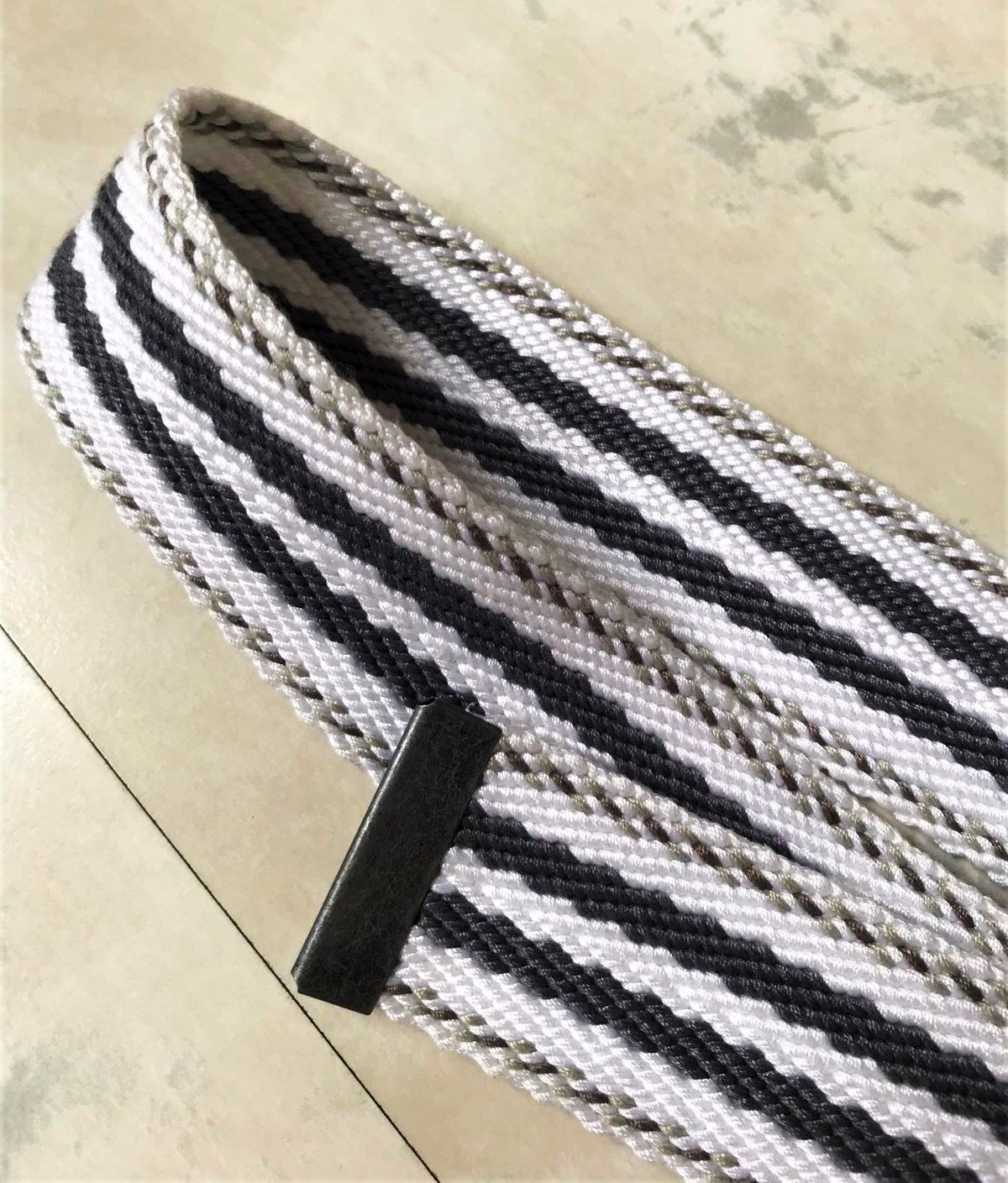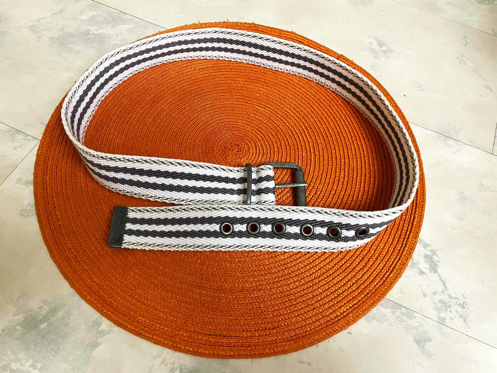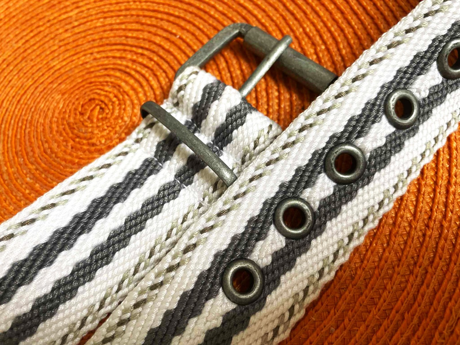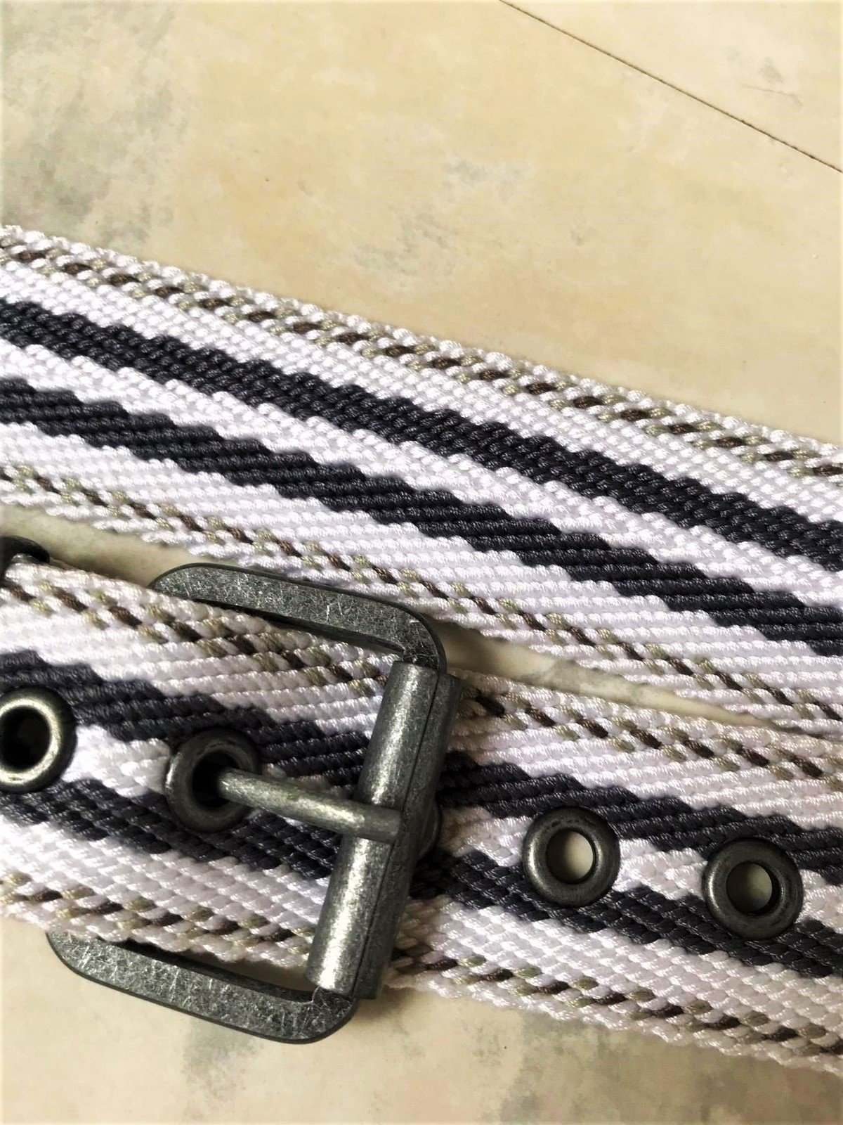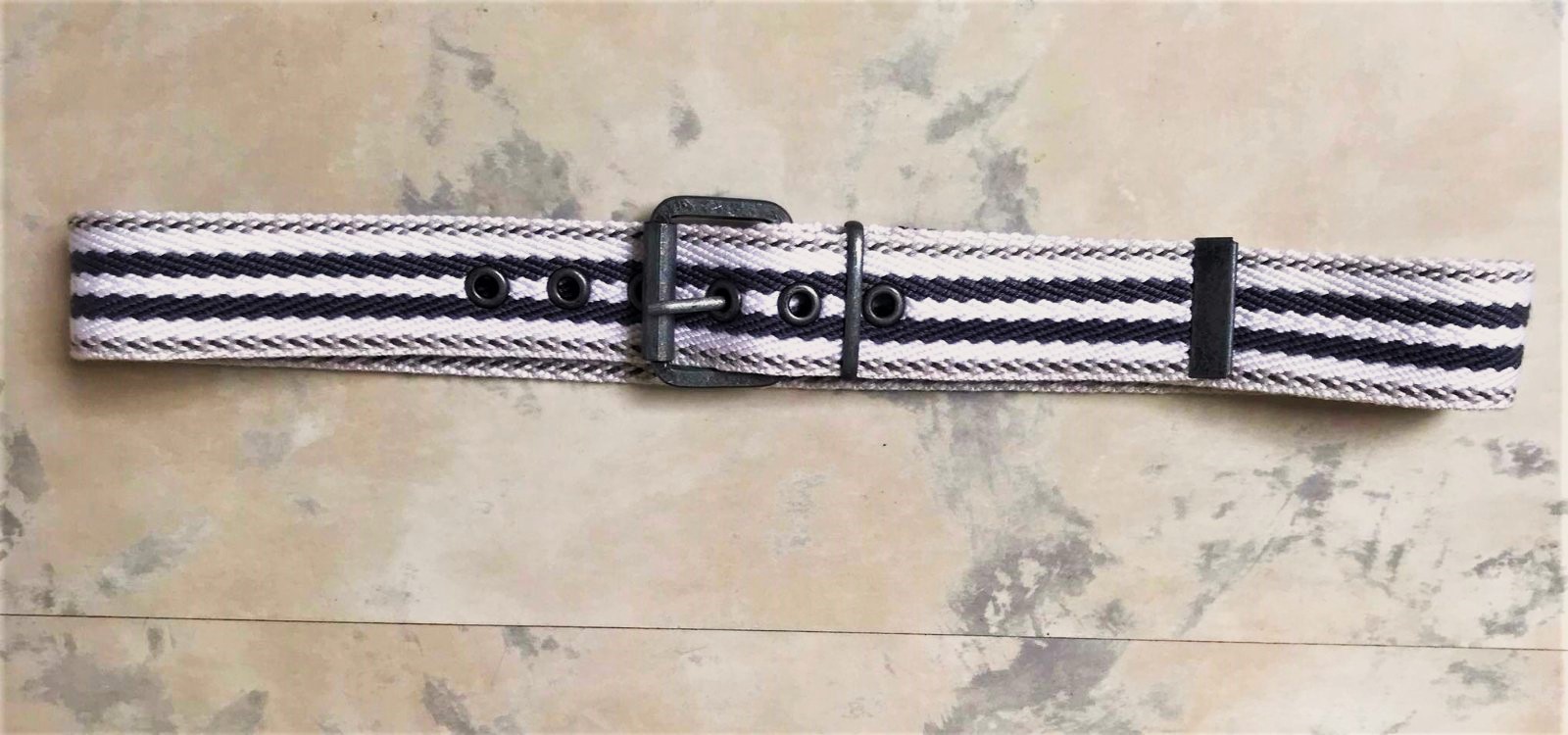 neznosený ,kvalitný unisex moderný opasok,dlžka celkom = 97 cm - meraná plátenná časť,min. obvod vzhľadom na vybitú kovovú dierku = 88 cm,šírka = 4 cm