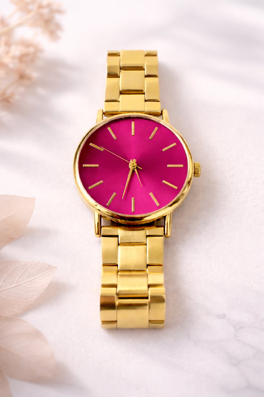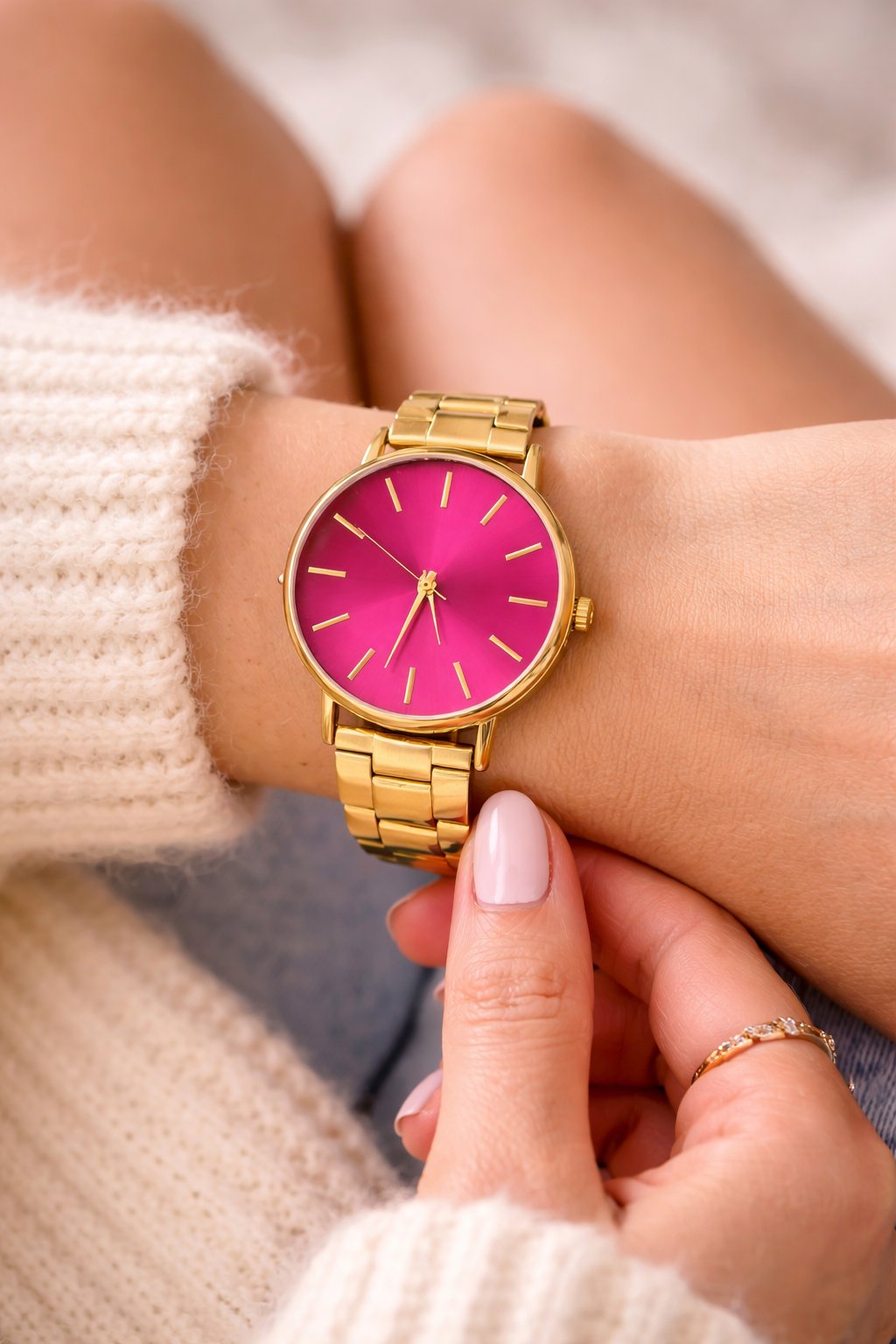 Hodinky s výrazným ružovým ciferníkom, ktorý pôsobí moderne a štýlovo. Sú plne funkčné a v dobrom stave, vhodné pre každého, kto hľadá pekný doplnok bez potreby investovať veľa.