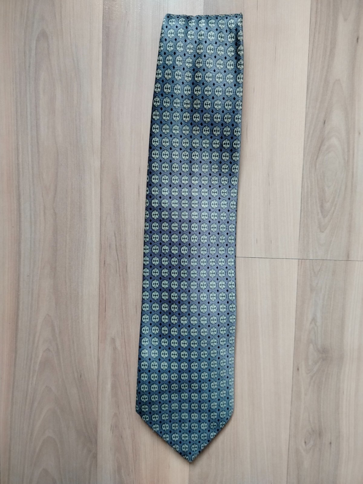 Predám peknú pánsku kravatu značky Fiotr (polyester 100%).Farba: šedá,modrošedá.Vzor: opakujúci sa zeleno-modrý "GG" monogram s čiernymi bodkami – lesklý, decentný luxusný look.Dĺžka 150 cm (štandard), šírka cca 8–9 cm.Stav výborný,minimálne nosená, bez škvŕn, dier, ošúchania (viď foto vrátane detailu štítku "Fiotr®").Skvele sa hodí k business oblekom, šedým,sivým sakám, na formálne príležitosti – pôsobí drahšie ako je.