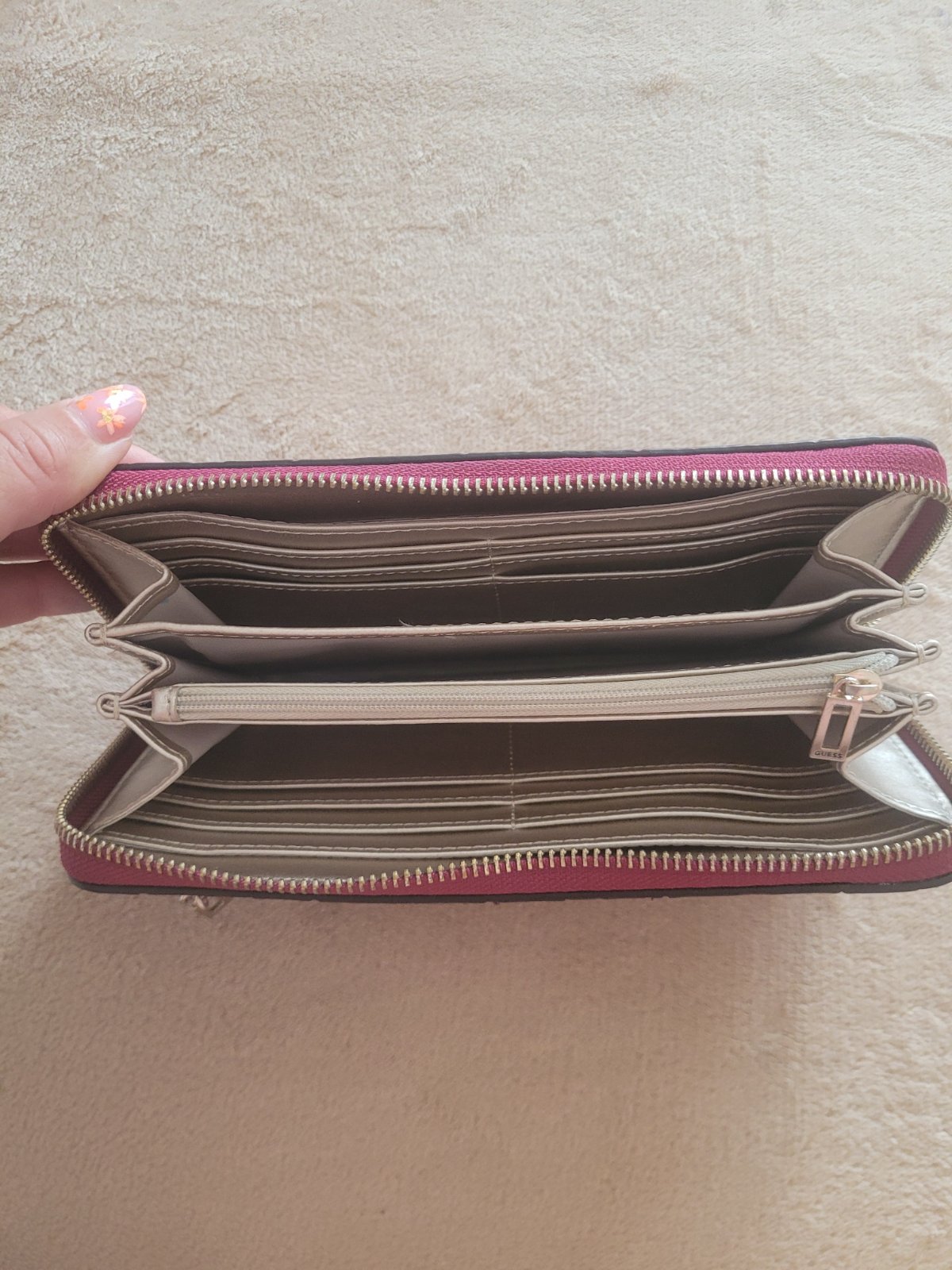 Pekná peňaženka Guess,používaná,mala trhlinka vnútri,nie je to pri používaní vidieť.Velka,prehľadná, lahka