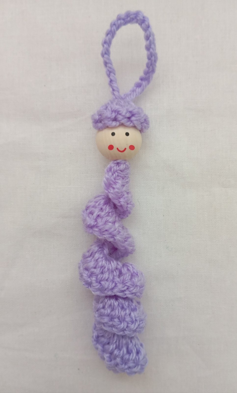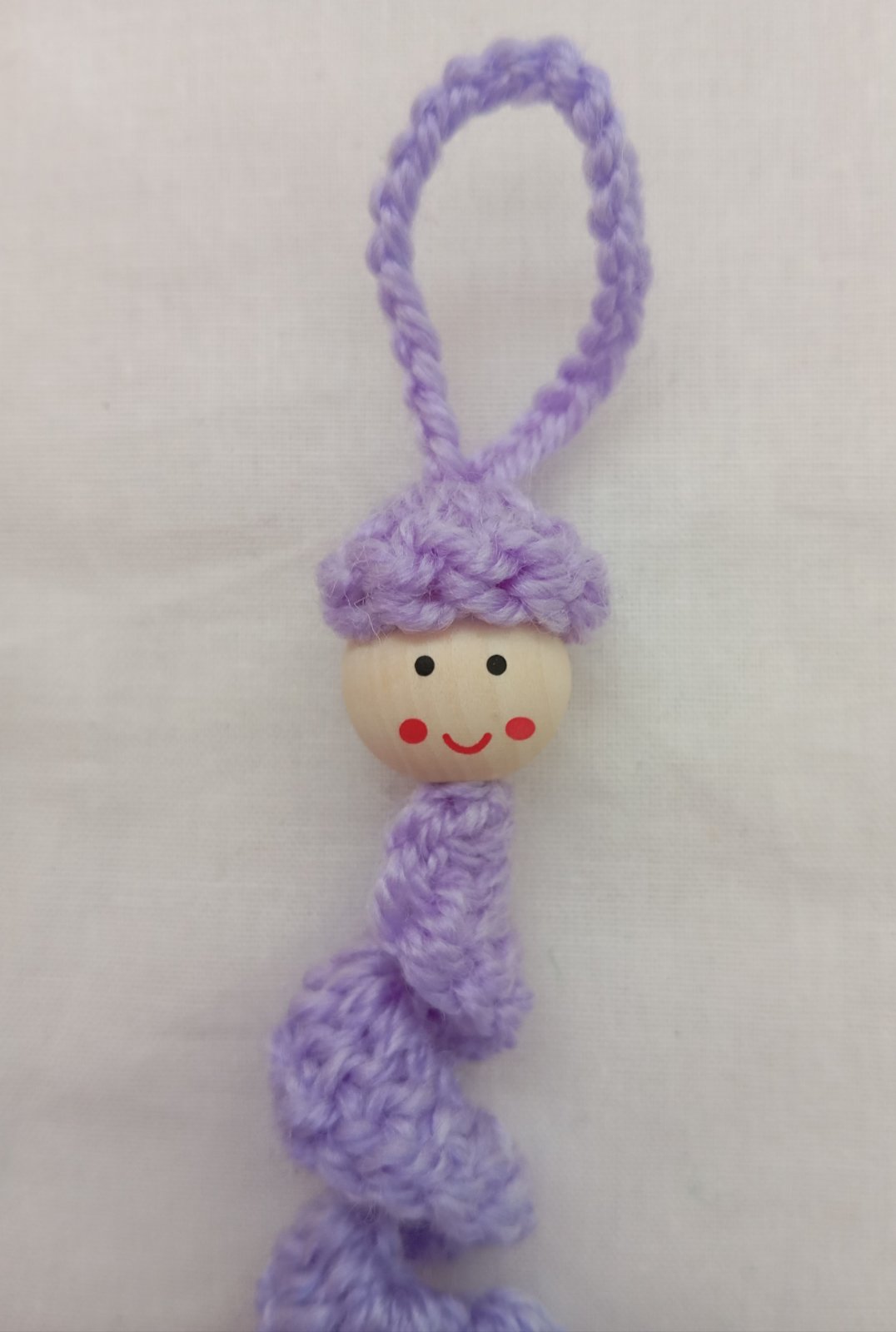 Milý, veselý prívesok fialová húsenička. Dĺžka od čiapky je 11 cm. Možné primontovať na krúžok a zavesiť napríklad na školskú tašku alebo kabelku.