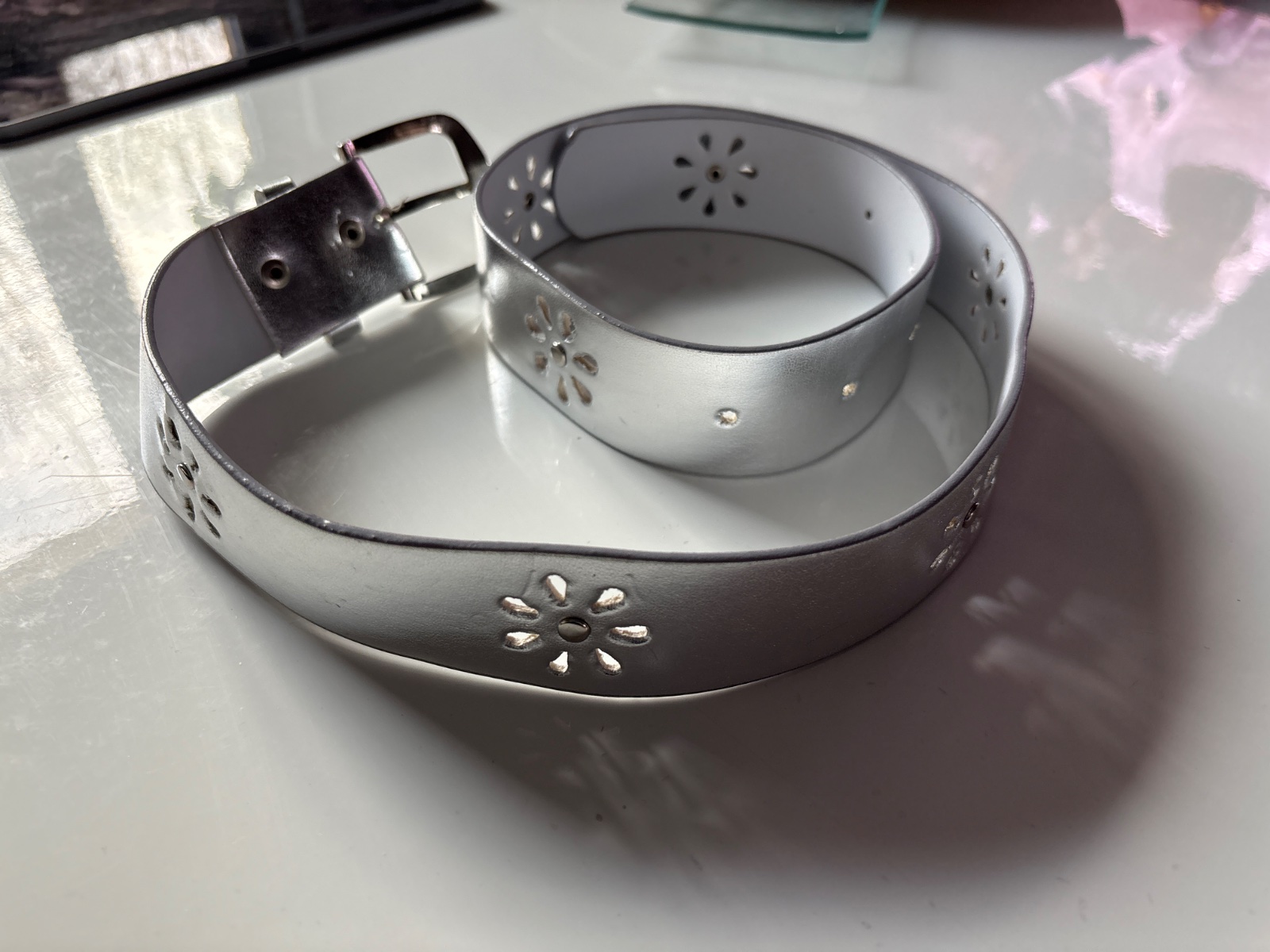 Veľmi pekný opasok striebornej farby s odleskami..veľkosť 55..cena bez pošty
