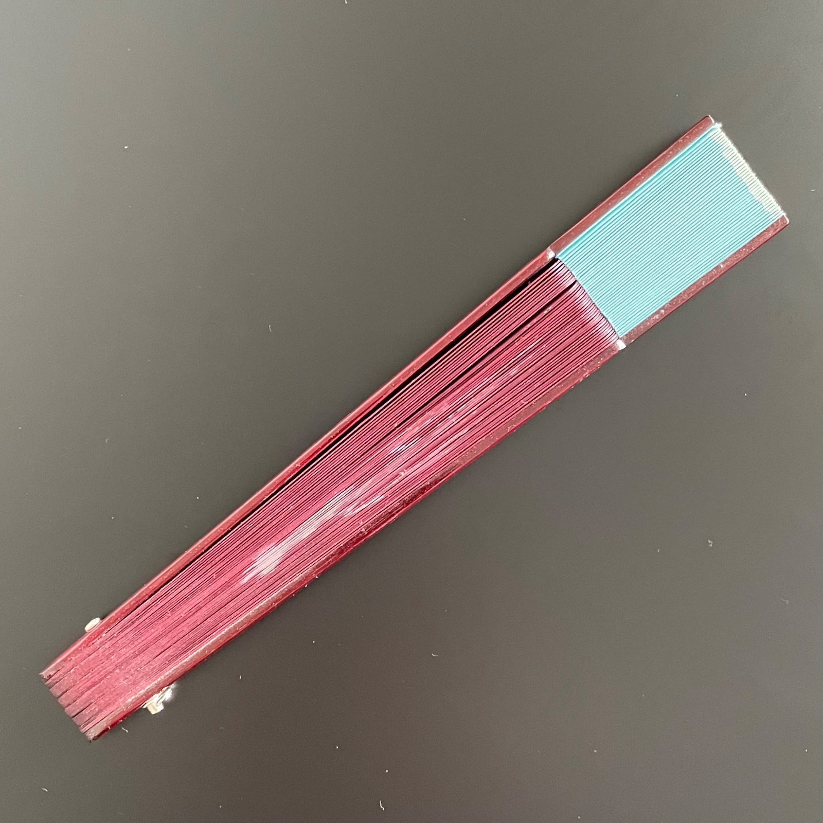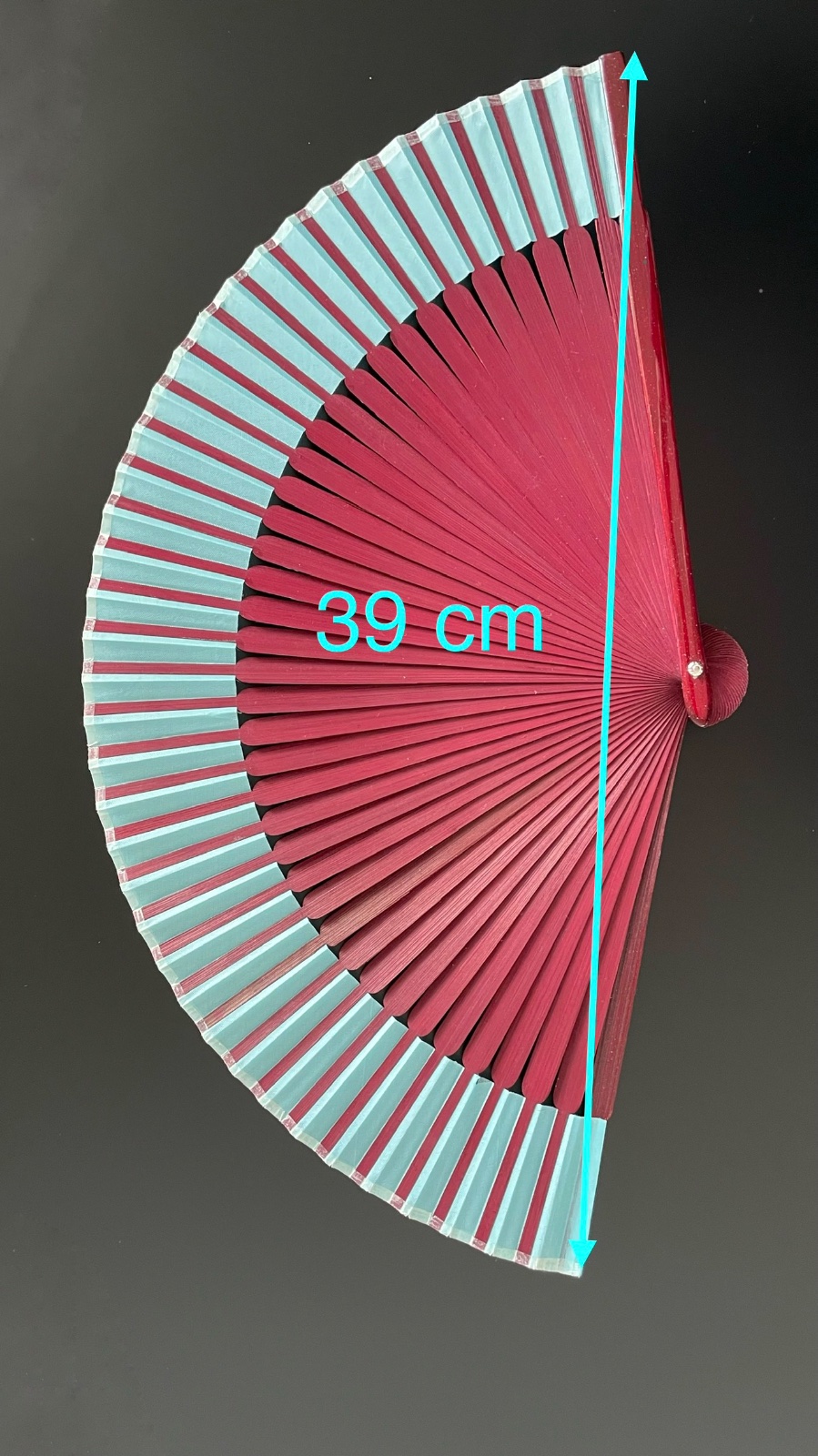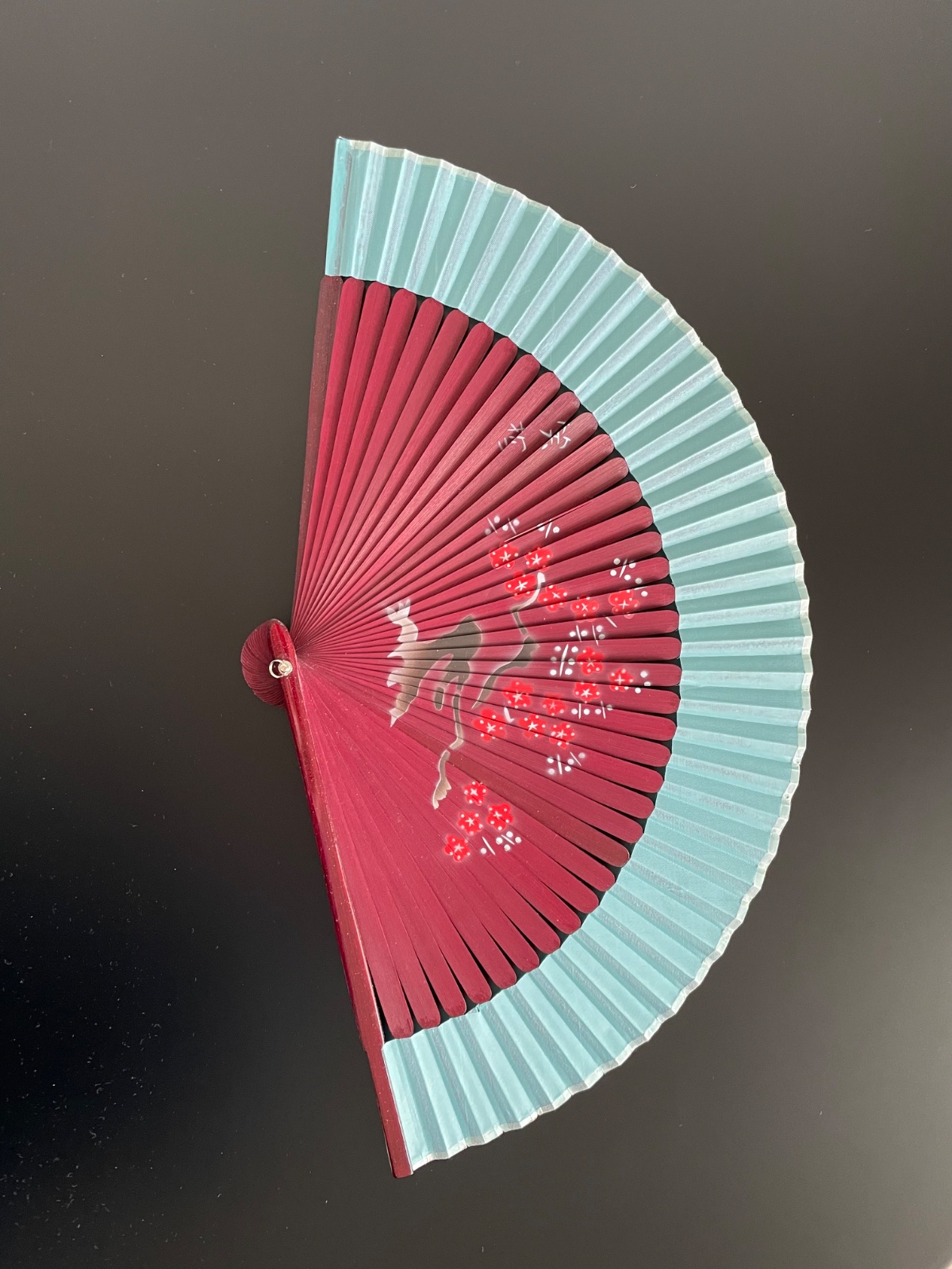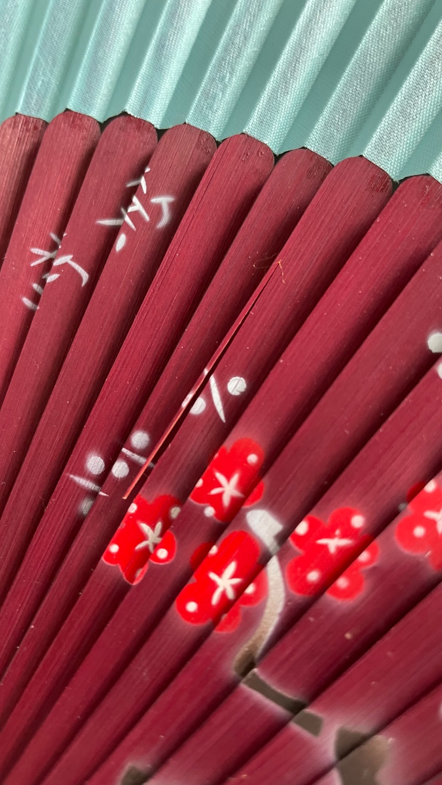 Predám červeno-hnedý vejár s tyrkysovým okrajom a čínskym/japonským motívom. Rebrá z dreva, vonkajšie rebrá s trblietkami.