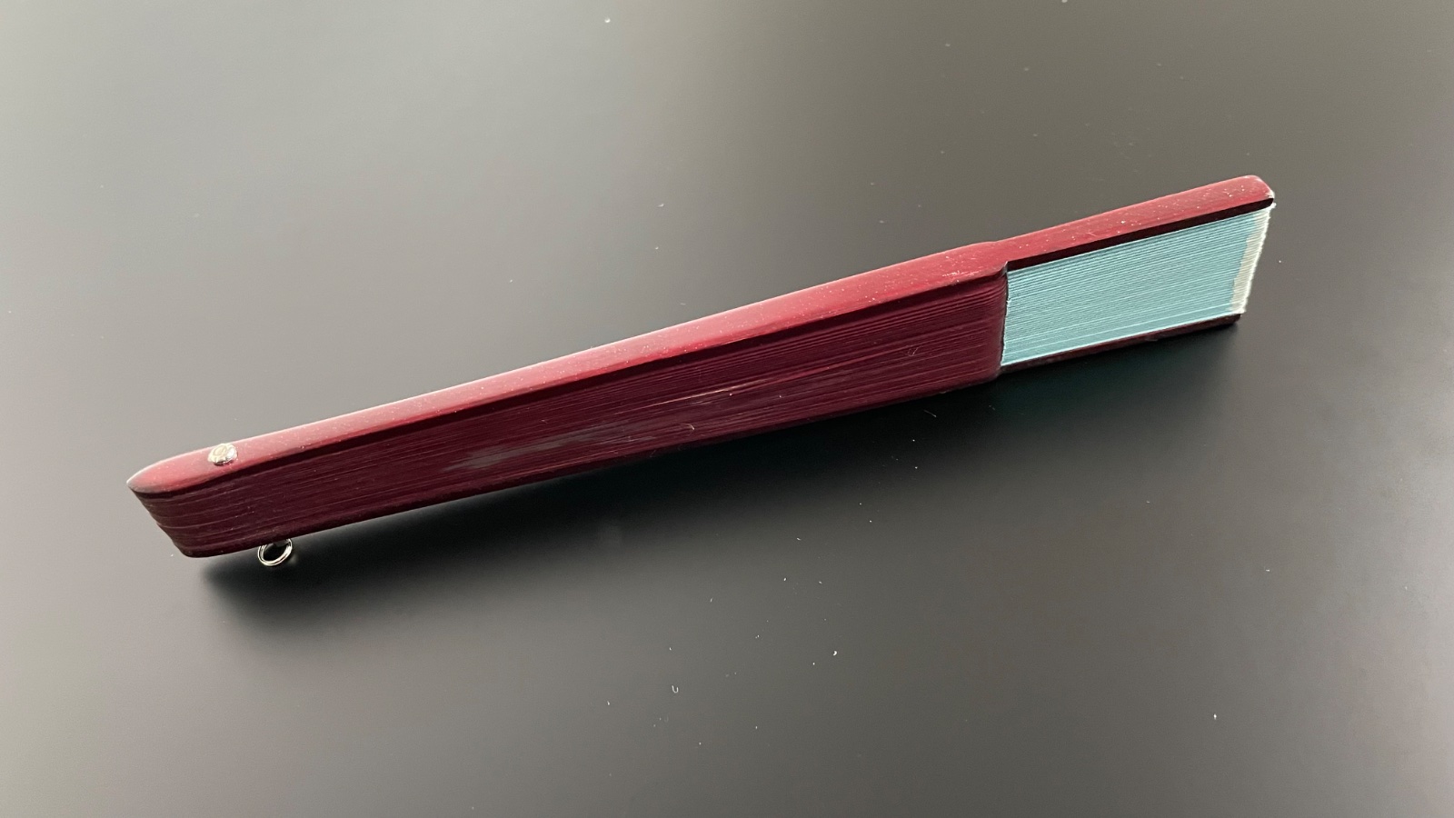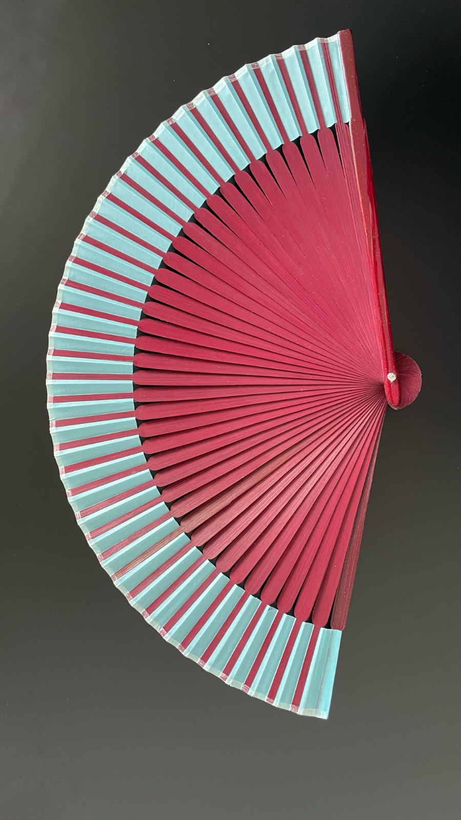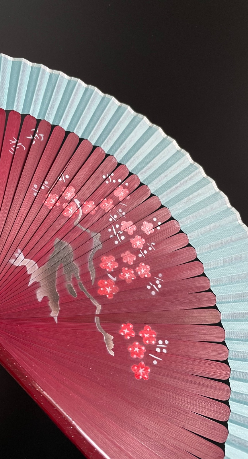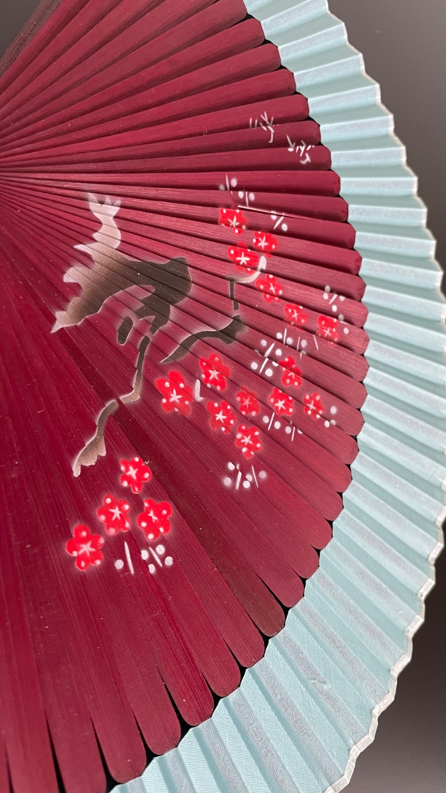 Predám červeno-hnedý vejár s tyrkysovým okrajom a čínskym/japonským motívom. Rebrá z dreva, vonkajšie rebrá s trblietkami.