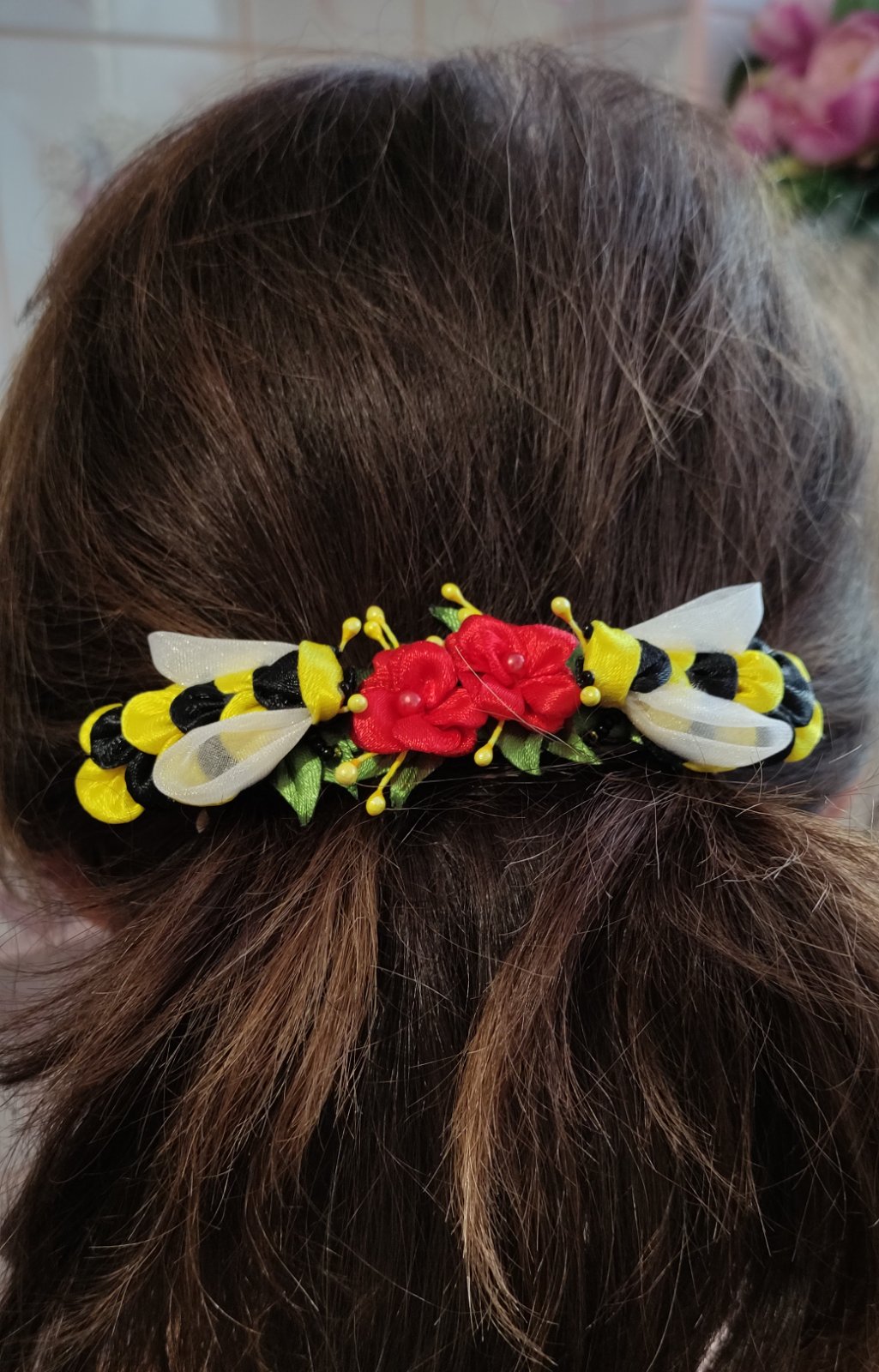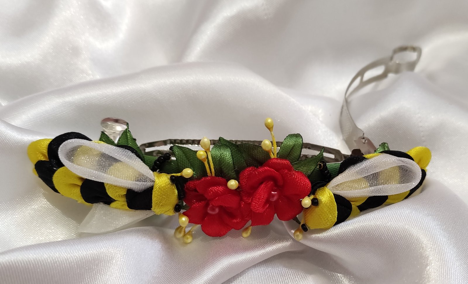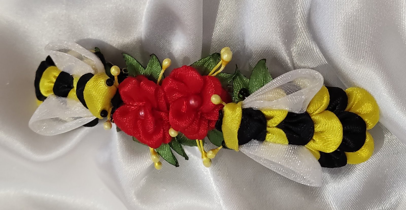 Roztomilé saténové včielky s modrými nezábudkami krásne kontrastujú so žltými tyčinkami. Na leto ako stvorená ozdobná spona do vlasov. Včielky s kvietkami sú upevnené na francúzskej spone, vďaka ktorej budú vlasy dobre držať pokope a zároveň budú pôsobiť bohatým dojmom. Vyhotovenie v rôznych farbách podľa želania.