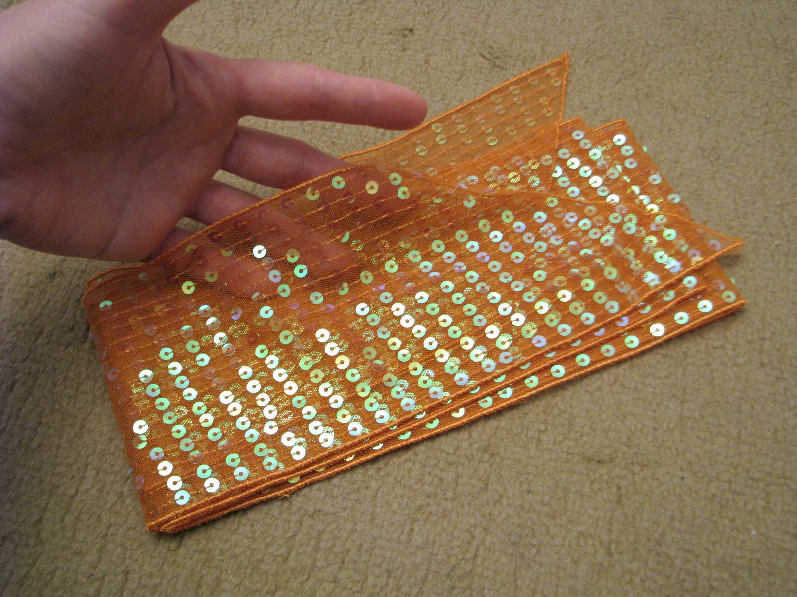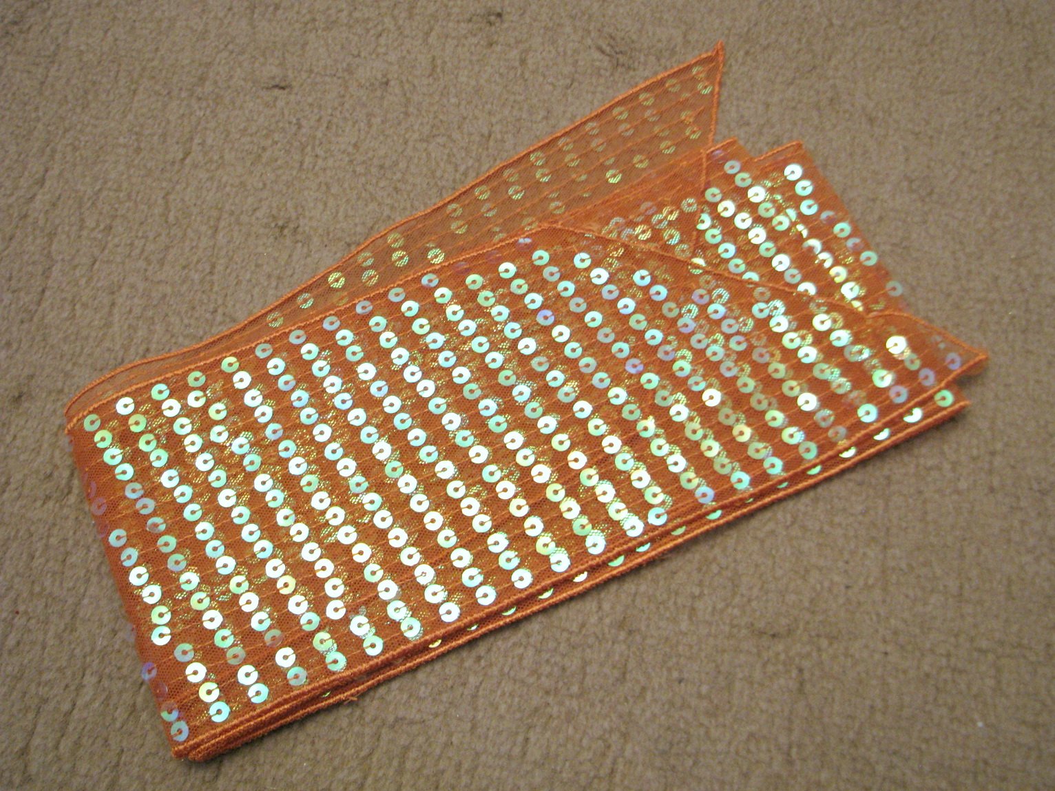 Dlhý transparentný oranžový dekoratívny opasok s farebne lesklými flitrami, na zaväzovanie. Dá sa použiť aj ako čelenka či mašľa, resp. podľa vašej fantázie. Bez poškodení. V prípade záujmu odmeriam.