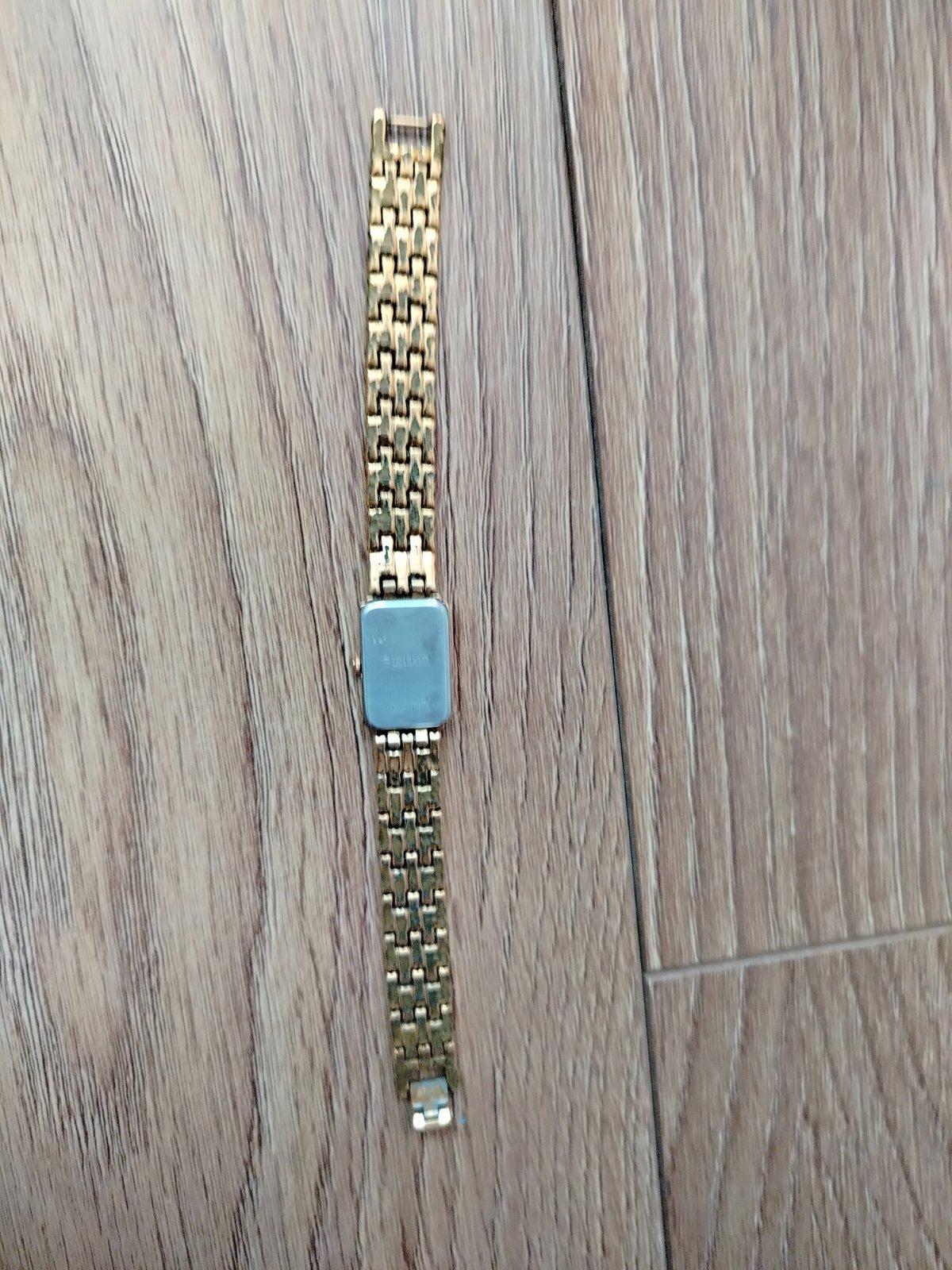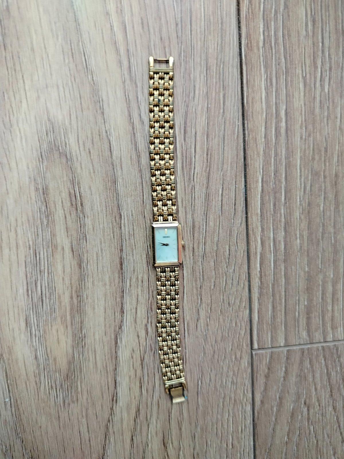 Obdĺžnikový (rectangular) 1,5x2cm, ciferník so svetlým číselníkom a jemnými čiernymi ručičkami. Zlatá kovová retiazka s pekným pleteným/mriežkovým vzorom (veľmi elegantný a pohodlný dizajn).