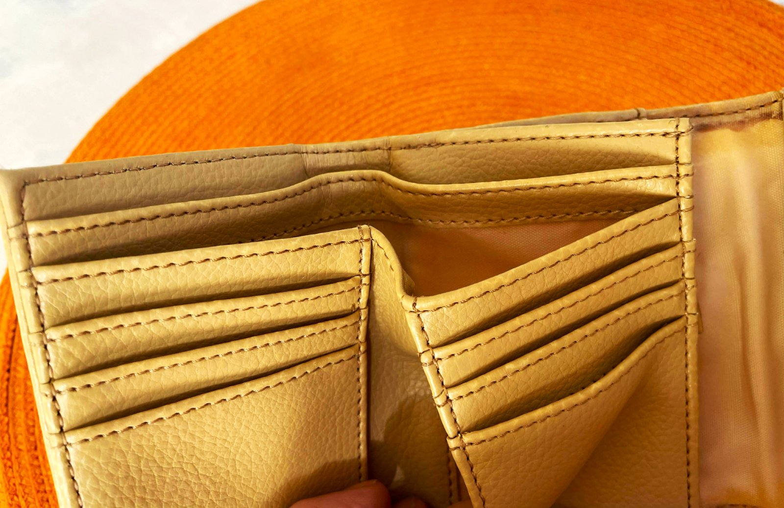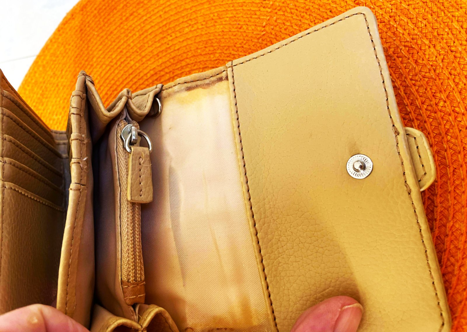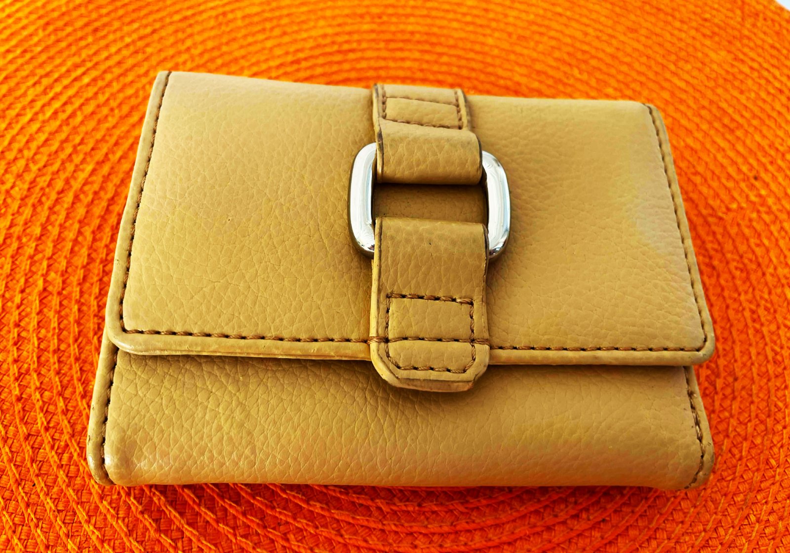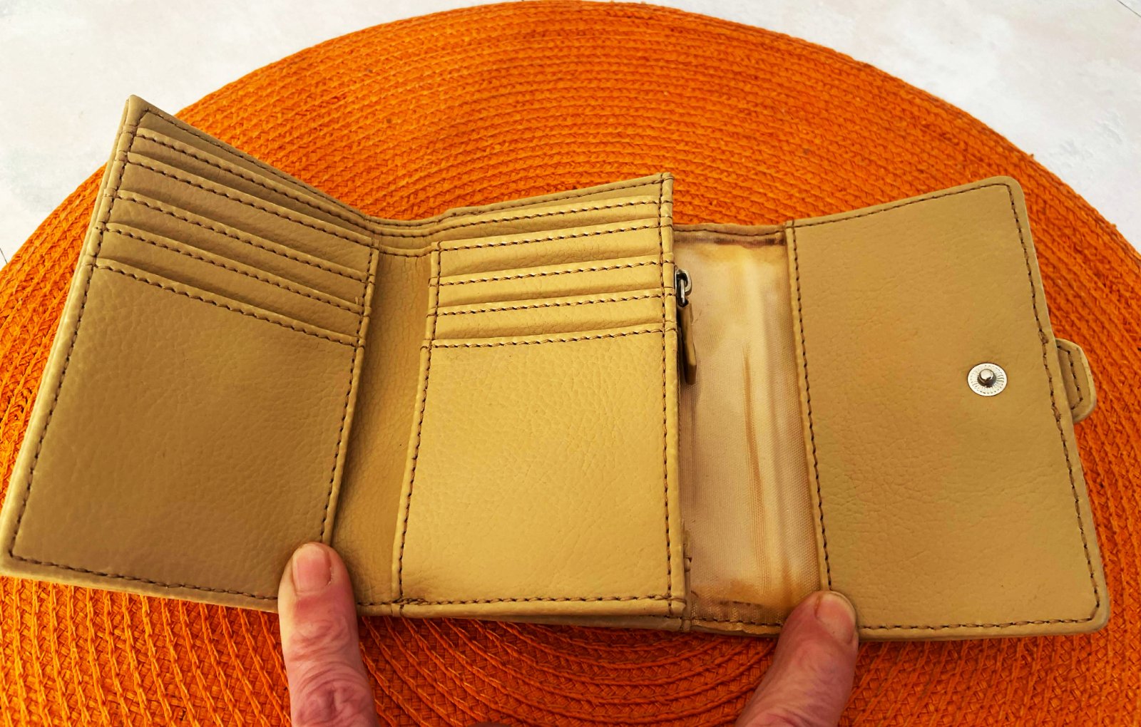 zachovalá,12 x 10 cm, vo vnútri sfarbené stopy od lepidla..nie je to zvoku vidieť.......s množstvom priehradok na karty a zipsíkom na drobné...