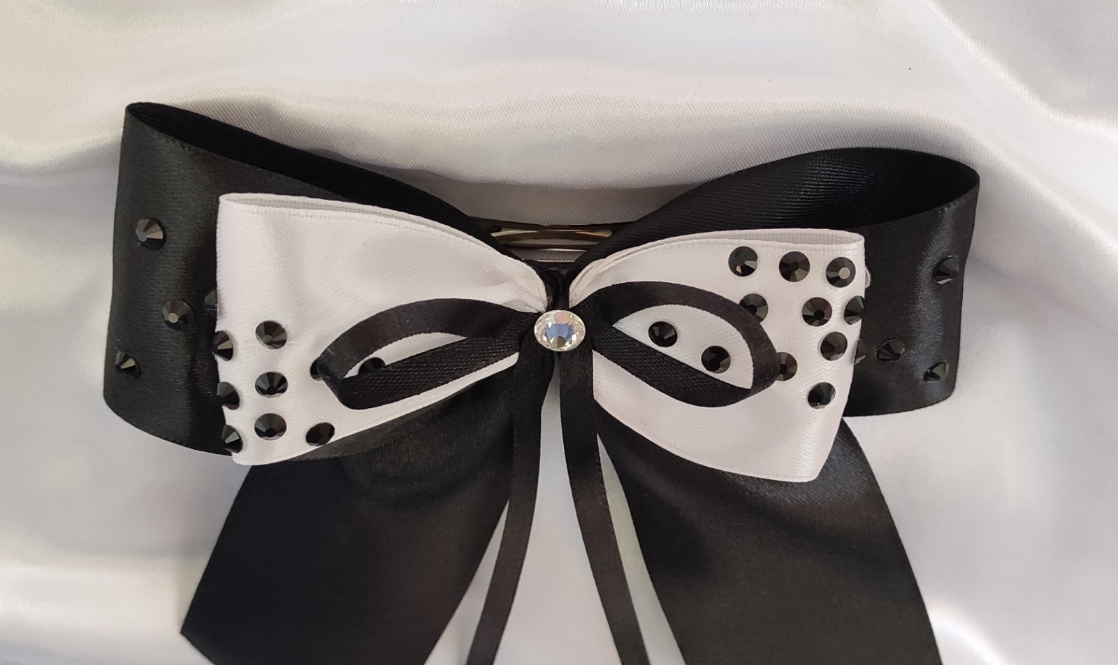 Biela časť mašle je ozdobená čiernymi ligotavými kamienkami, ktoré vytvárajú kontrastný a očarujúci efekt.