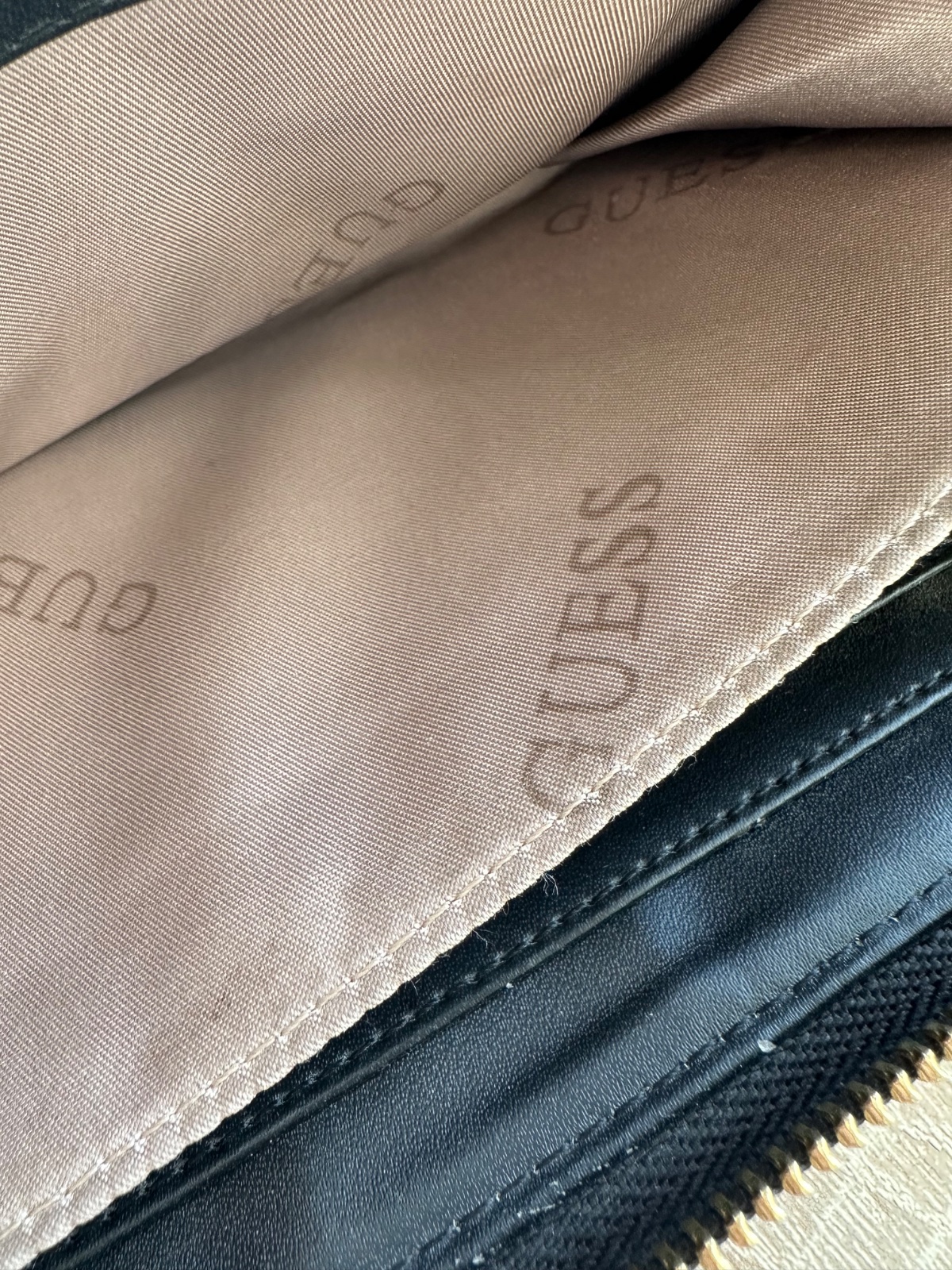 elegantná dámska peňaženka značky Guess čierna farba s jemným vzorom loga po celom povrchu výrazný kovový nápis GUESS vpredu – luxusný detail, ktorý zaujme, – mierne ošúchaný, no stále pôsobí štýlo...