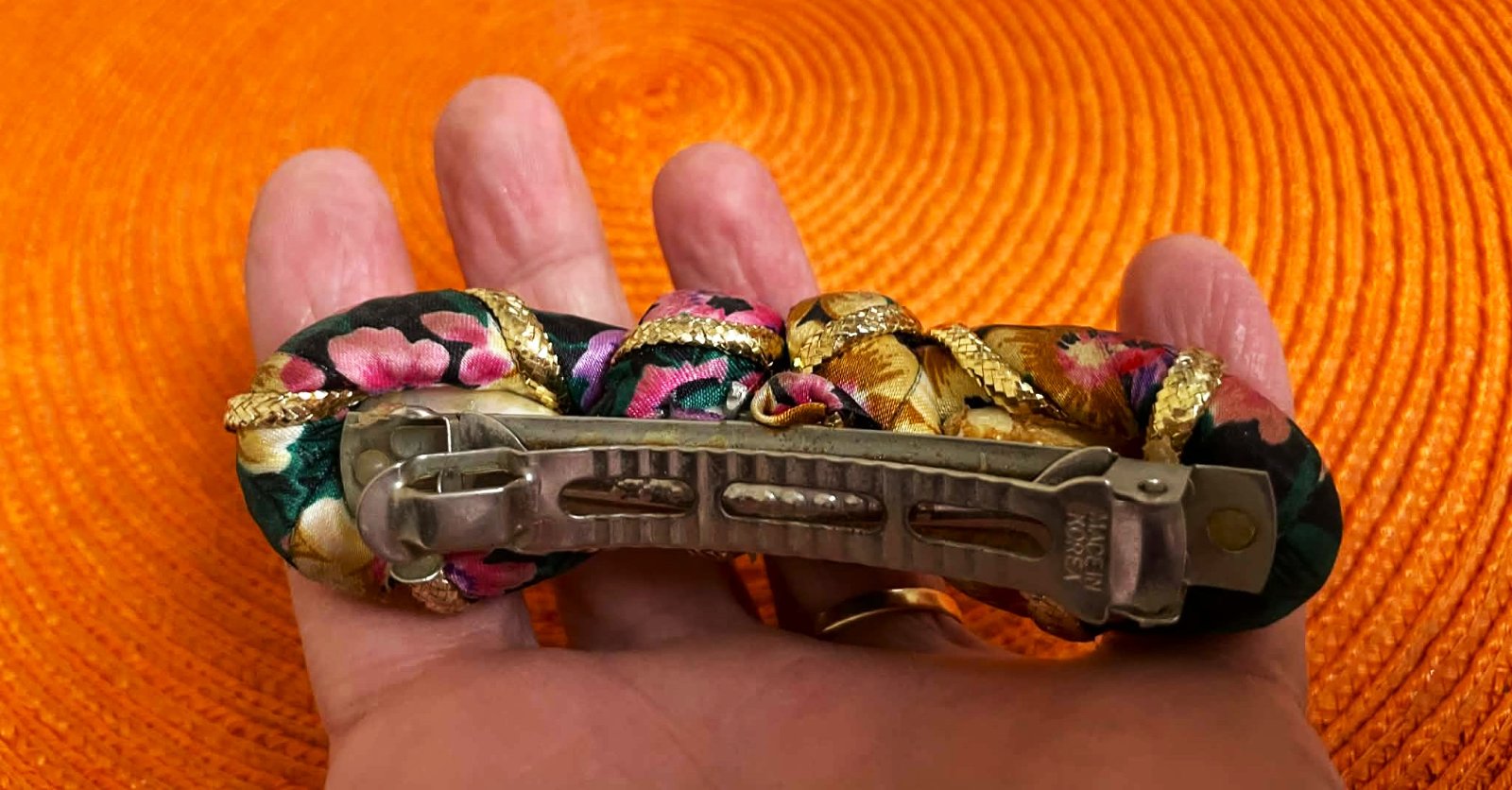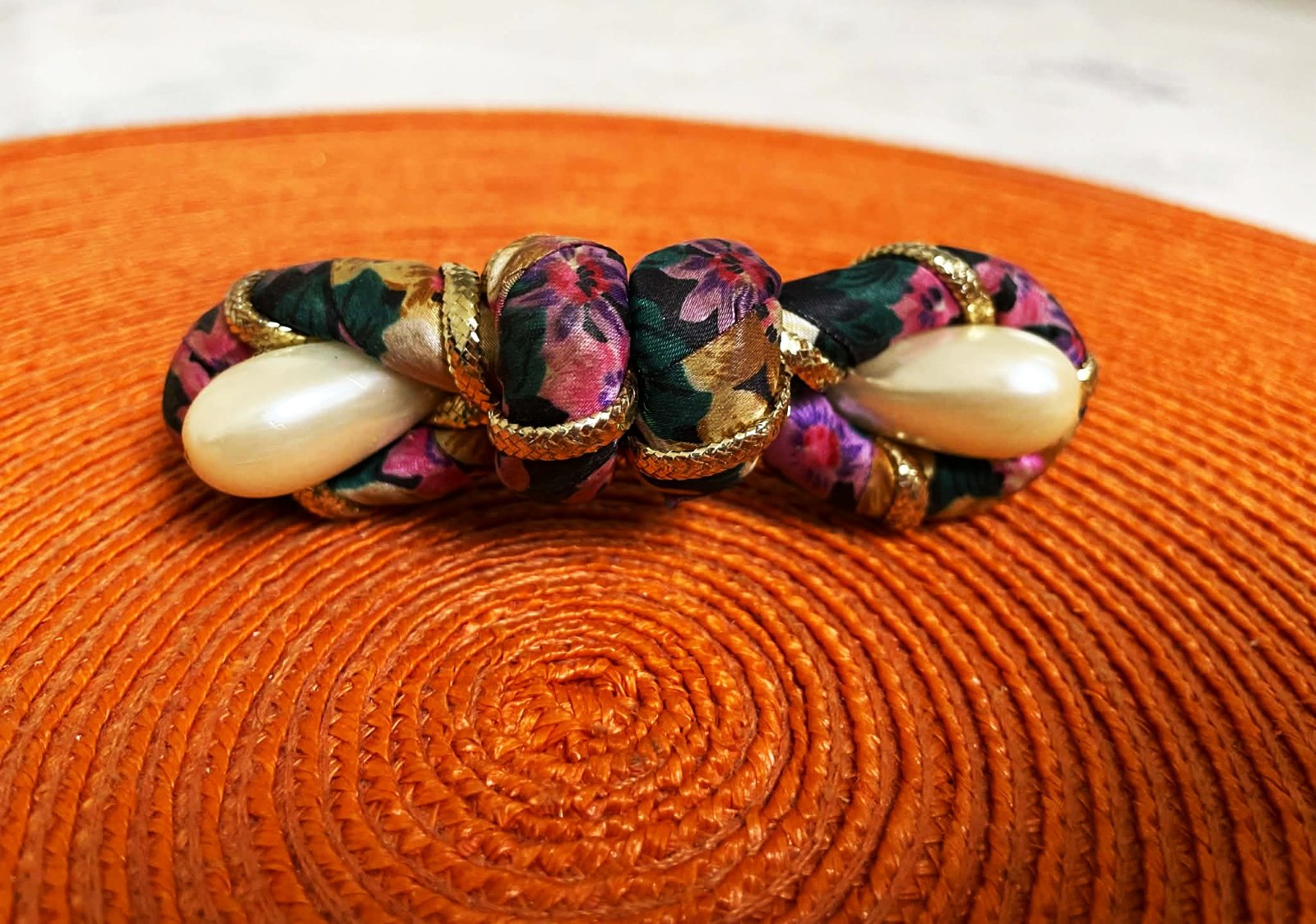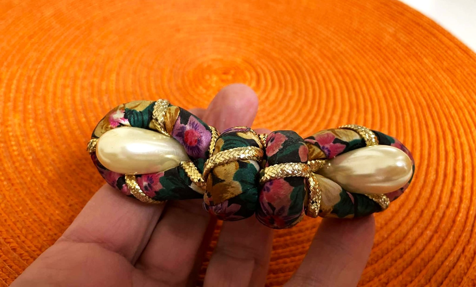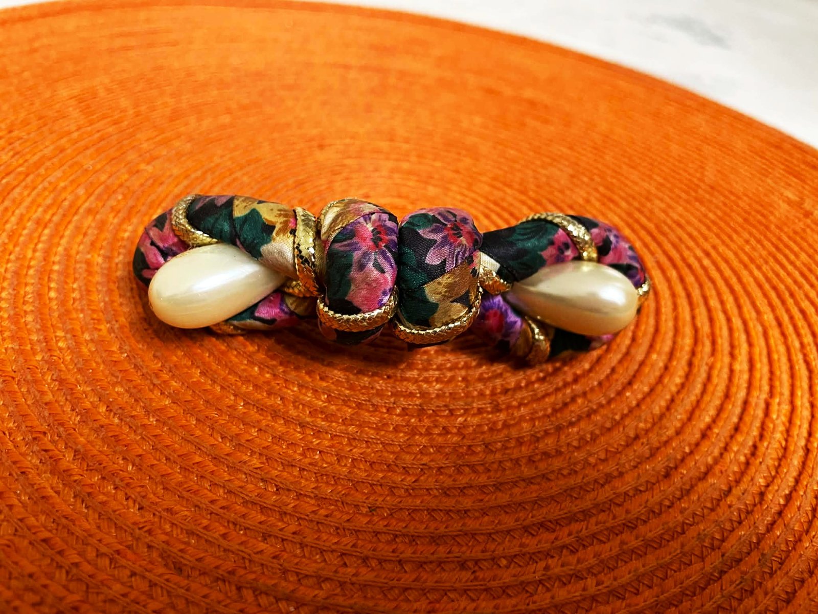 spona do vlasov s kvetinovým vzorom a imitáciou perál,na pevné upínanie,10 x 3 cm, je jemne do oblúka