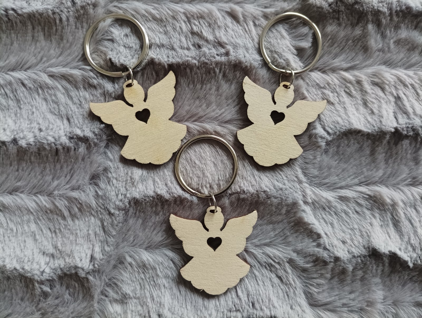 Prívesok na kľúče vyrobený z brezovej preglejky a s kolečkom na uchytenie.