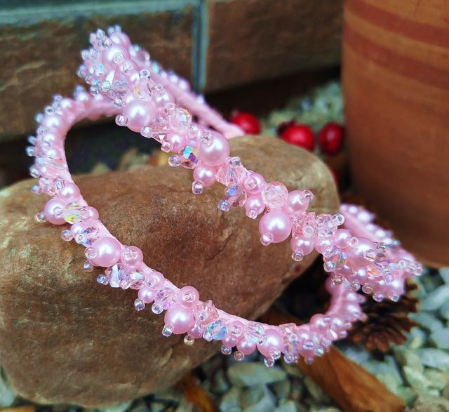 Prekrásna dvojradová čelenka je ručne vyšívaná ružovými perličkami a sklenenými brúsenými korálkami.
