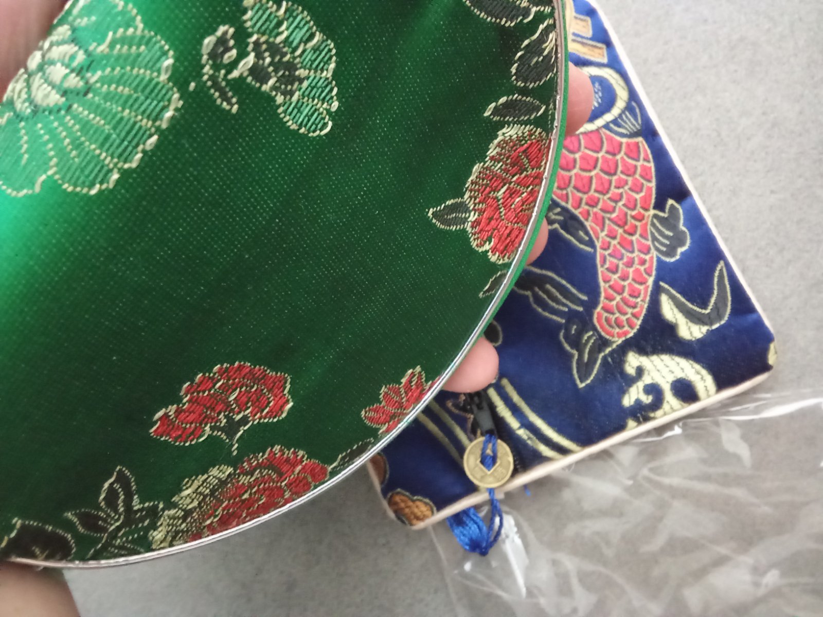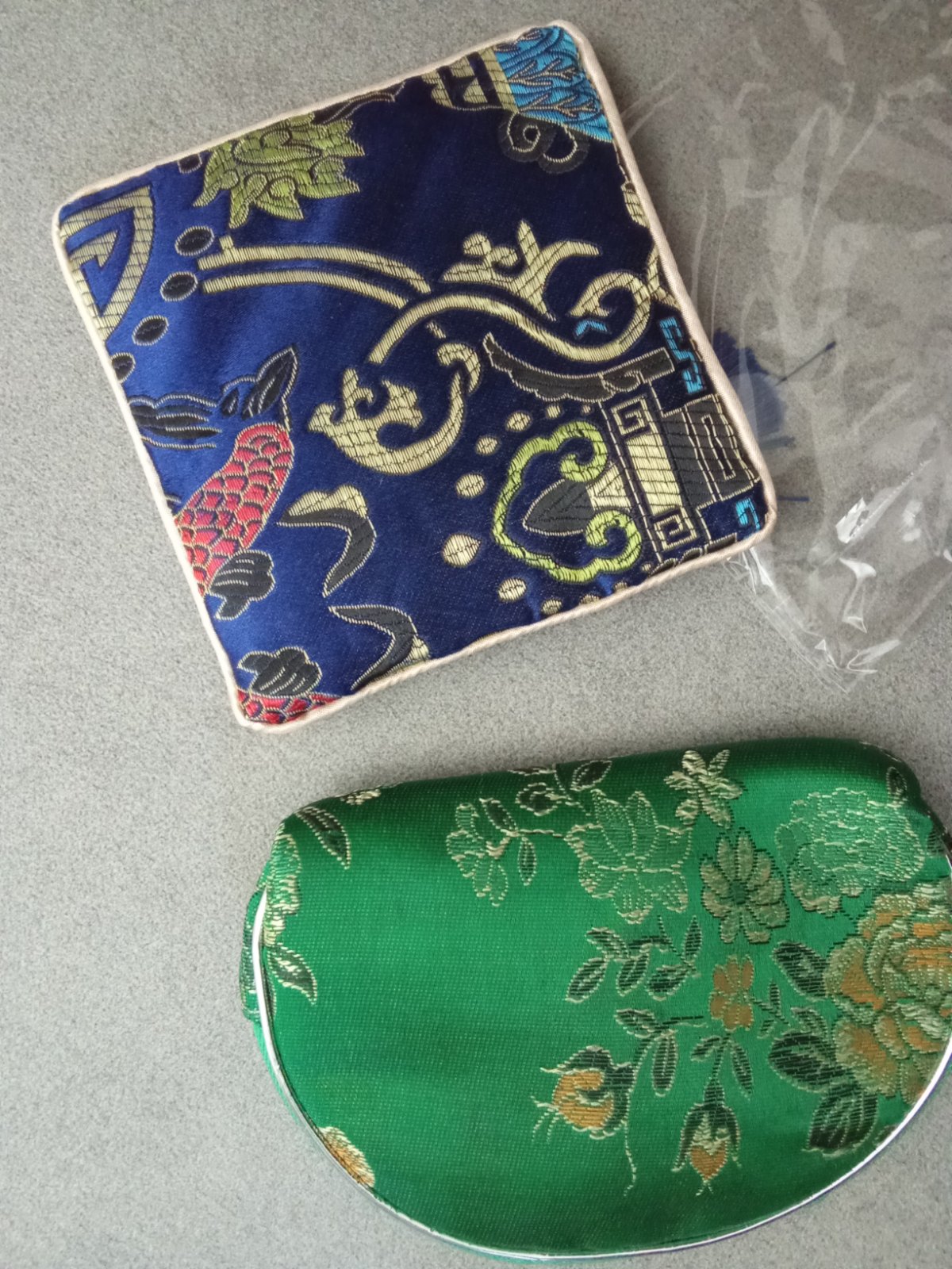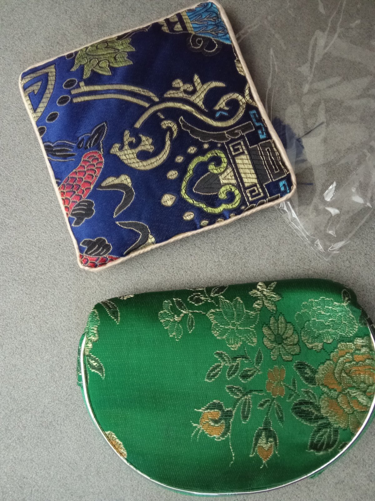 Vyšívané, Veľkosť 13 cm a 12,5 .cena spolu len na šperky prsteň alebo ako peňaženka popravde neviem na čo to je. Farba tmavozelená na foto je bledšia
