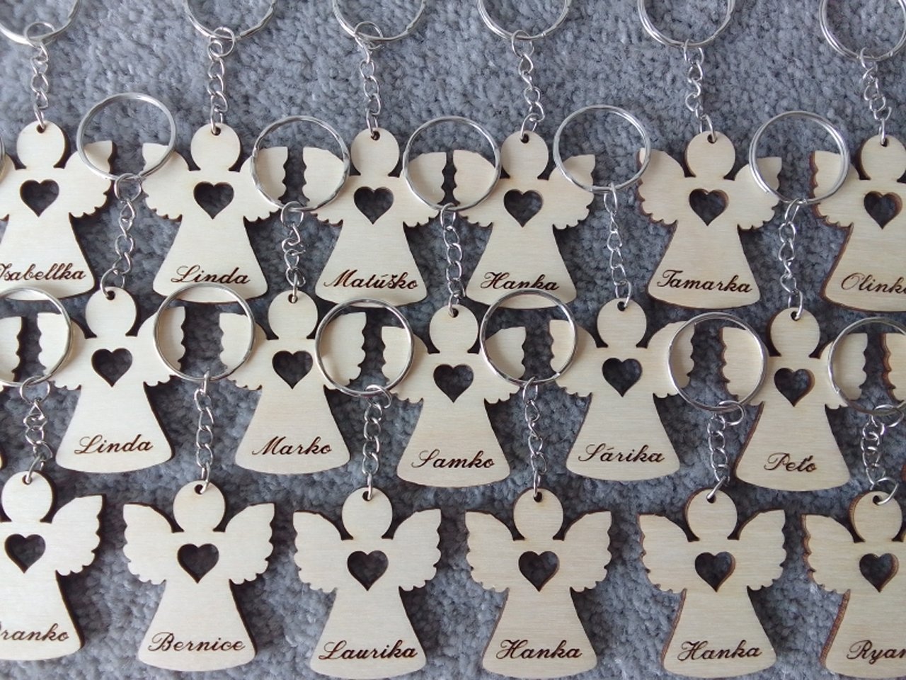 Prívesok na kľúče Anjelik s menom na želanie vyrobený z brezovej preglejky a s kolečkom na uchytenie.