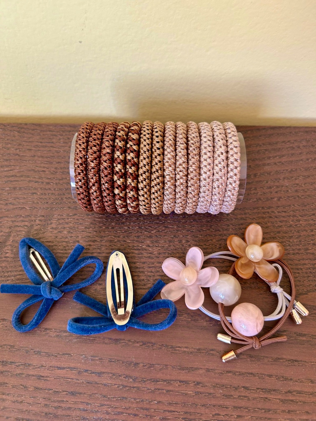 Predám elastické gumičky do vlasov 13 ks, 2 ks hnedý a ružový kvietok a 2 kusy pukačkové sponky modré zamatové mašličky.