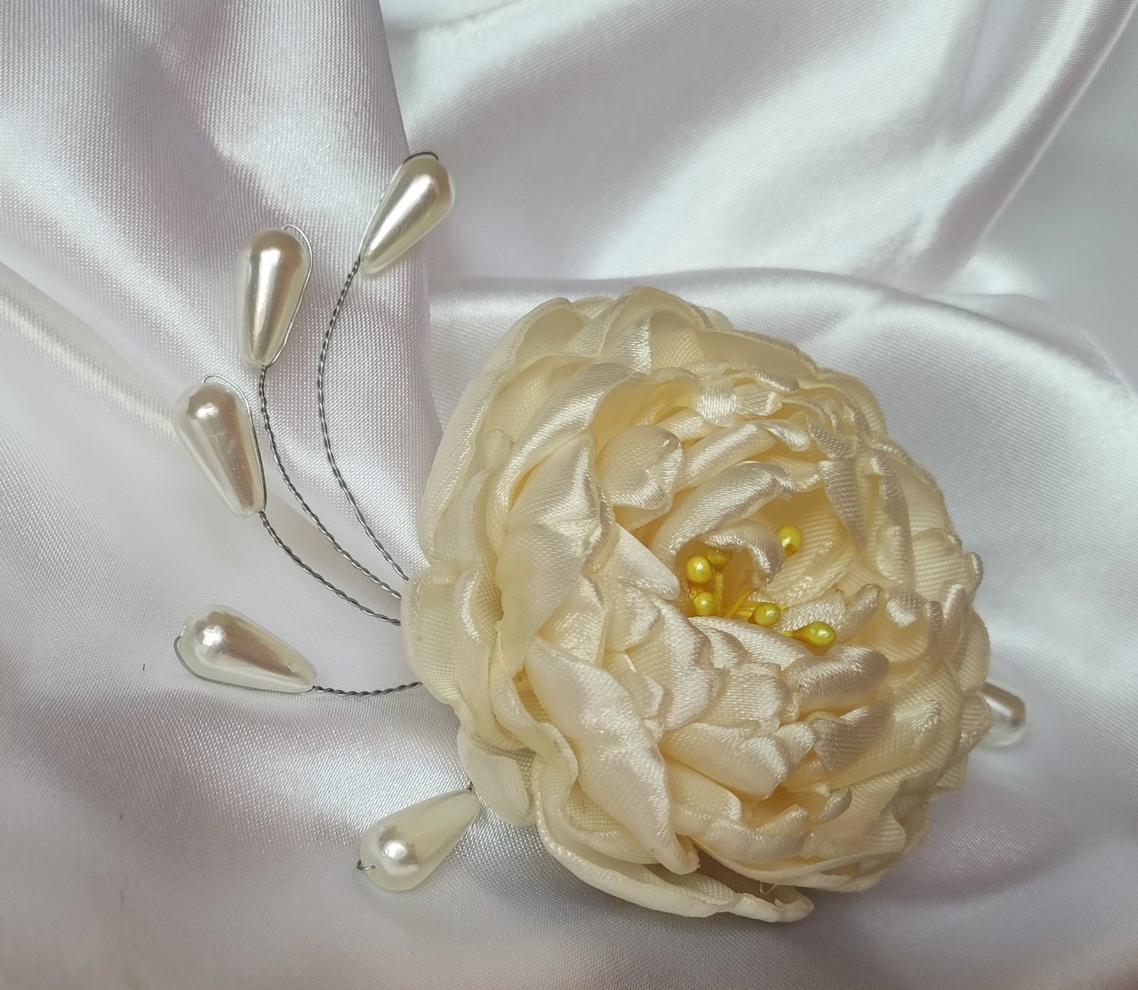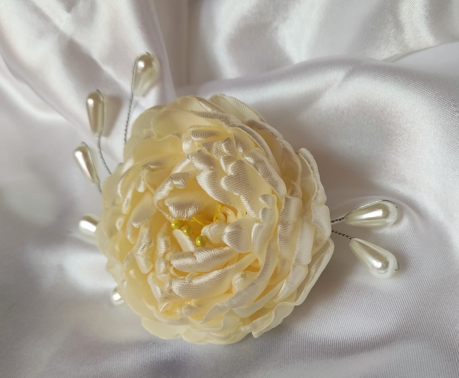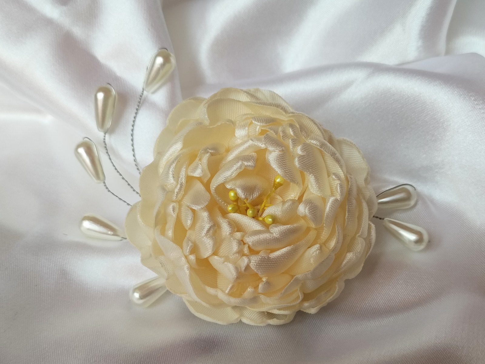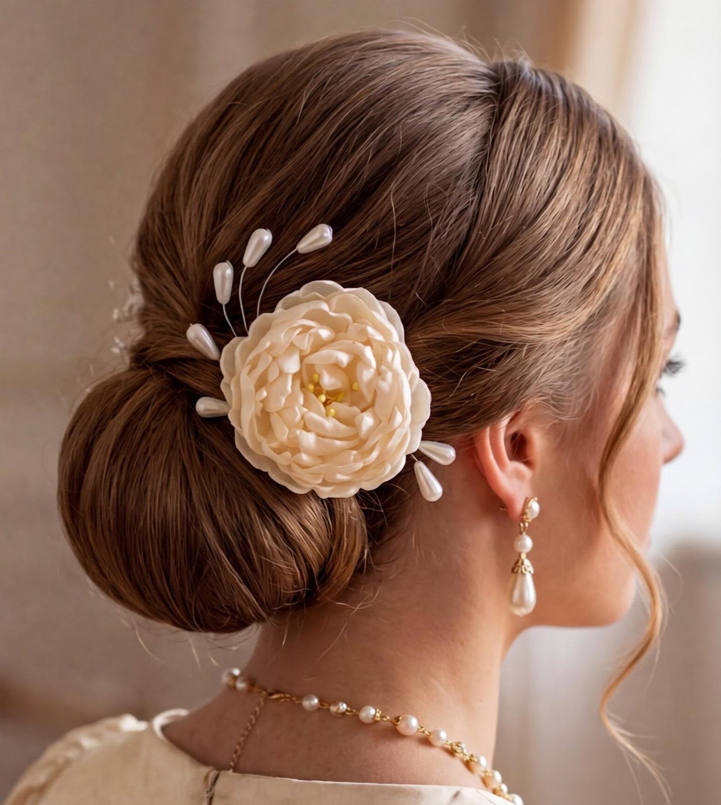 Na lupienky bohatá saténová pivónia s púčikmi dodá šmrnc blondýnkam, tmavovláskam či ryšavkám. Perličkové korálky, ako aj púčiky sa vďaka ohybným drôtikom dajú zapracovať do každého účesu. Vo vlasoch drží na malom štipci. Farba môže byť podľa vášho želania.